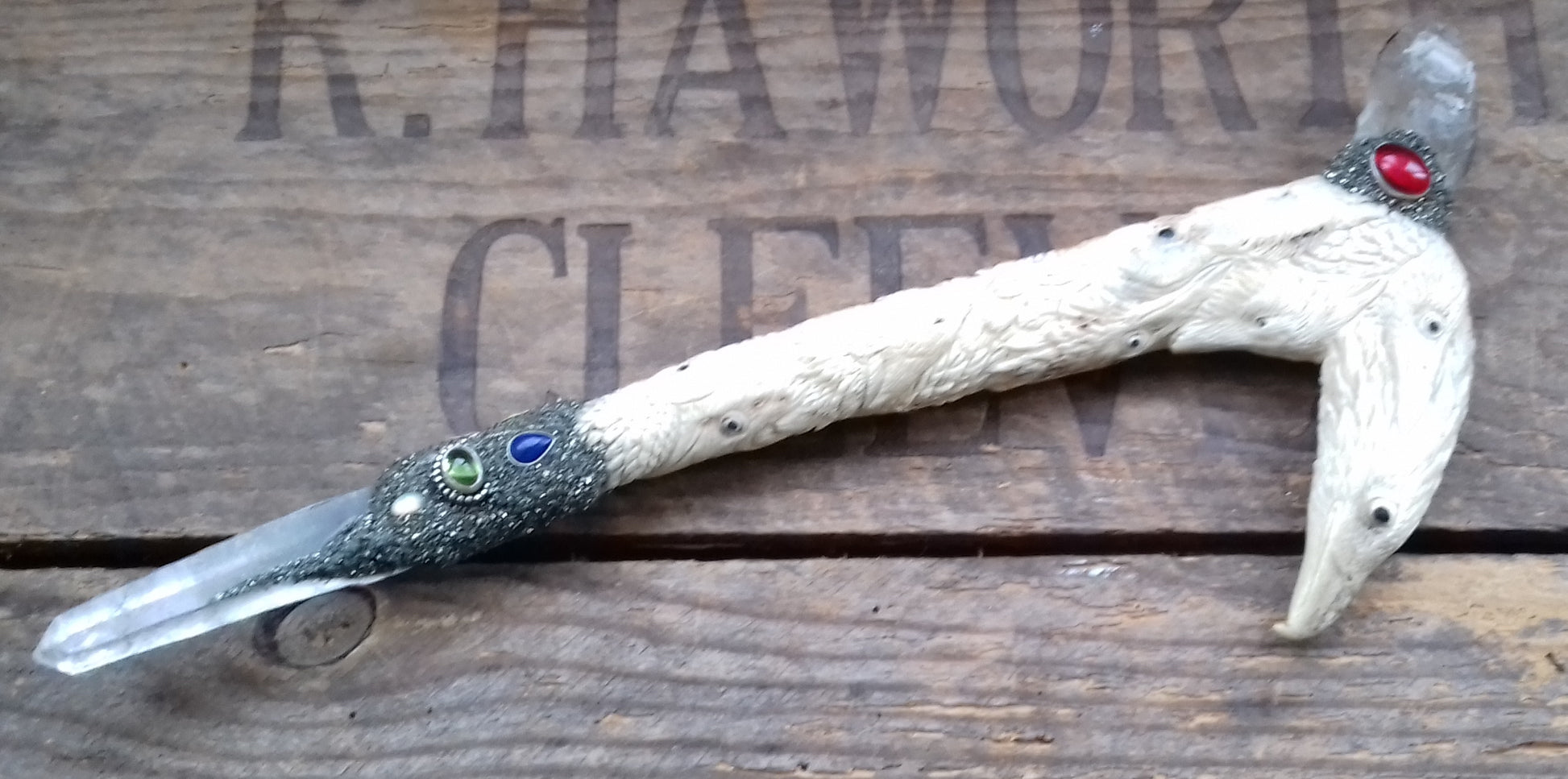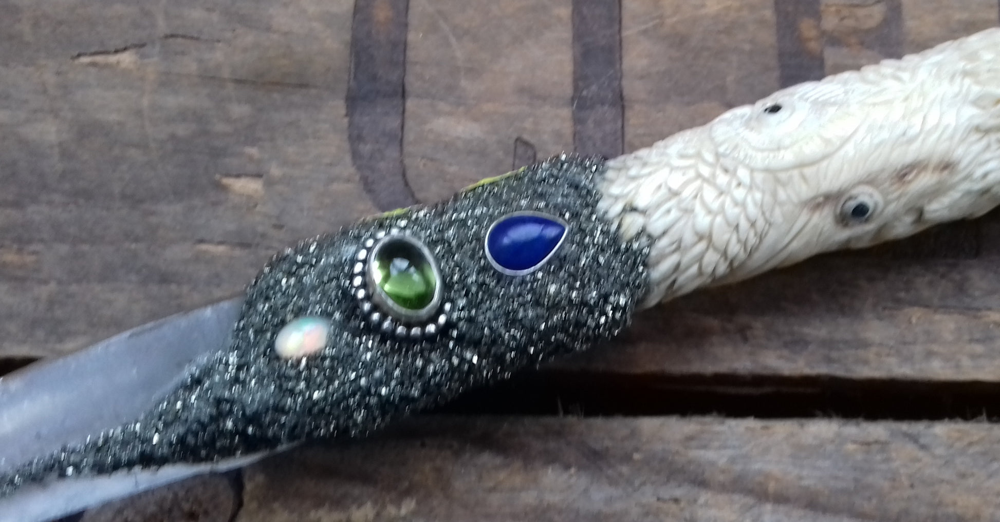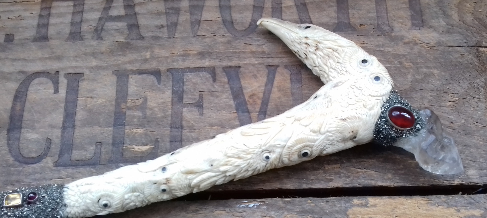 Ref.WD0058 - Wand with ecologically sourced deer horn carved eagles, ravens, owls, and wolves. Include laser & elestial quartz crystals, garnet, citrine, opal, peridot, lapis lazuli gems, plus a lab grown ruby.