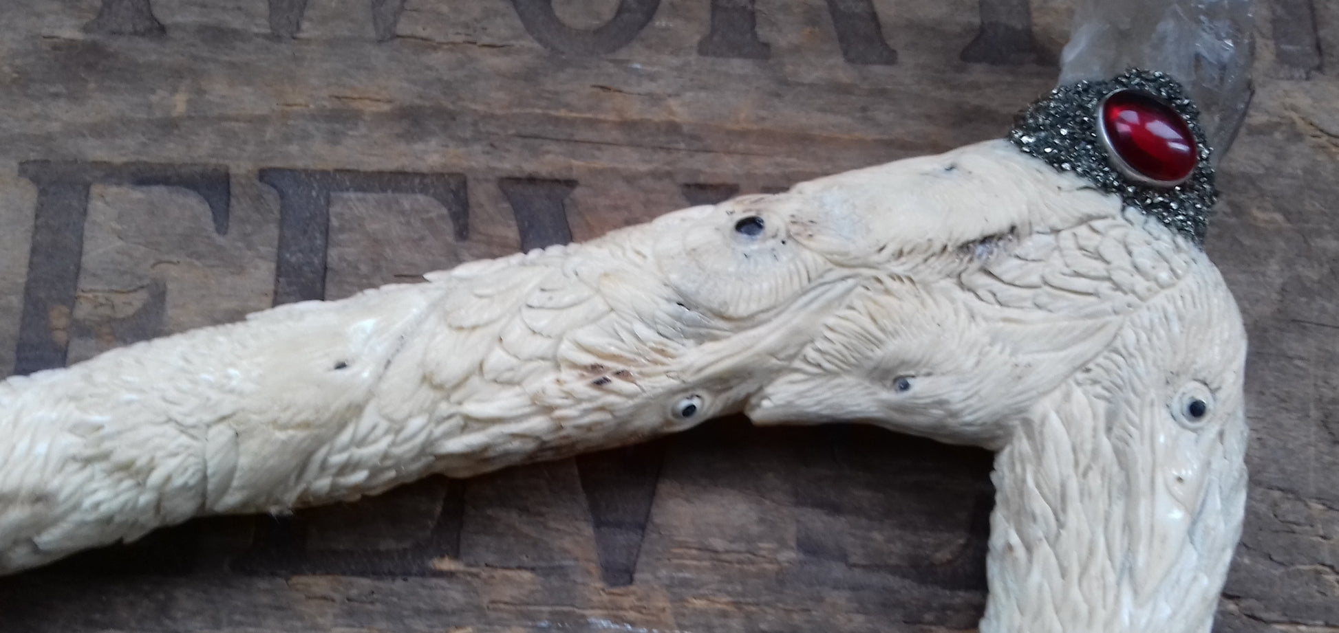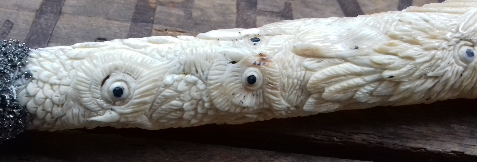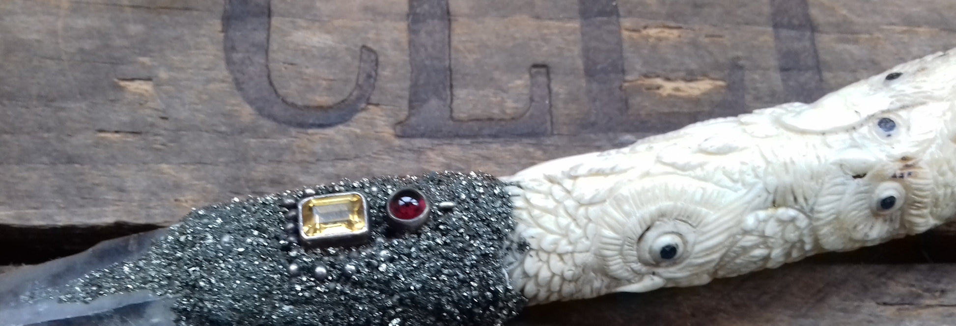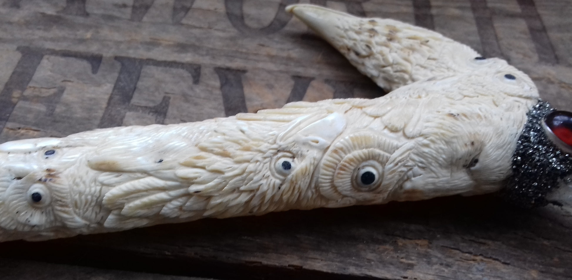 Ref.WD0058 - Wand with ecologically sourced deer horn carved eagles, ravens, owls, and wolves. Include laser & elestial quartz crystals, garnet, citrine, opal, peridot, lapis lazuli gems, plus a lab grown ruby.
