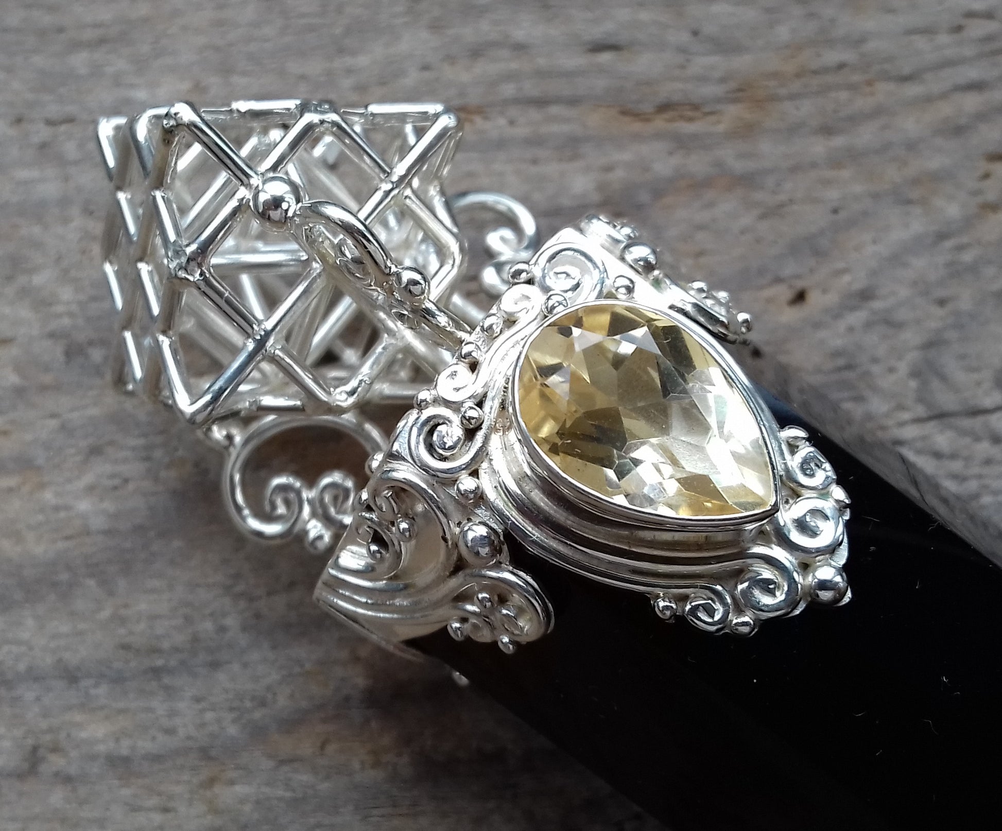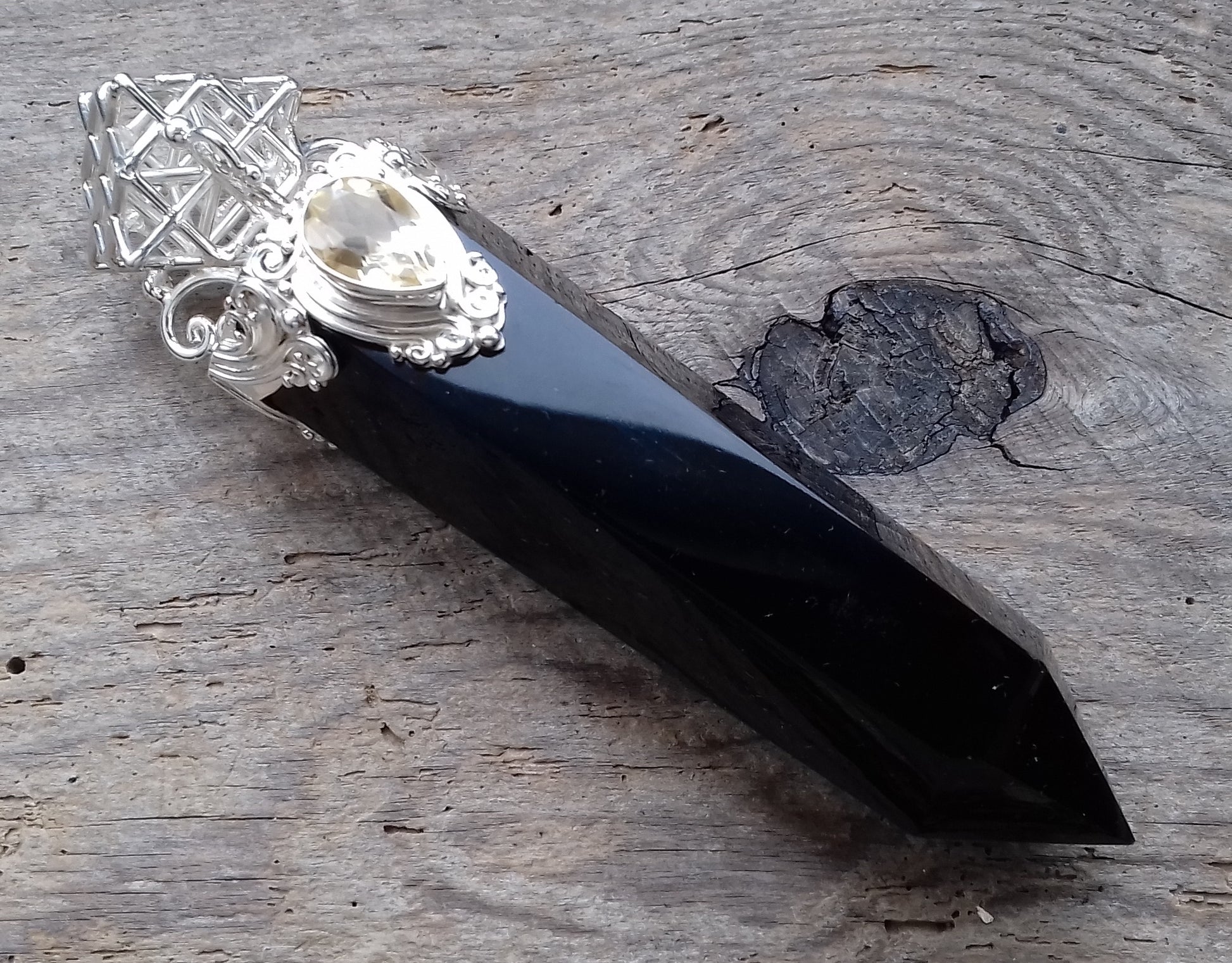 Silver wand with Tantric Terra Prana geometry, obsidian, and white topaz gemstone.