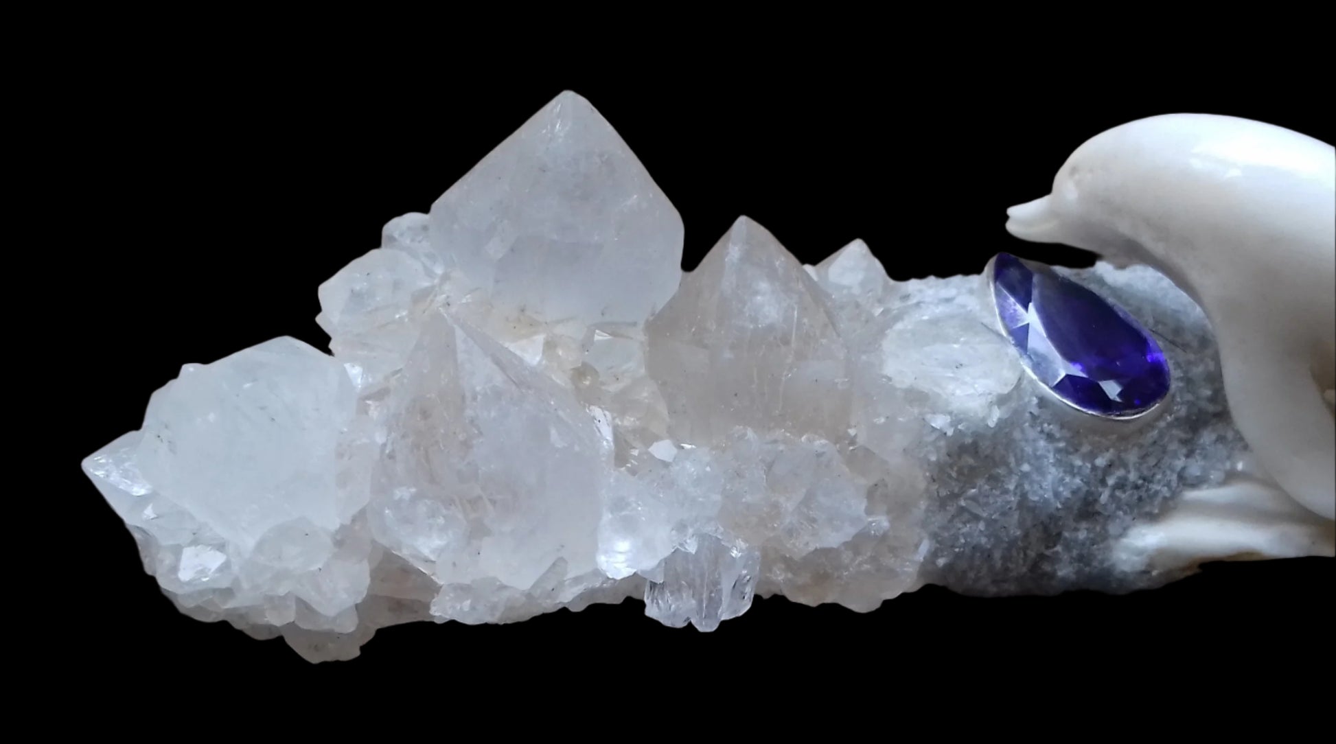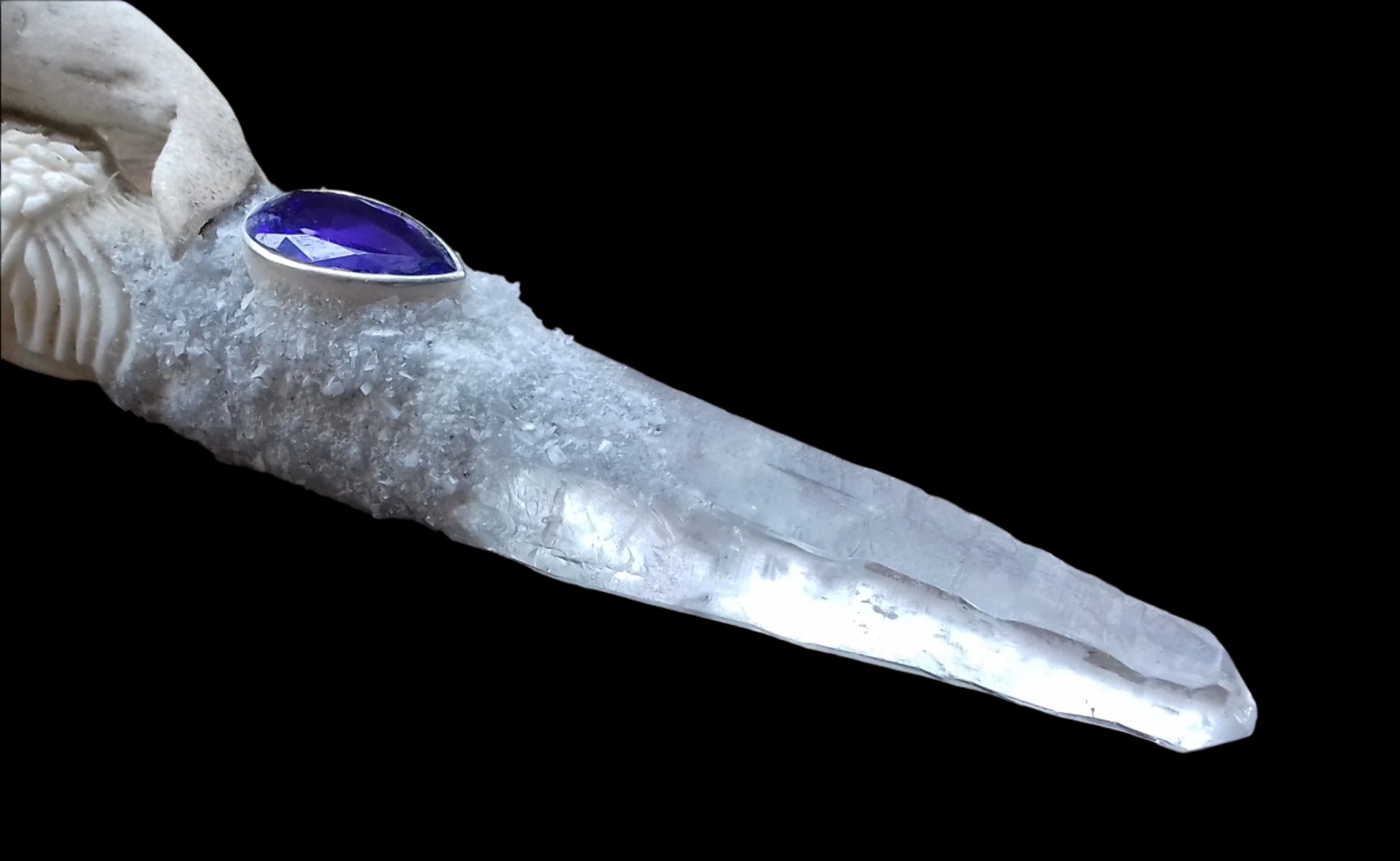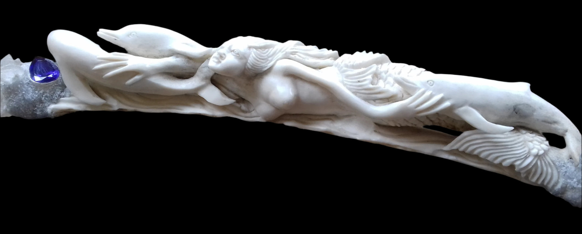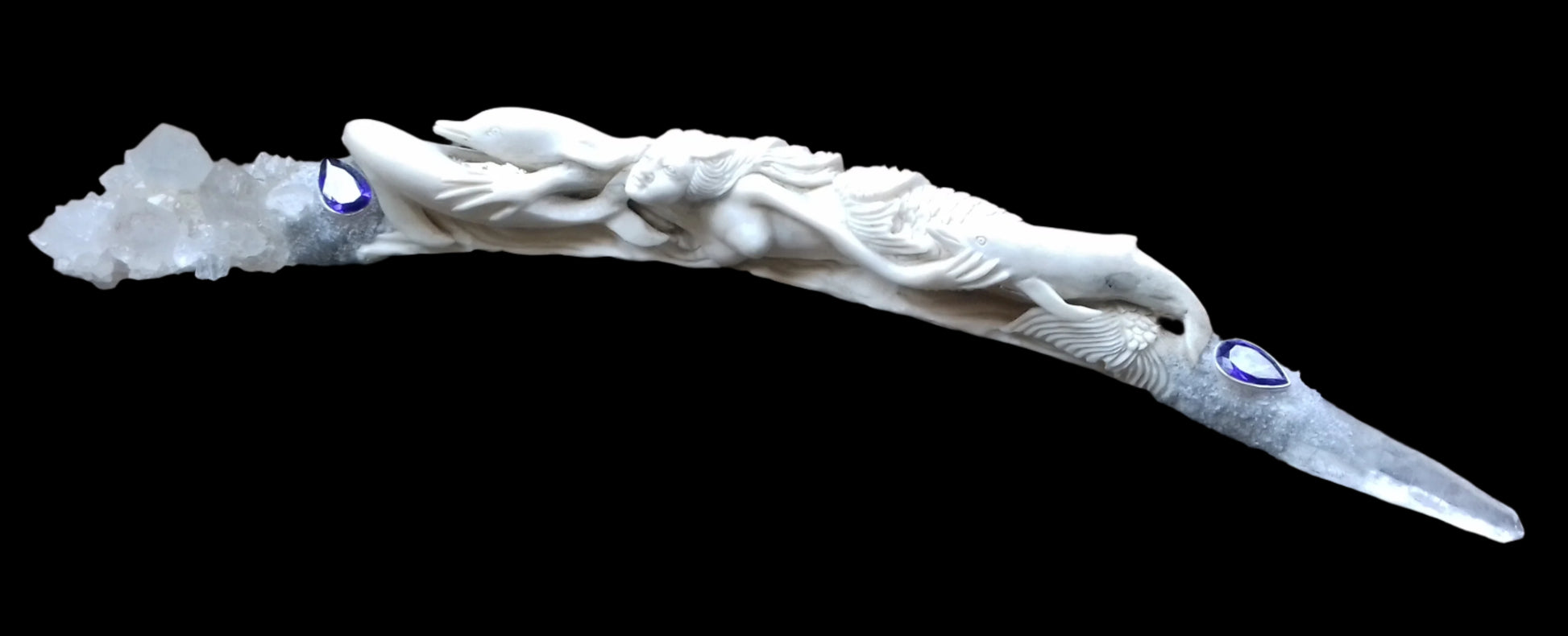 Ref.WD0139 - Ecologically sourced deer horn carved mermaid and dolphins with laser quartz crystal, quartz crystal cluster, amethyst gems, and moonstone dust.
