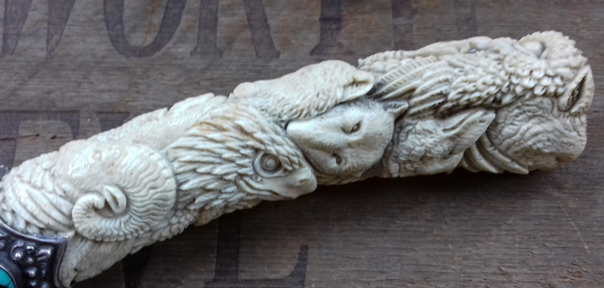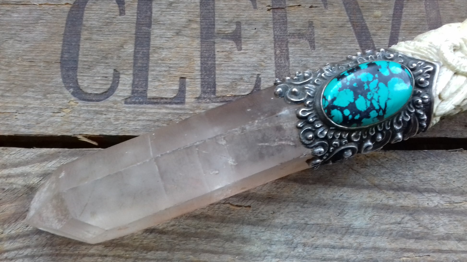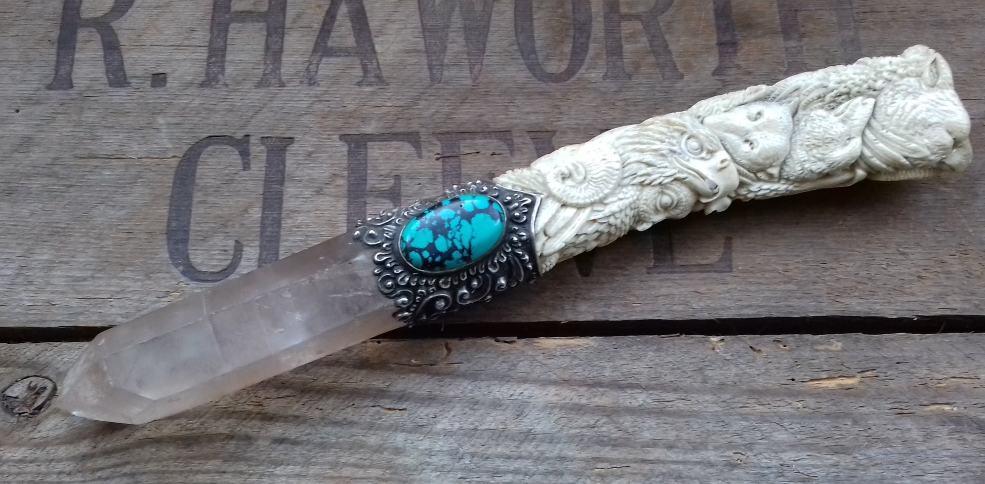 Ref.WD0142 - Silver multi-spirit animals (owl, ram, wolf, bear, gorilla, lion, rooster, rhinoceros) carved wand with laser quartz crystal, and turquoise gem.