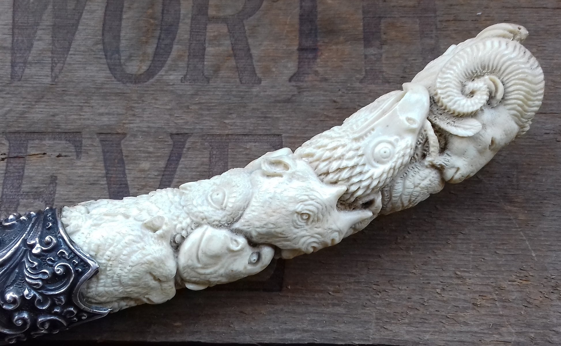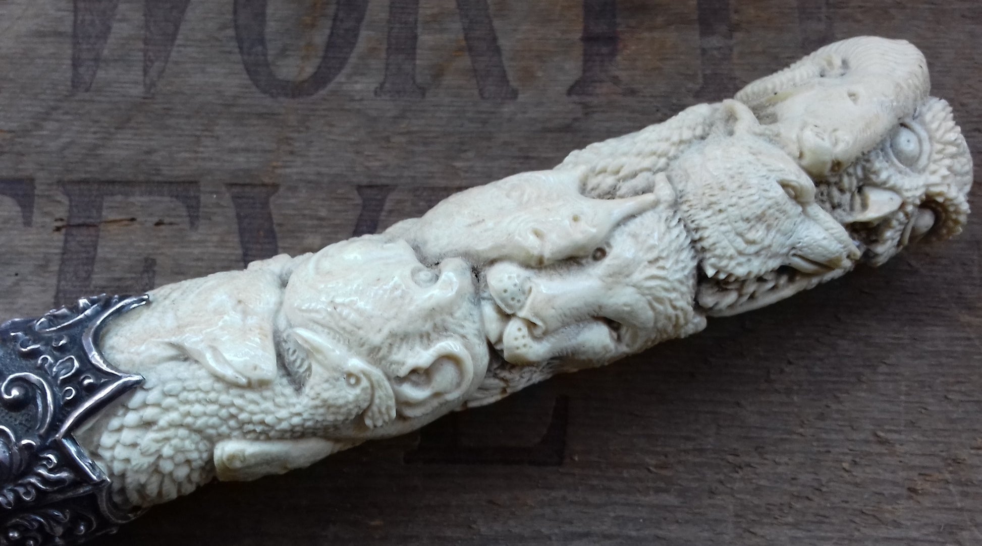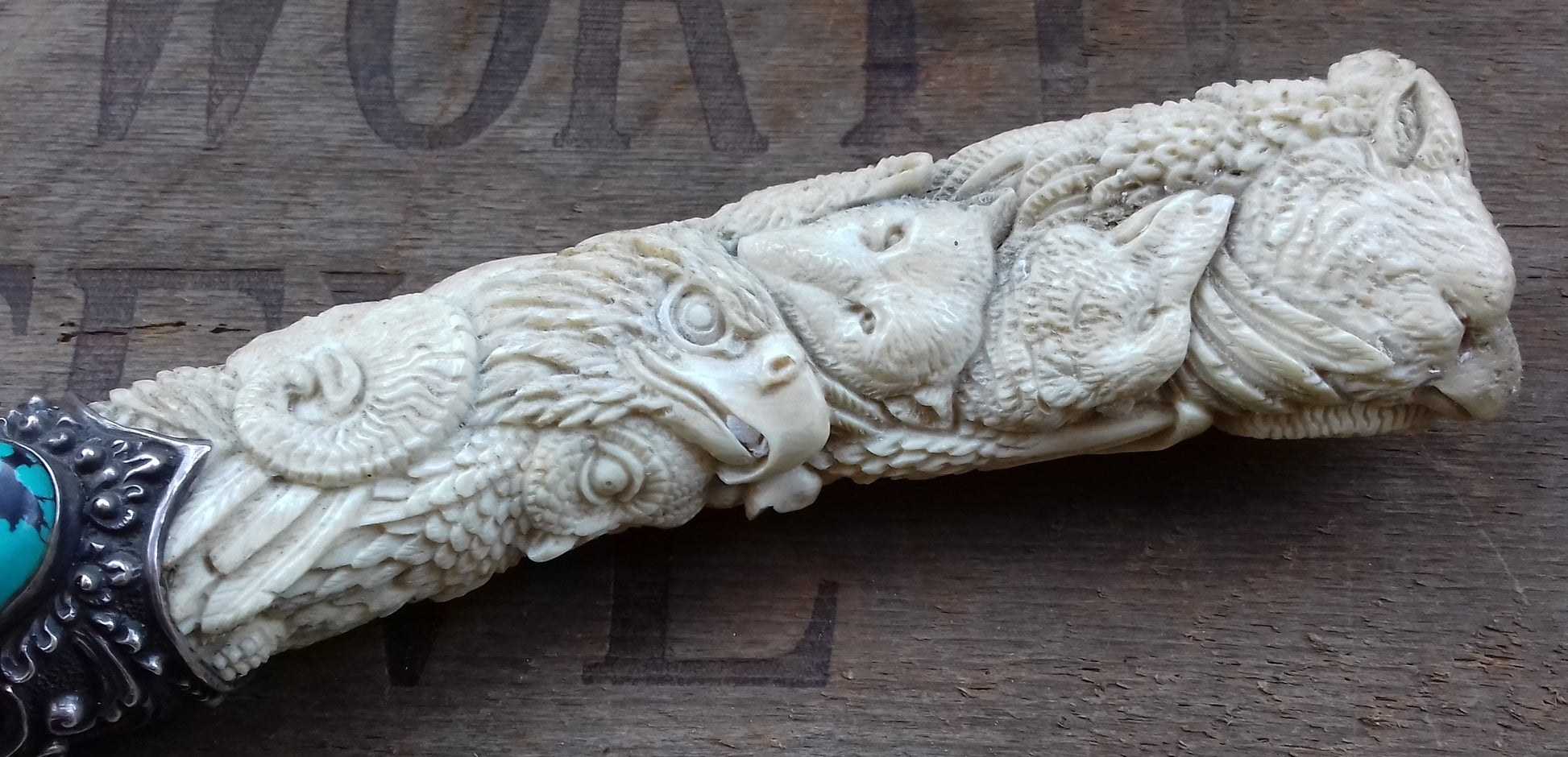 Ref.WD0142 - Silver multi-spirit animals (owl, ram, wolf, bear, gorilla, lion, rooster, rhinoceros) carved wand with laser quartz crystal, and turquoise gem.