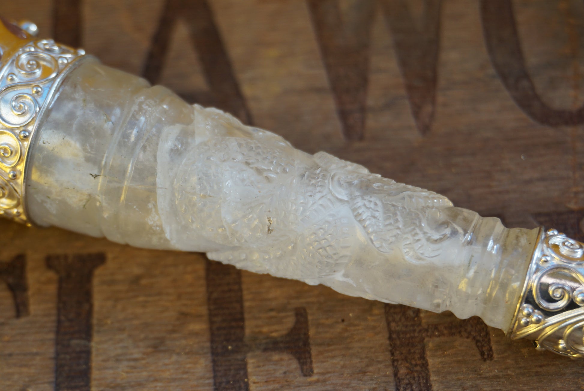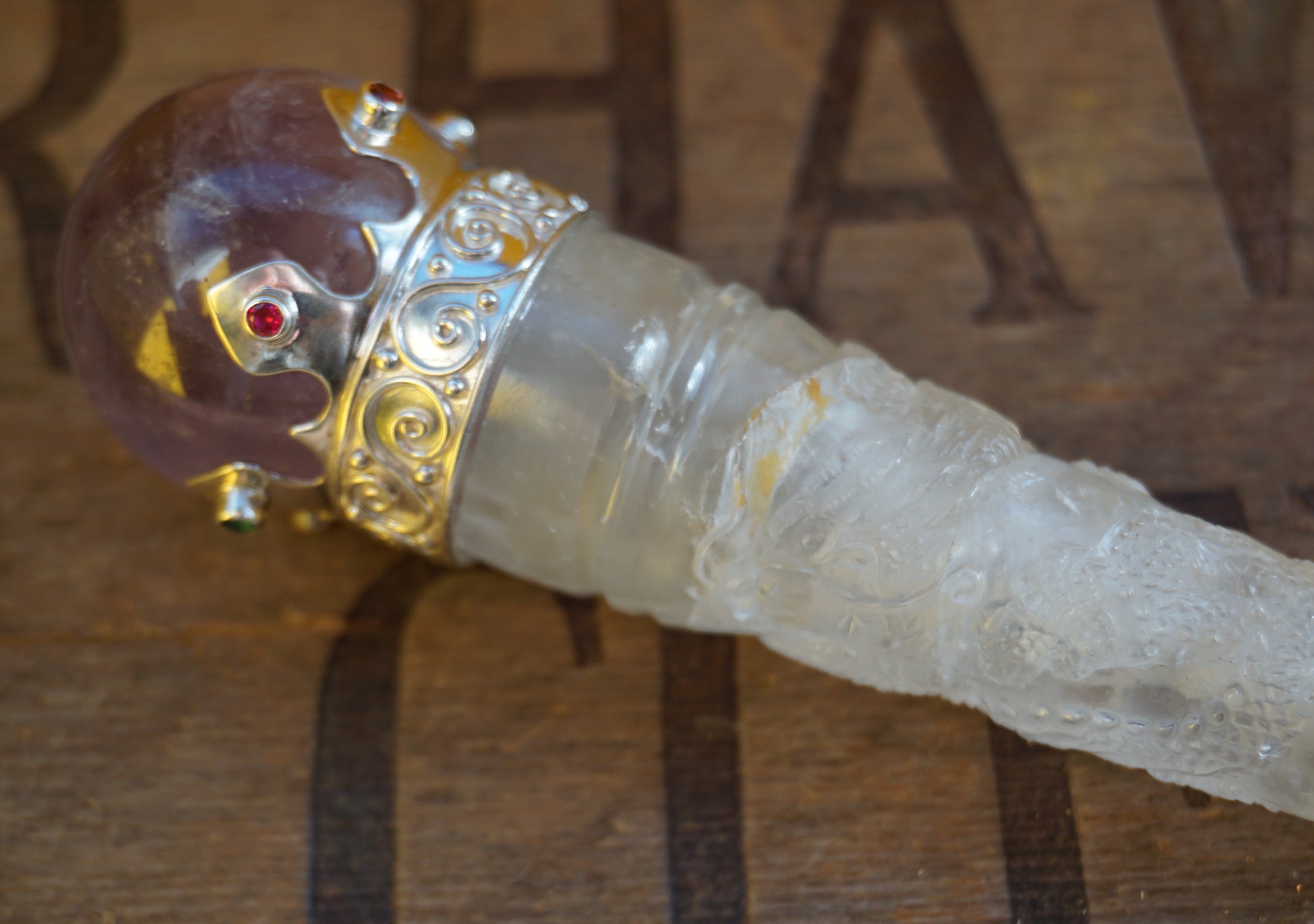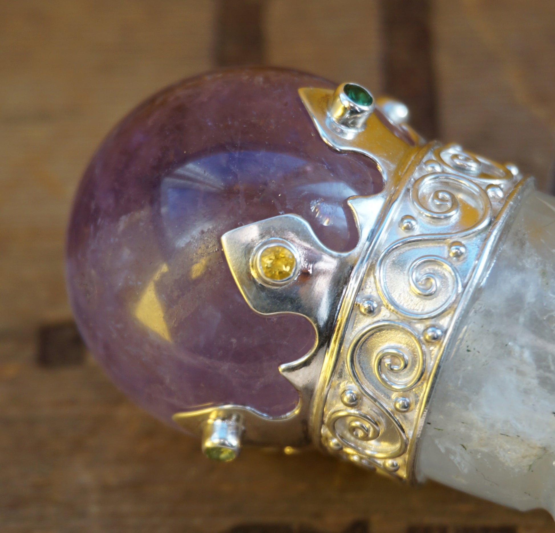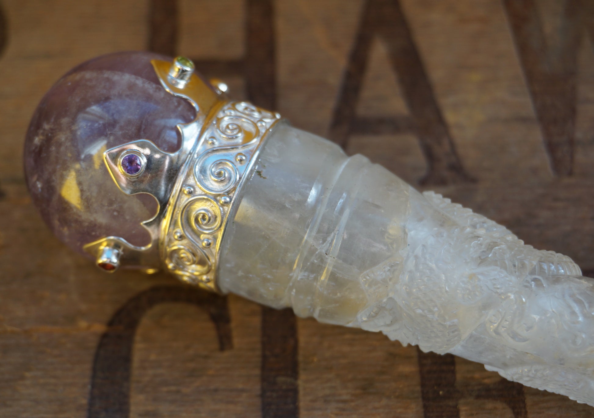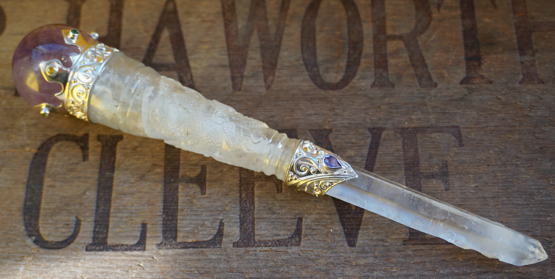 Silver wand with quartz crystal carved dragon, laser quartz crystal, amethyst sphere, cubic zirconia, and amethyst gems.