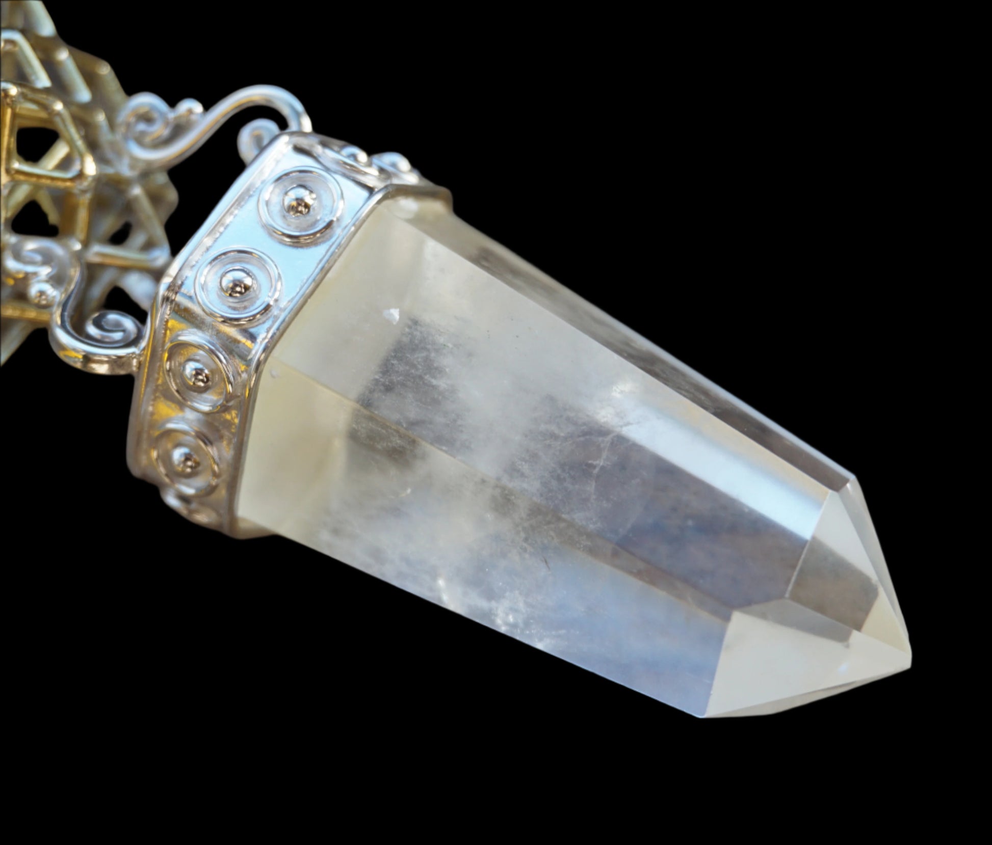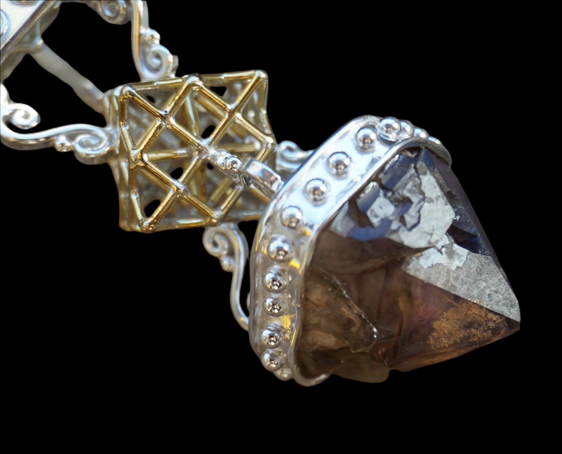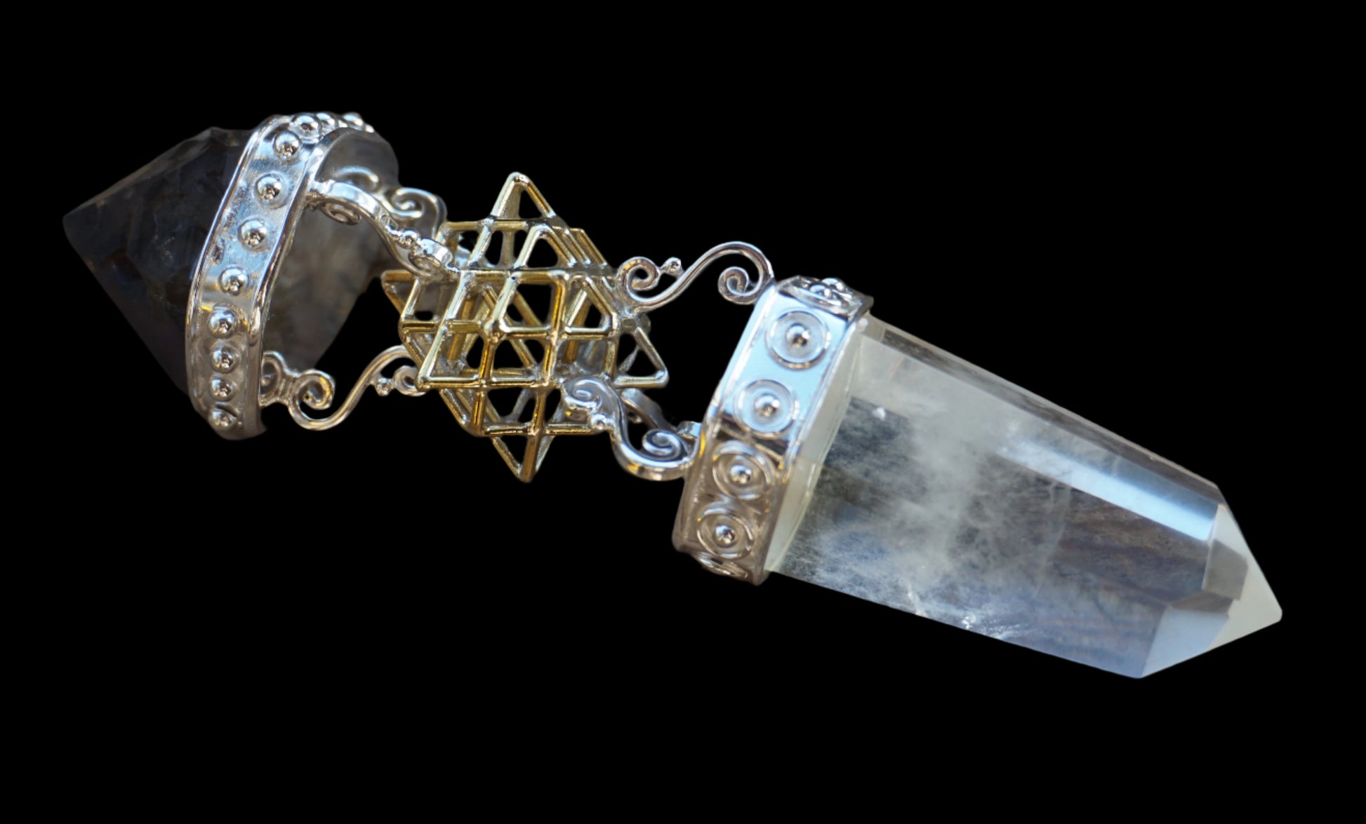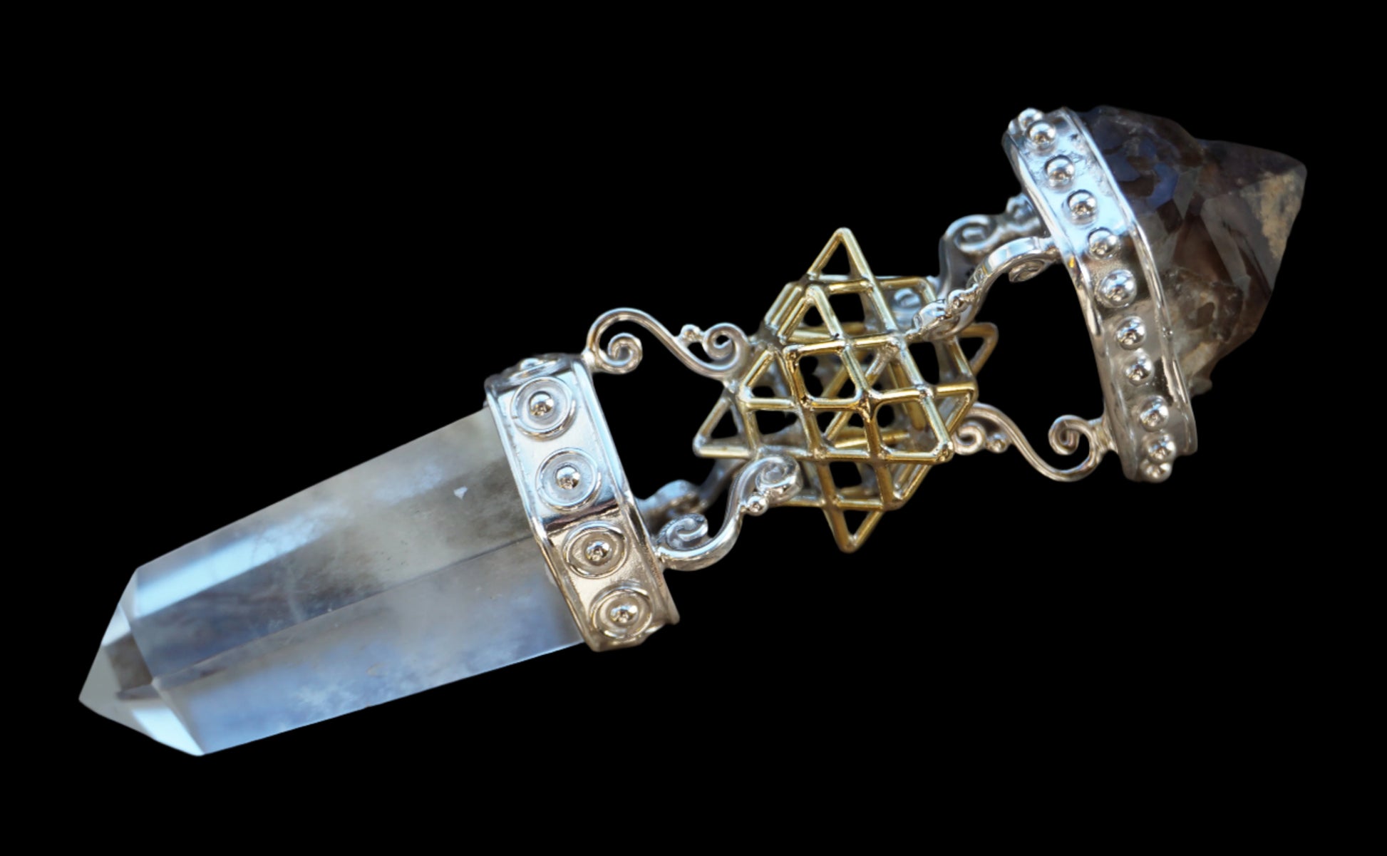 Ref.WD0231 - Silver wand with brass Tantric Terra Prana geometry, clear quartz crystal, and Brandberg amethyst.