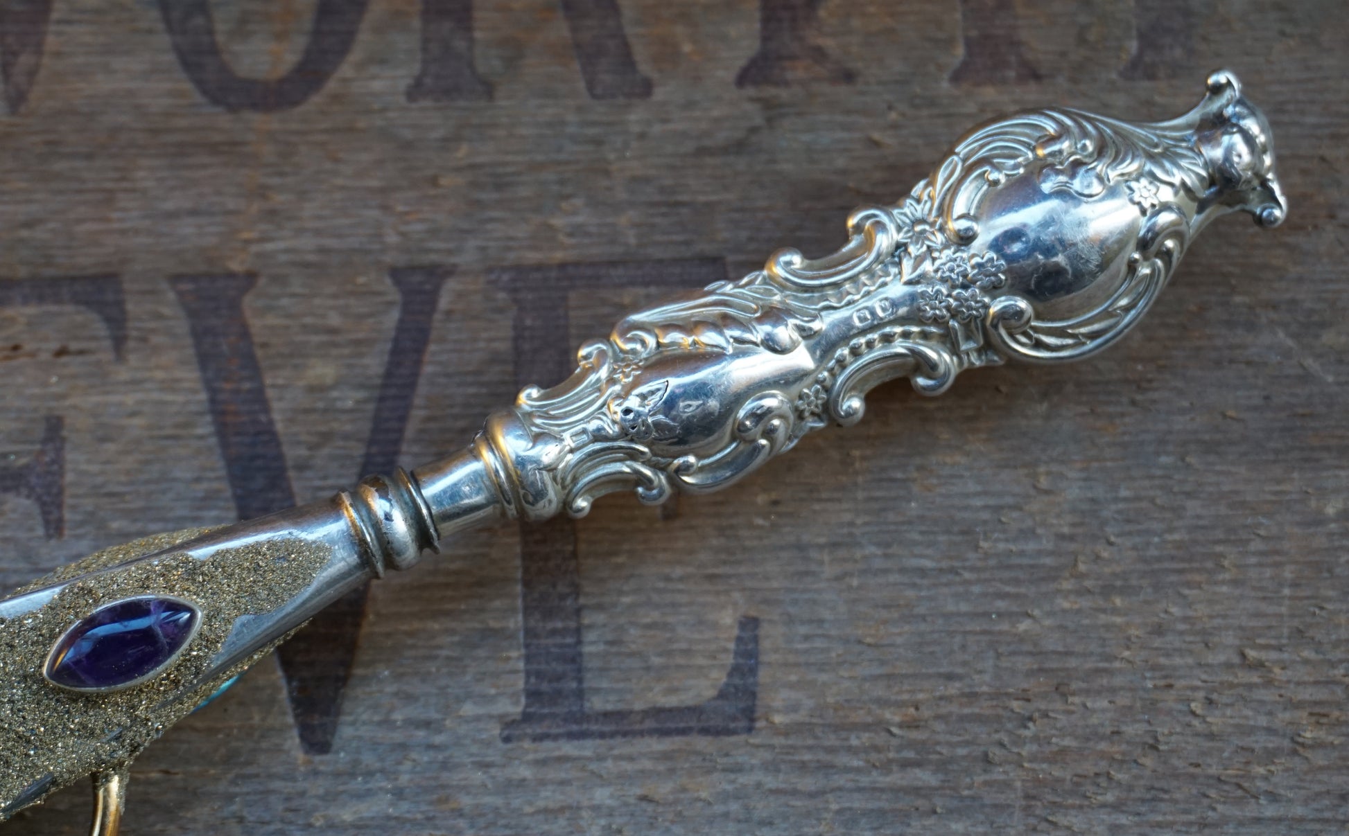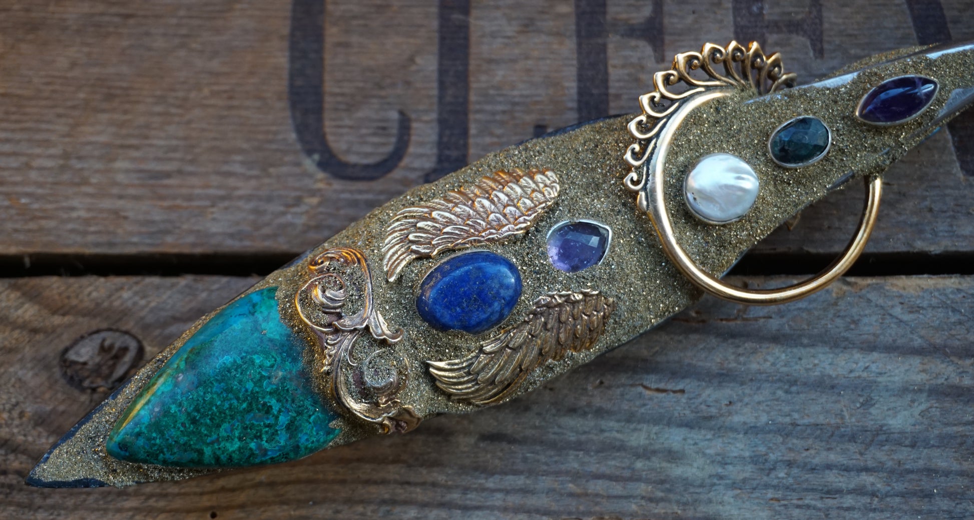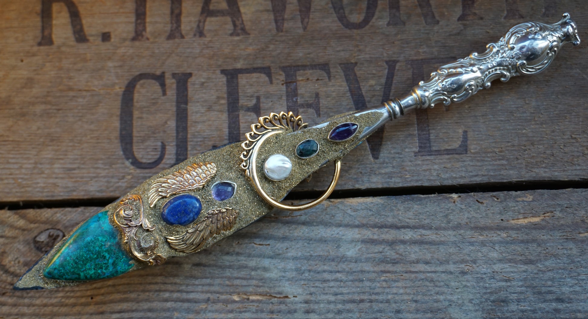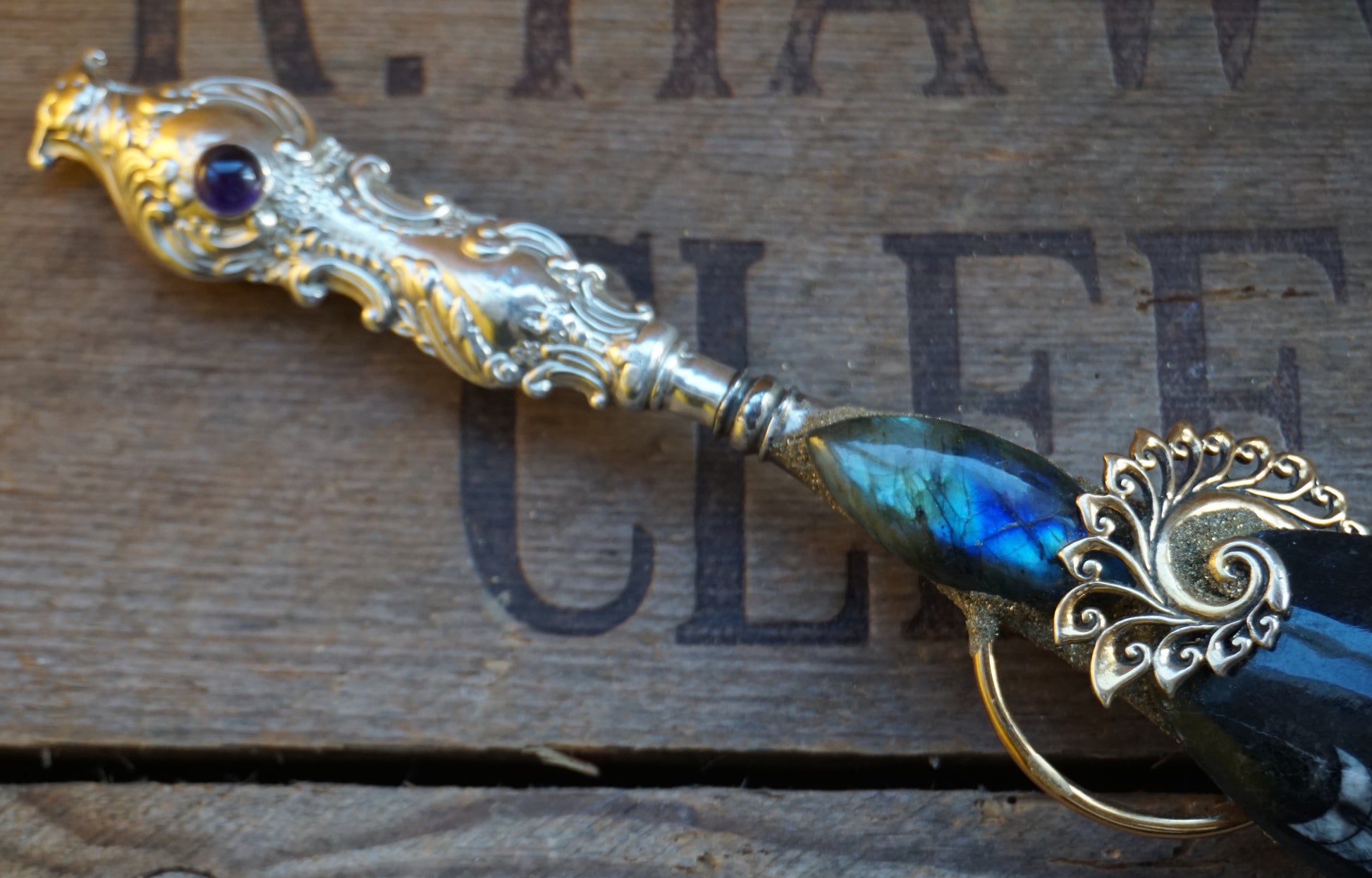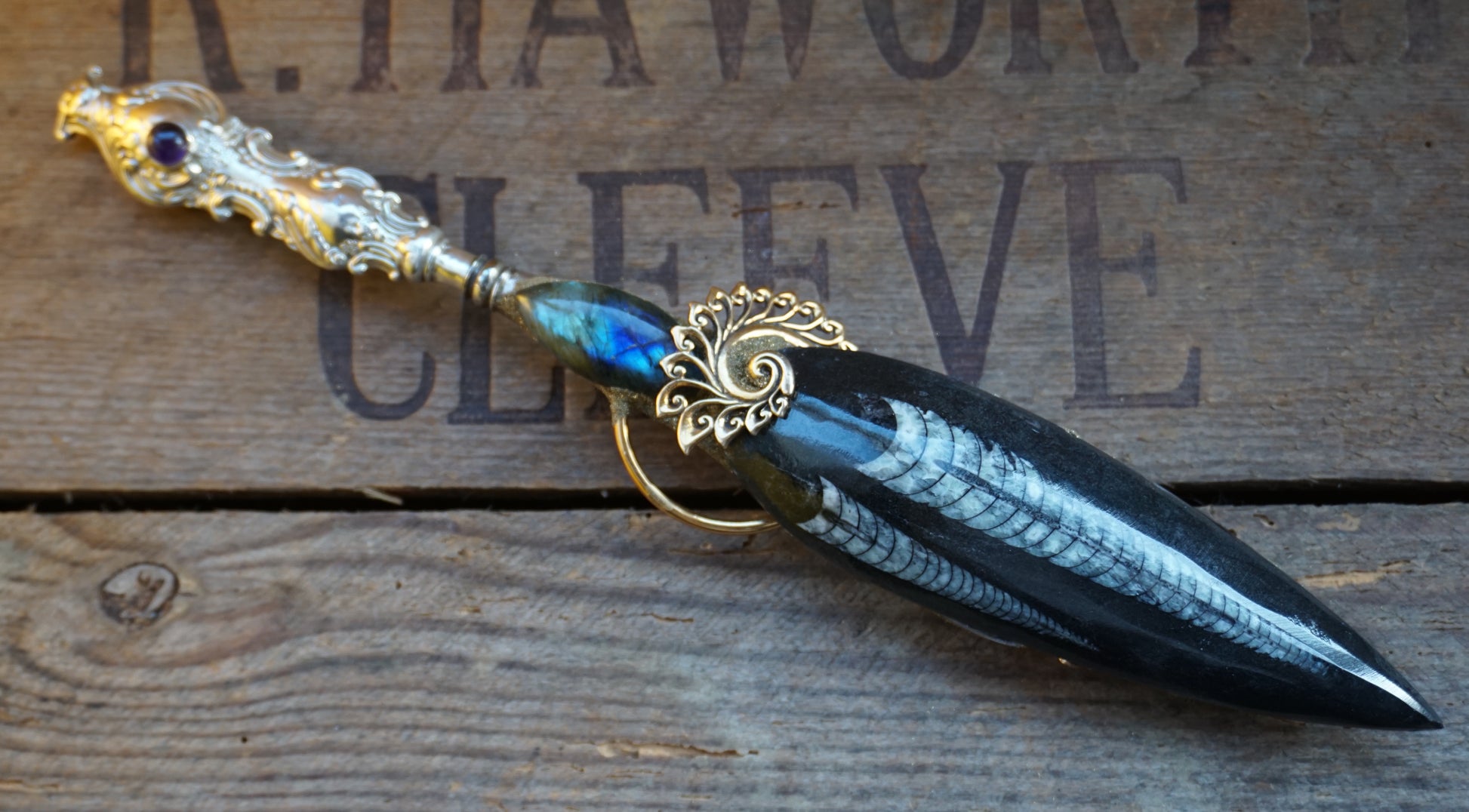 Ref.WD0241 - Silver/brass wand with orthoceras, pearl, chrysocolla, lapis lazuli, amethyst, emerald, and labradorite gemstones.