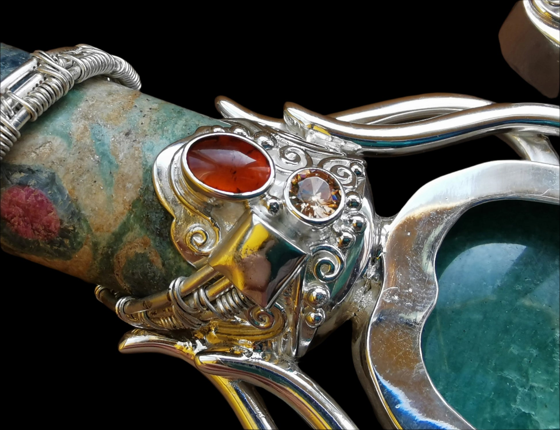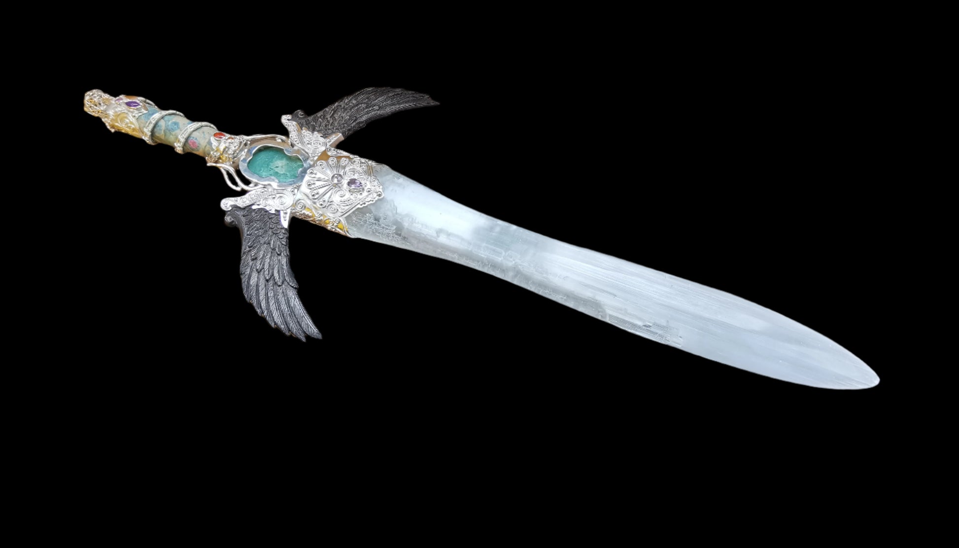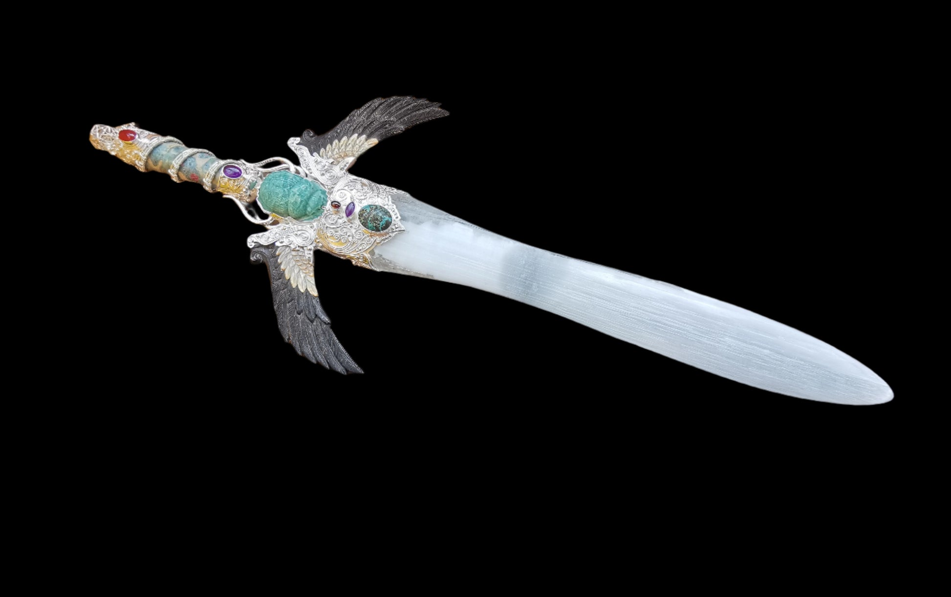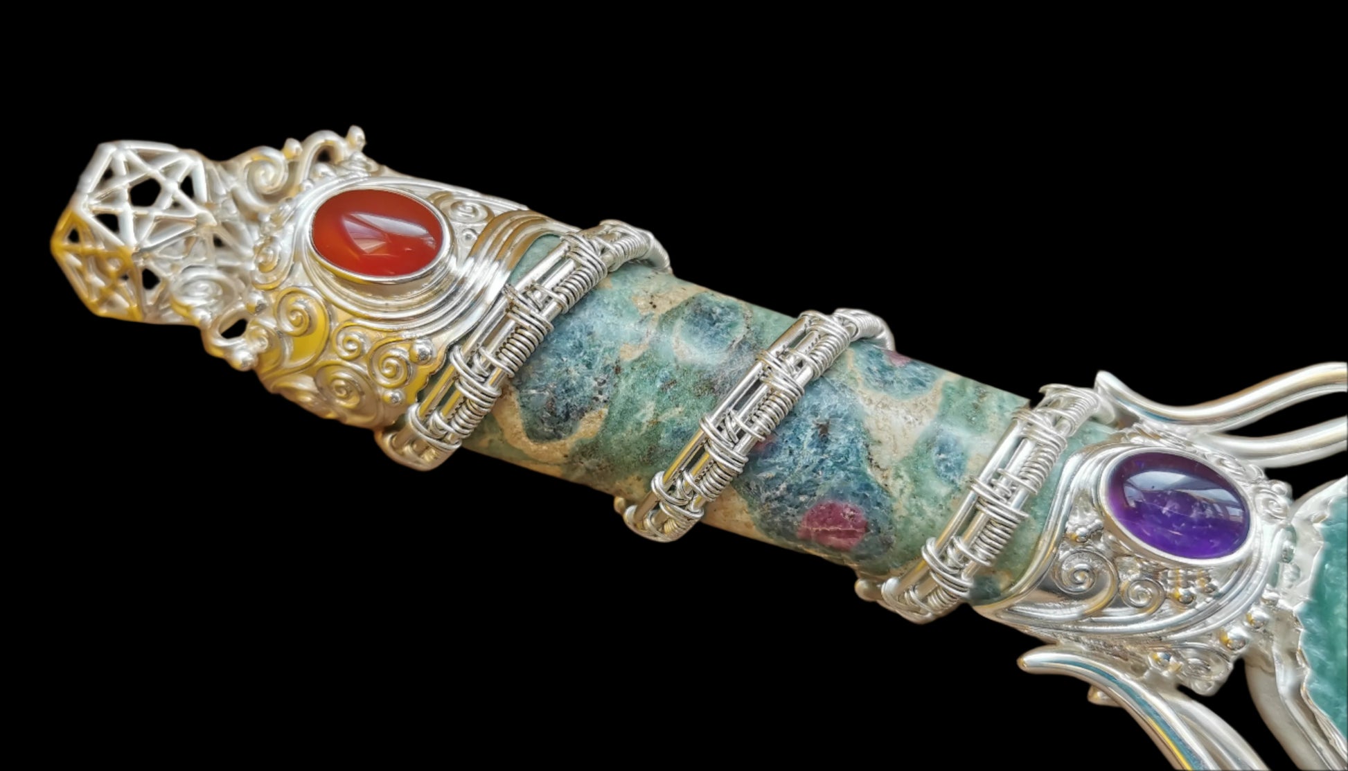 Ref.WD0465 - Silver wand with Dodecahedron geometry [pommel], carnelian, ruby zoisite [handle], iron wood & mother of pearl [guards], amethyst, amazonite carved scarab, garnet, turquoise, citrine, zircon, selenite [blade] gemstones. To note that the 5 cubes nested in the dodecahedron form a pentagram on each face.
