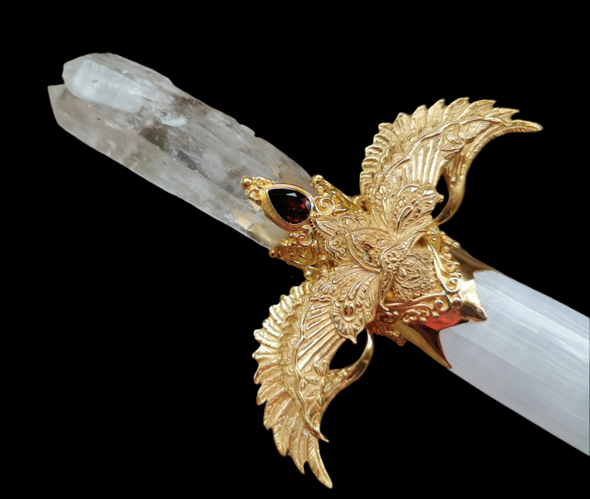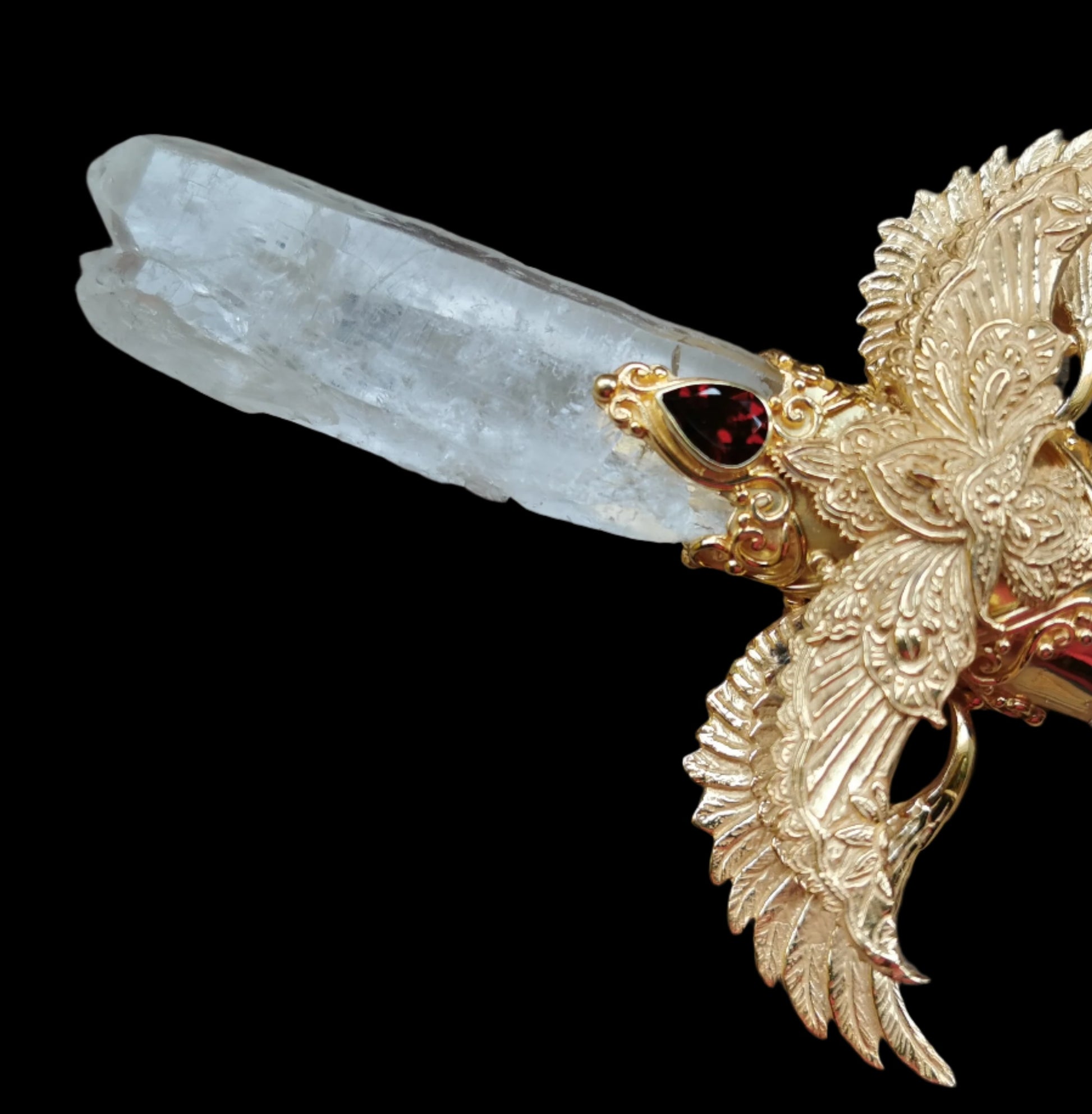 Ref.WD0466 - Gold plated on silver wand with triplet laser quartz crystal, garnet, and selenite gems.