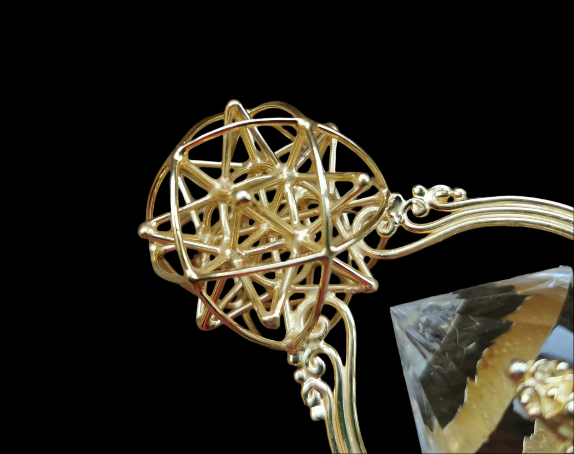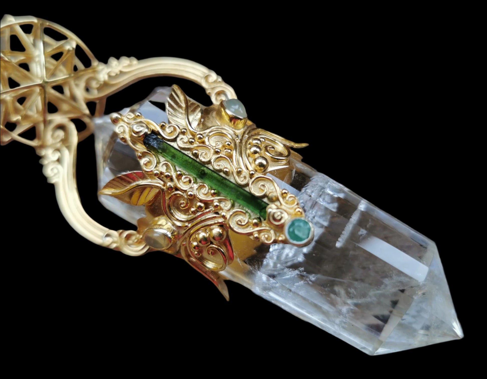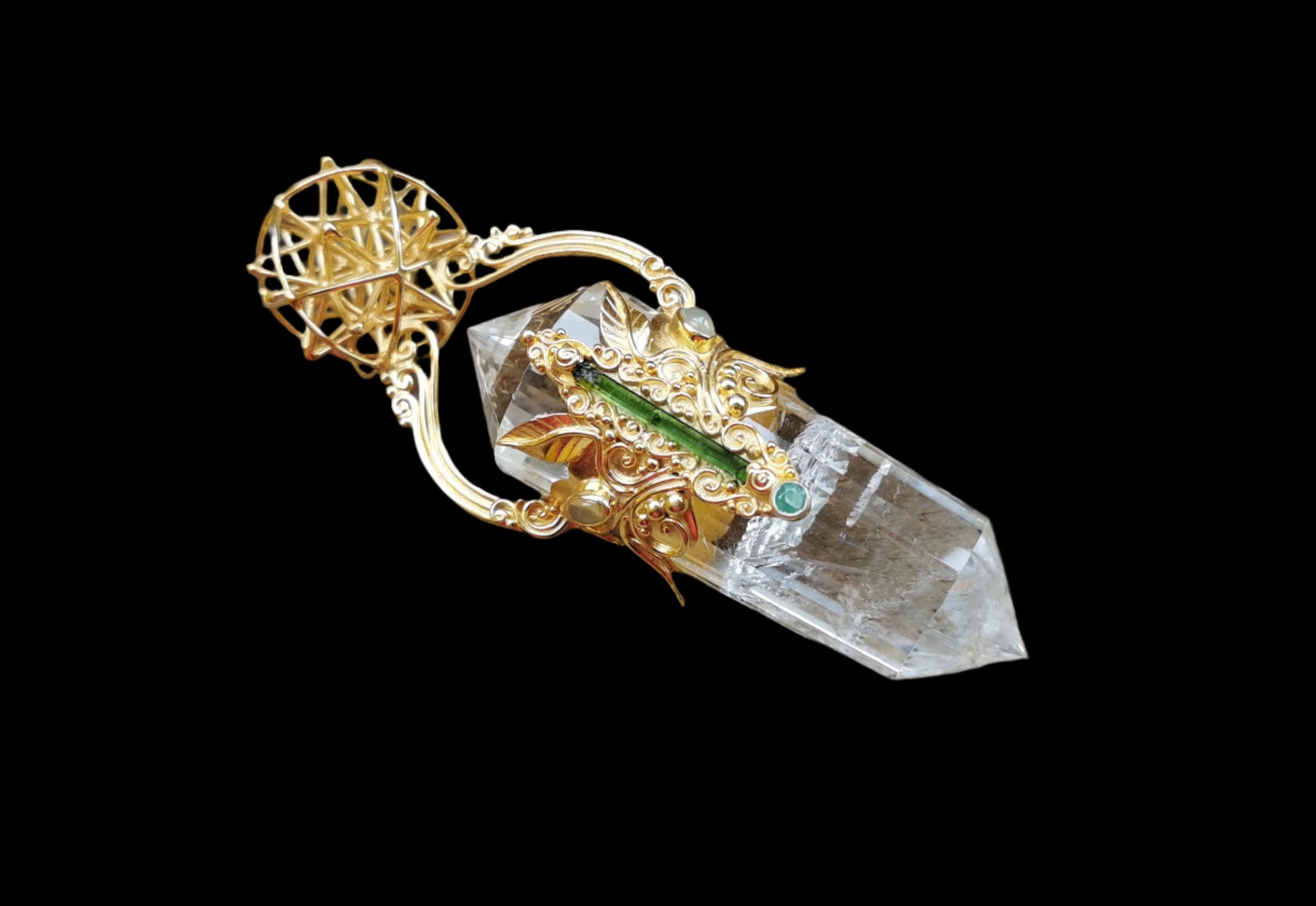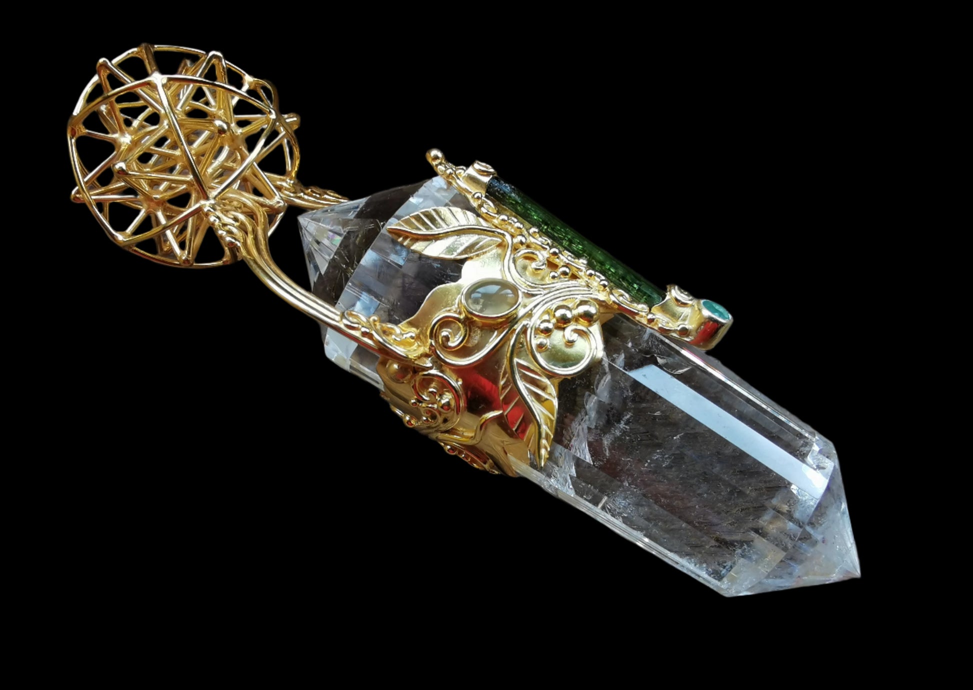 Ref.WD0468 - Gold plated on silver wand with Tantric Vortex geometry, 24 sided Vogel quartz crystal, tourmaline, opal, and emerald gems.