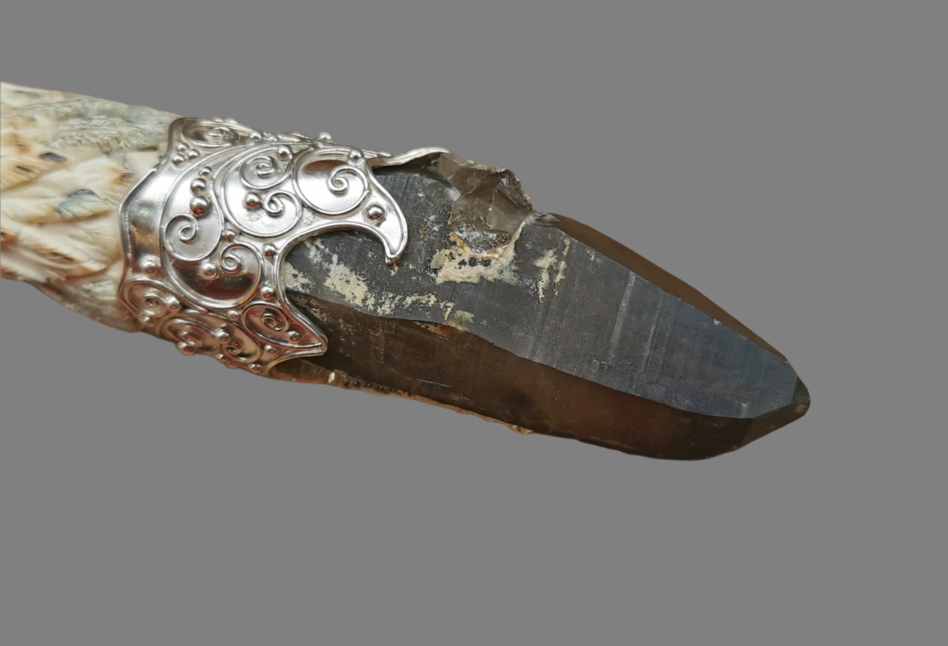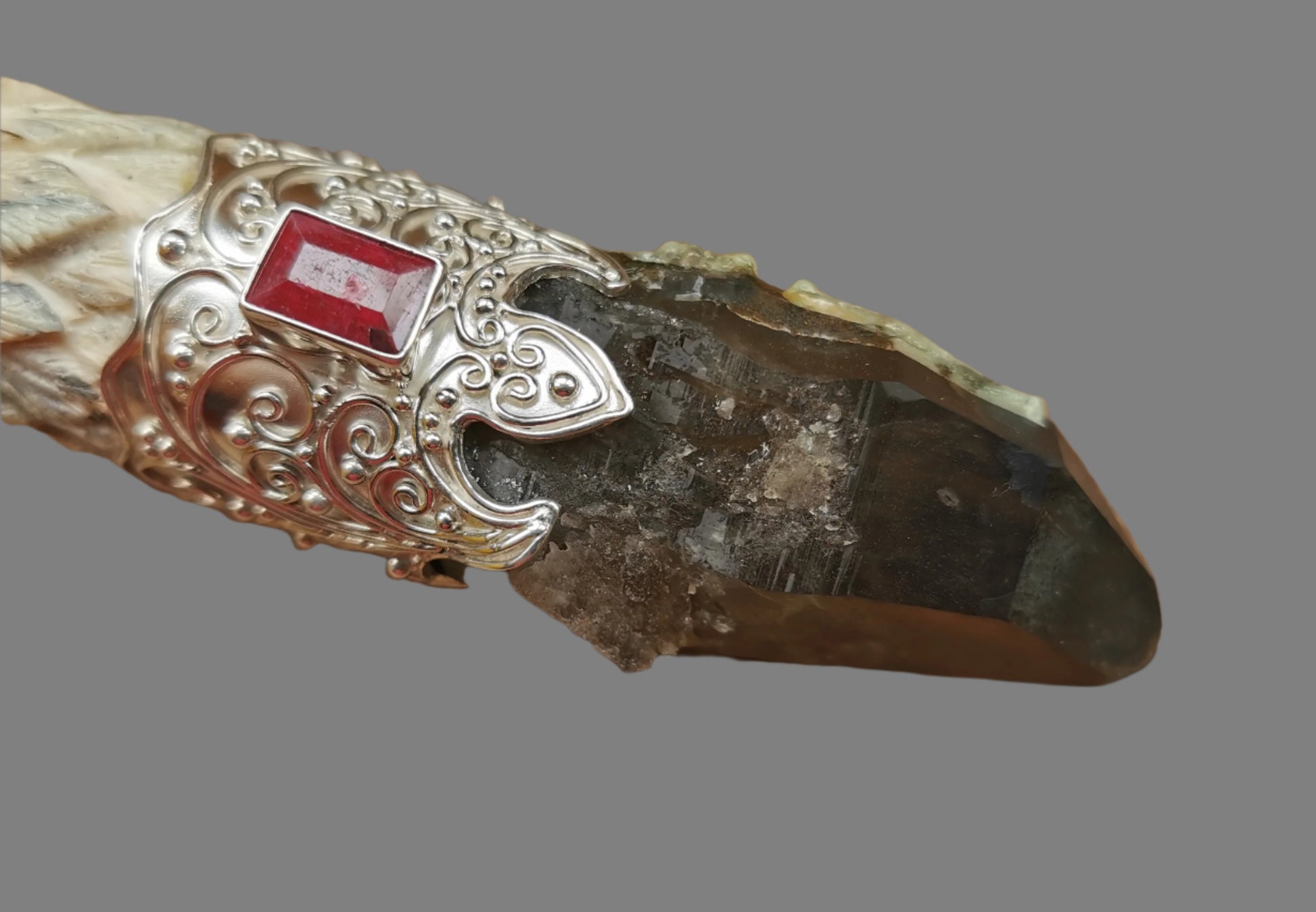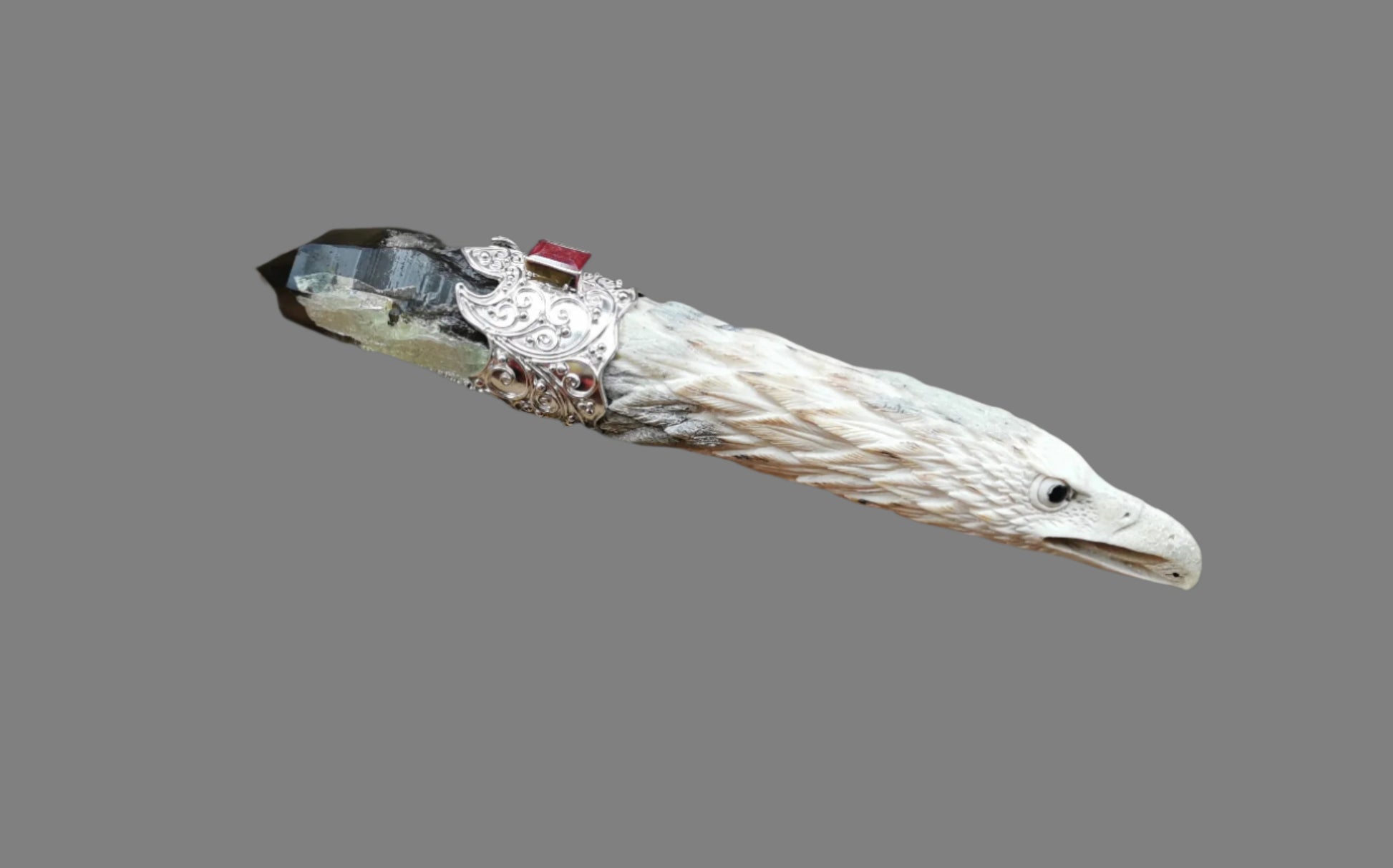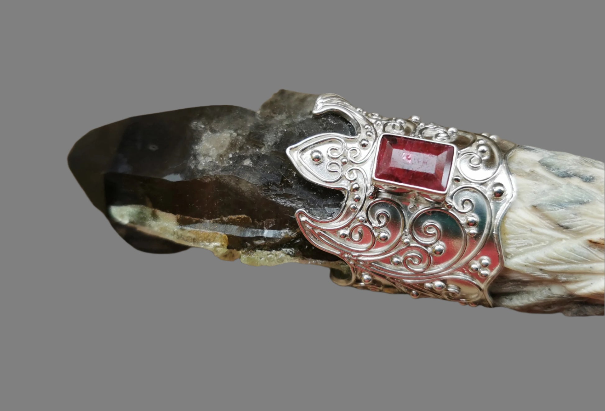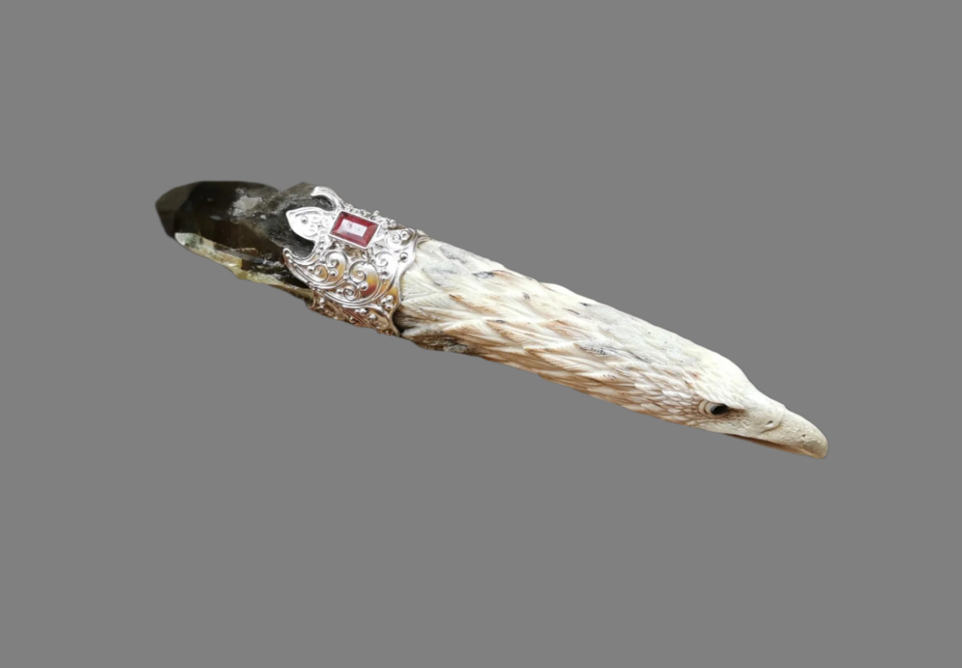 Ref.WD0469 - Silver wand with ecologically sourced deer horn carved eagle, Tibetan smoky quartz crystal, and ruby gemstone.