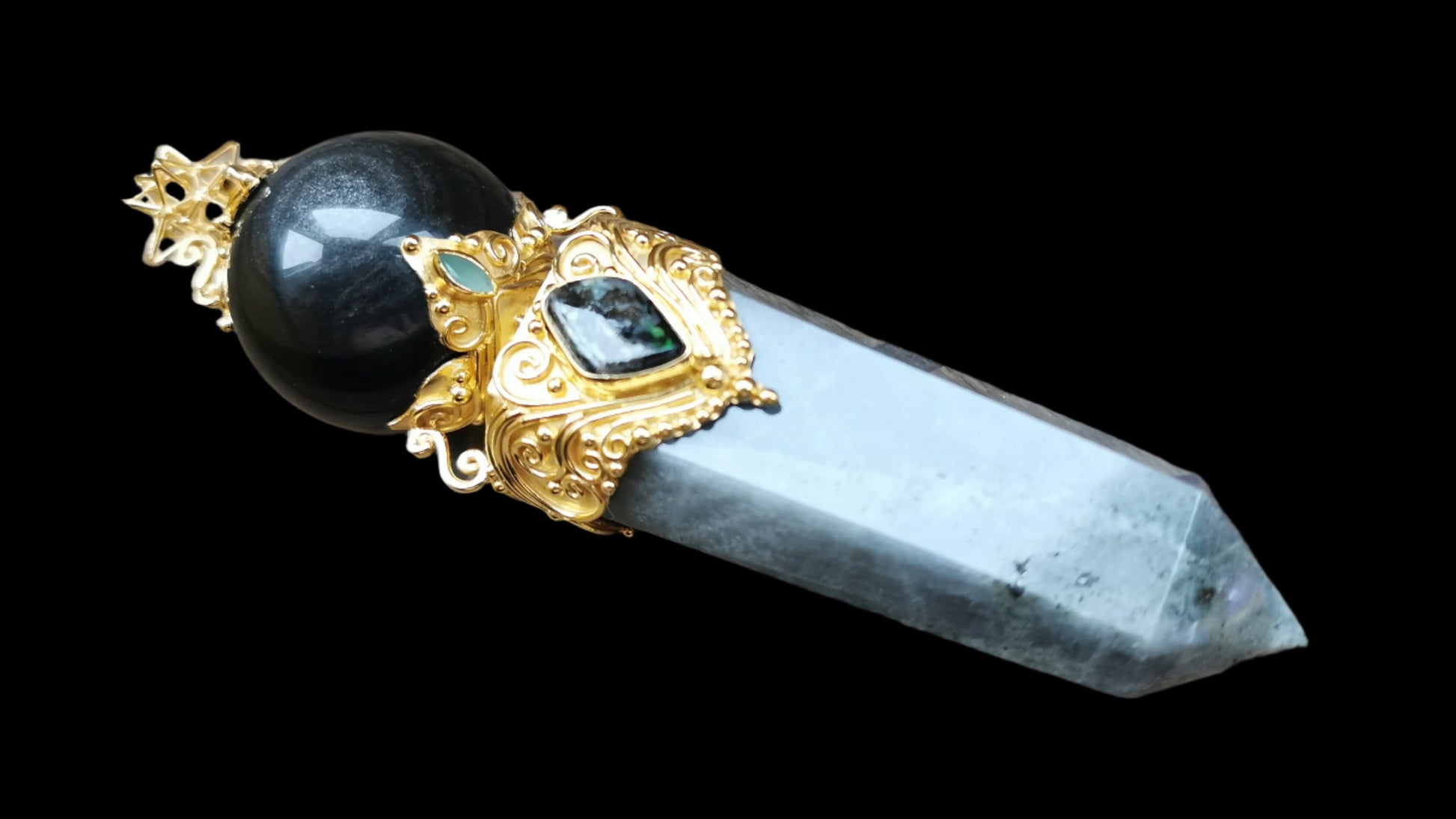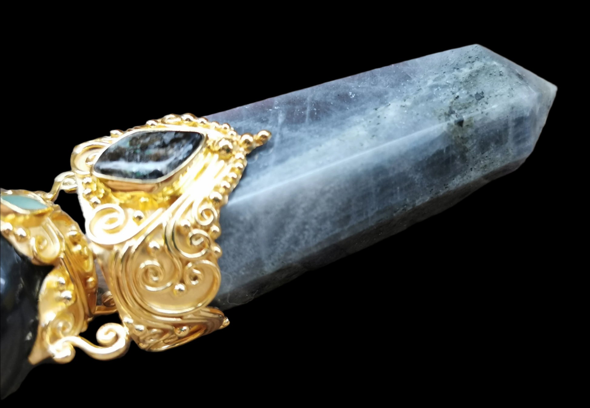 Ref.WD0470 - Gold plated on silver wand with Heart Star geometry, black obsidian, ruby, emerald, opal, and labradorite gemstones.