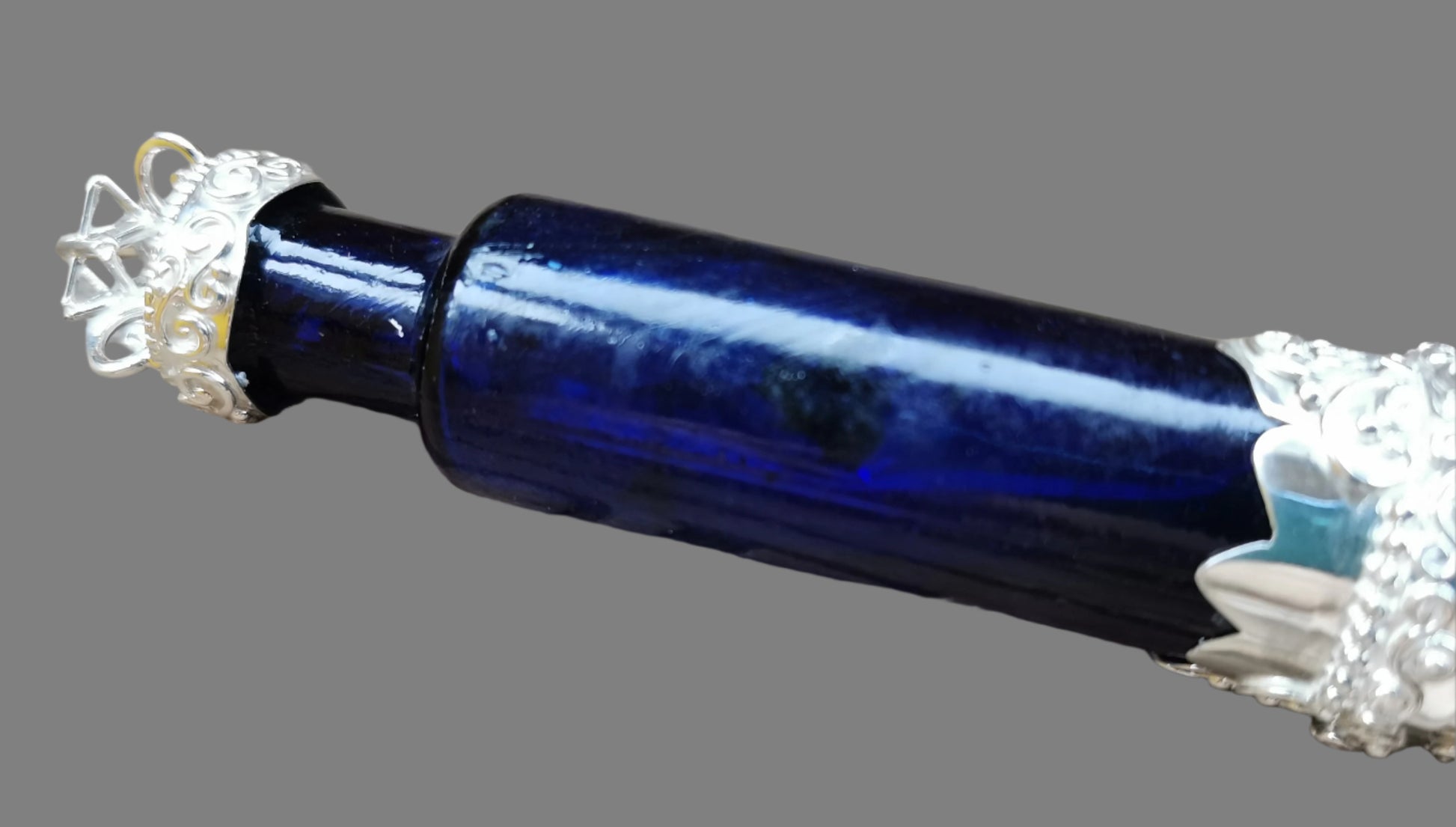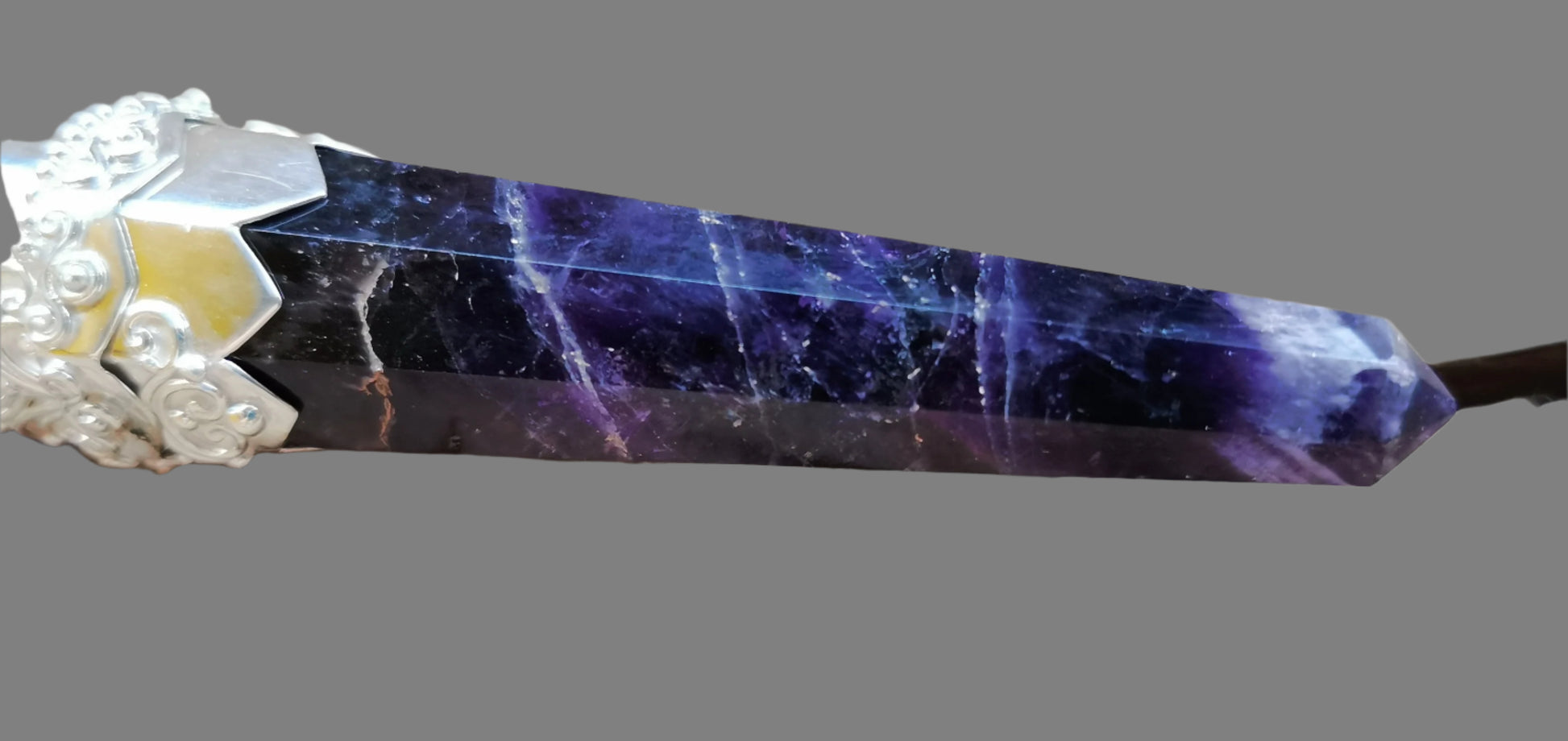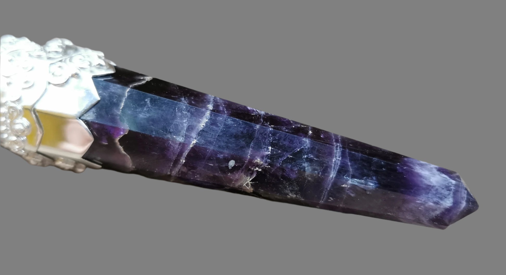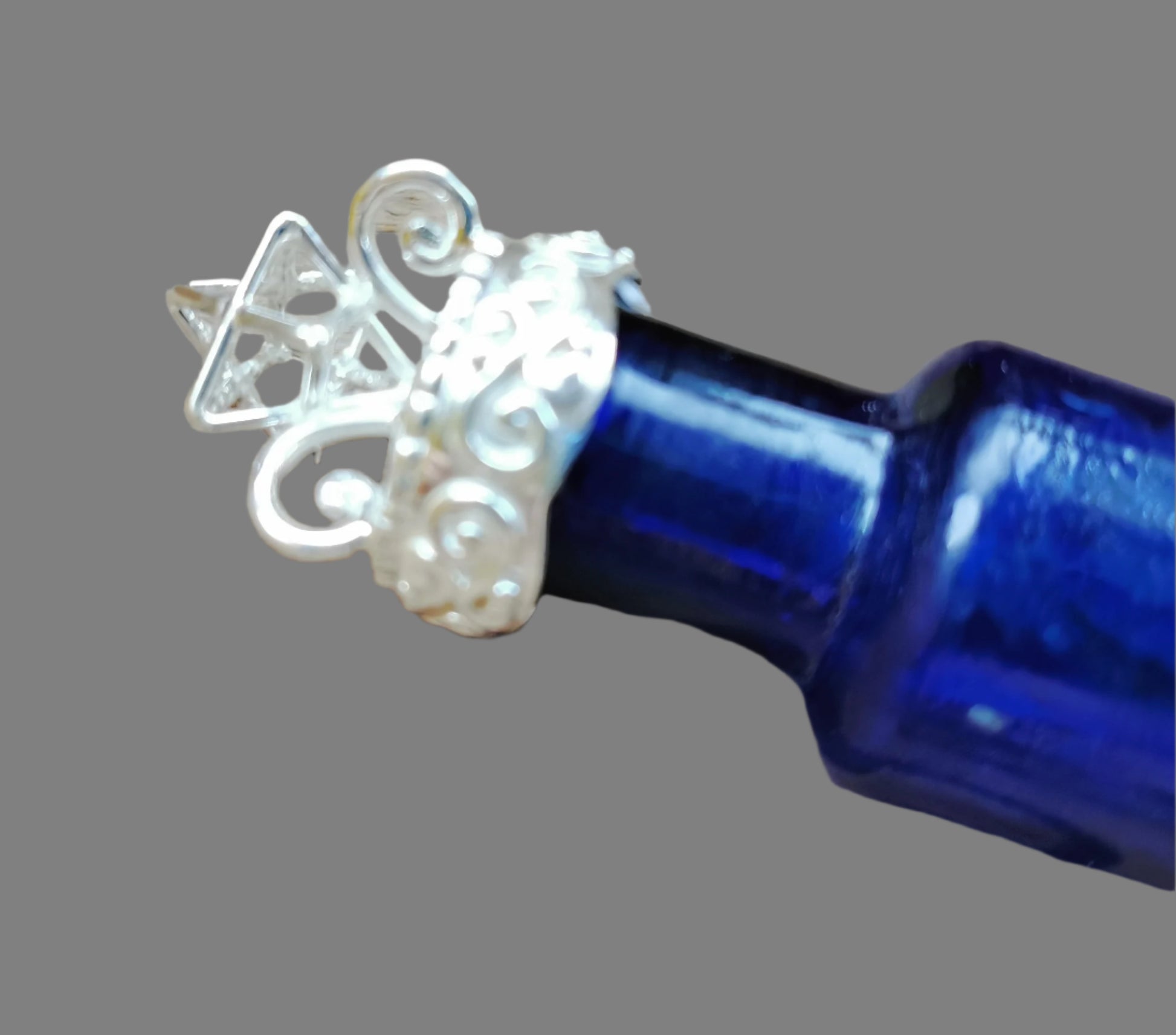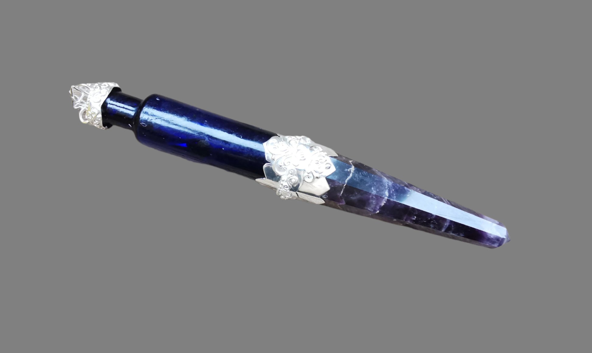 Ref.WD0471 - Silver wand with Star Tetrahedron geometry, decorated with a vintage poison blue bottle, and fluorite gemstone.