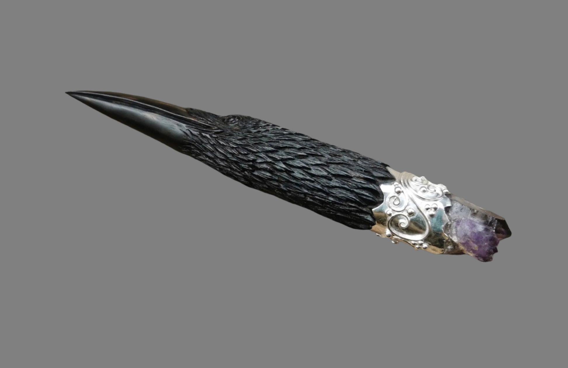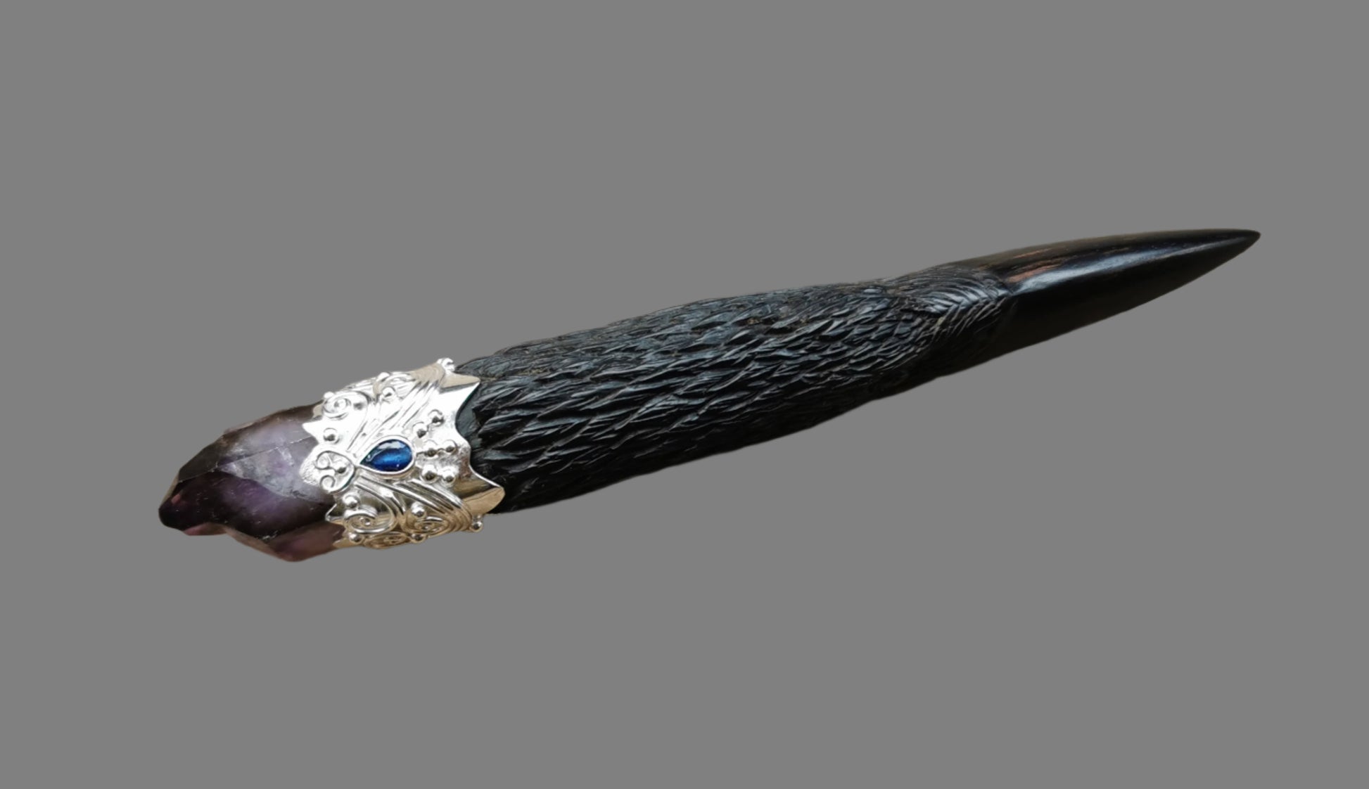 Ref.WD0475 - Silver wand with arang wood carved raven skull, Brandberg amethyst, and sapphire gemstones.