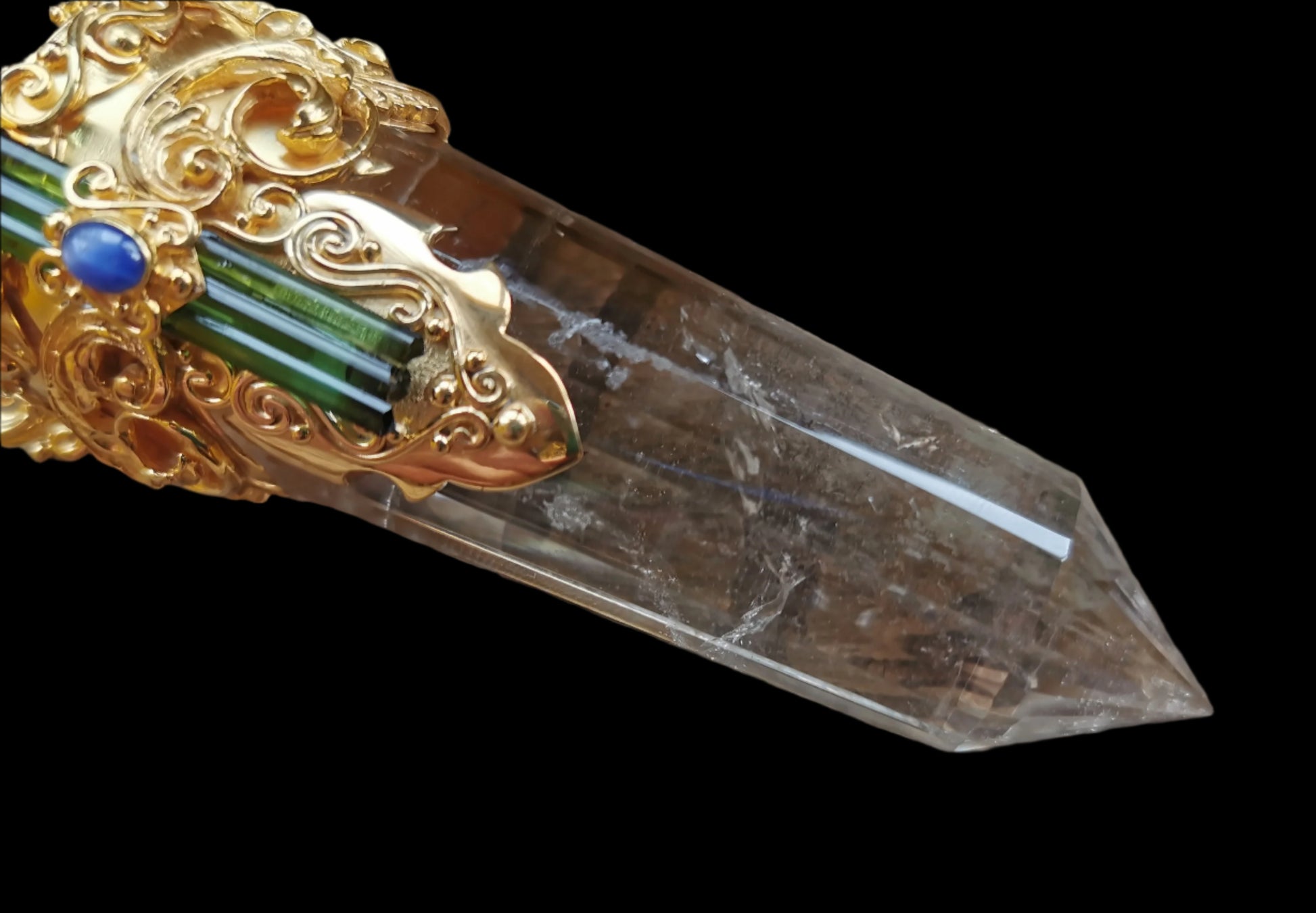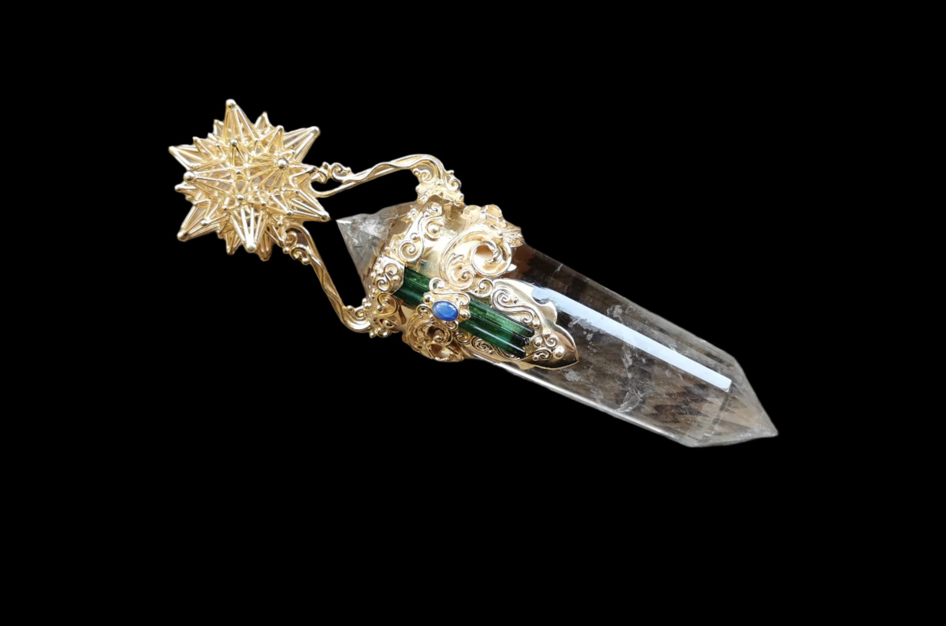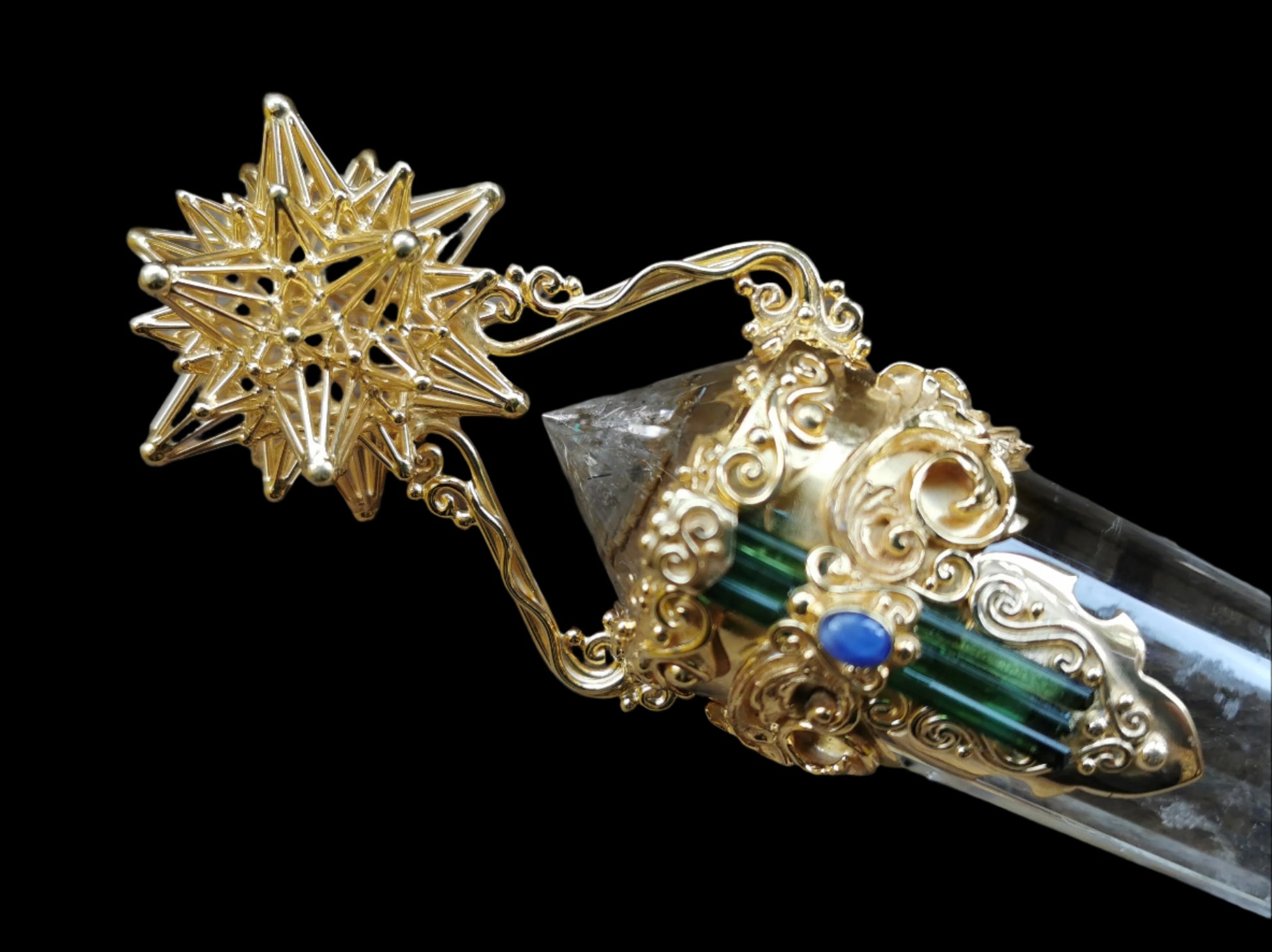 Ref.WD0476 - Gold plated on silver wand with Gaia Aqua Solar Star geometry, 24 sided Vogel quartz crystal, amethyst, tourmaline, and polished kyanite gemstones.