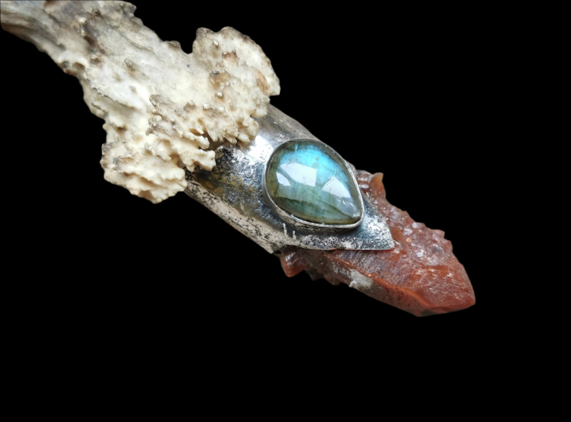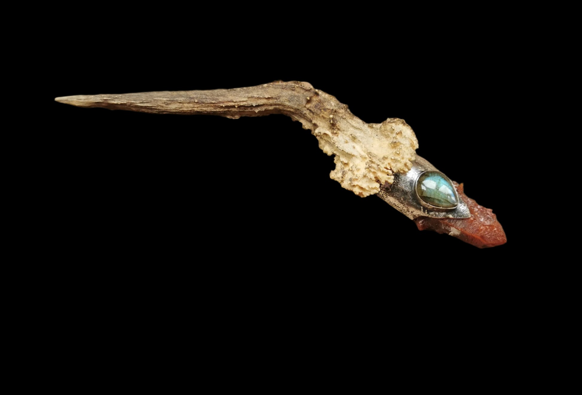Ref.WD0477 - Ecologically sourced deer horn wand with silver setting, spirit quartz crystal, and labradorite gemstone.