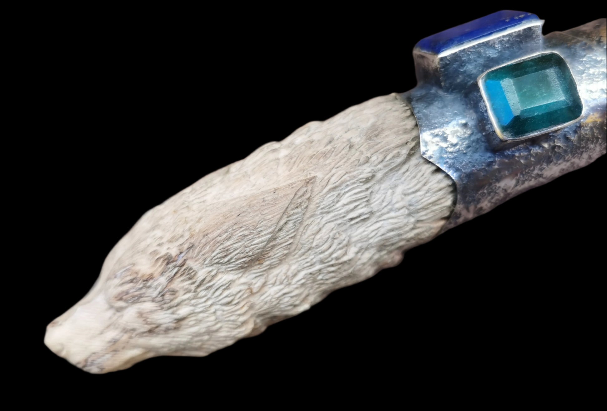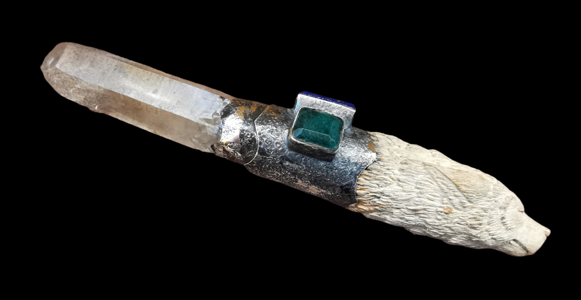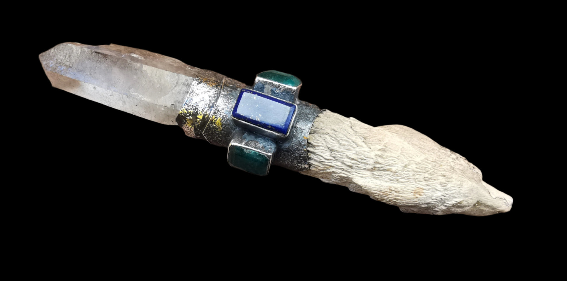 Ref.WD0481 - Silver wand with ecologically sourced deer horn carved wolf head, laser quartz crystal, lapis lazuli, and green onyx gemstones.