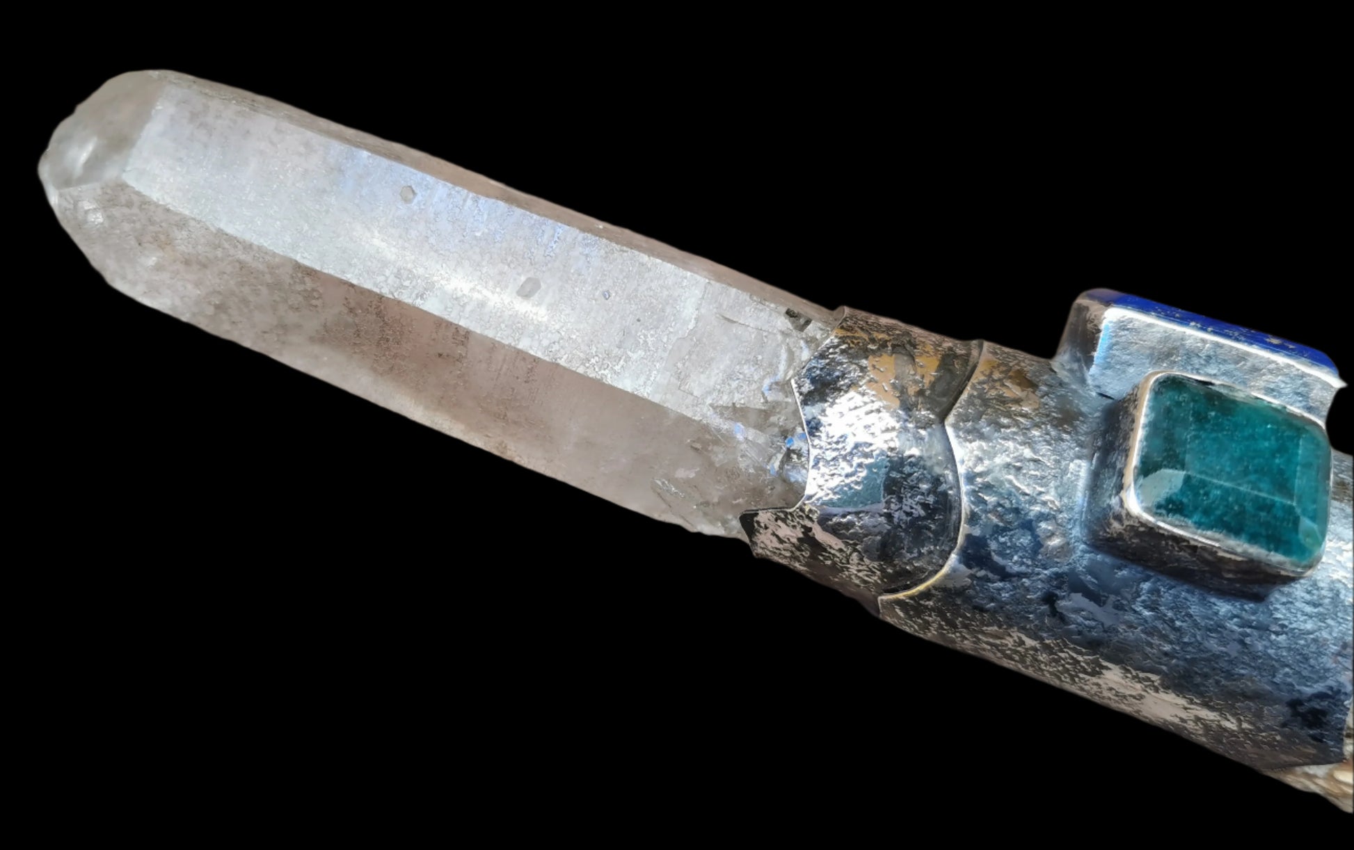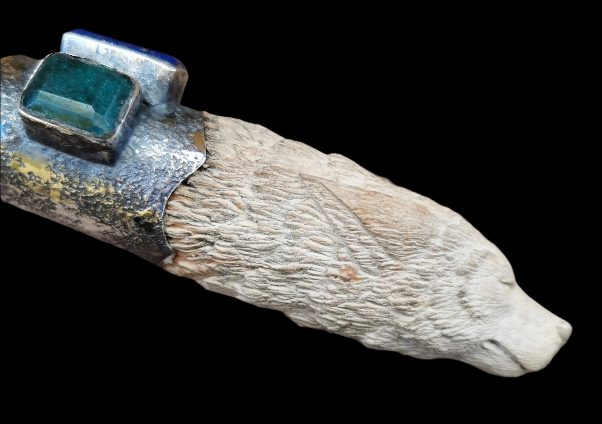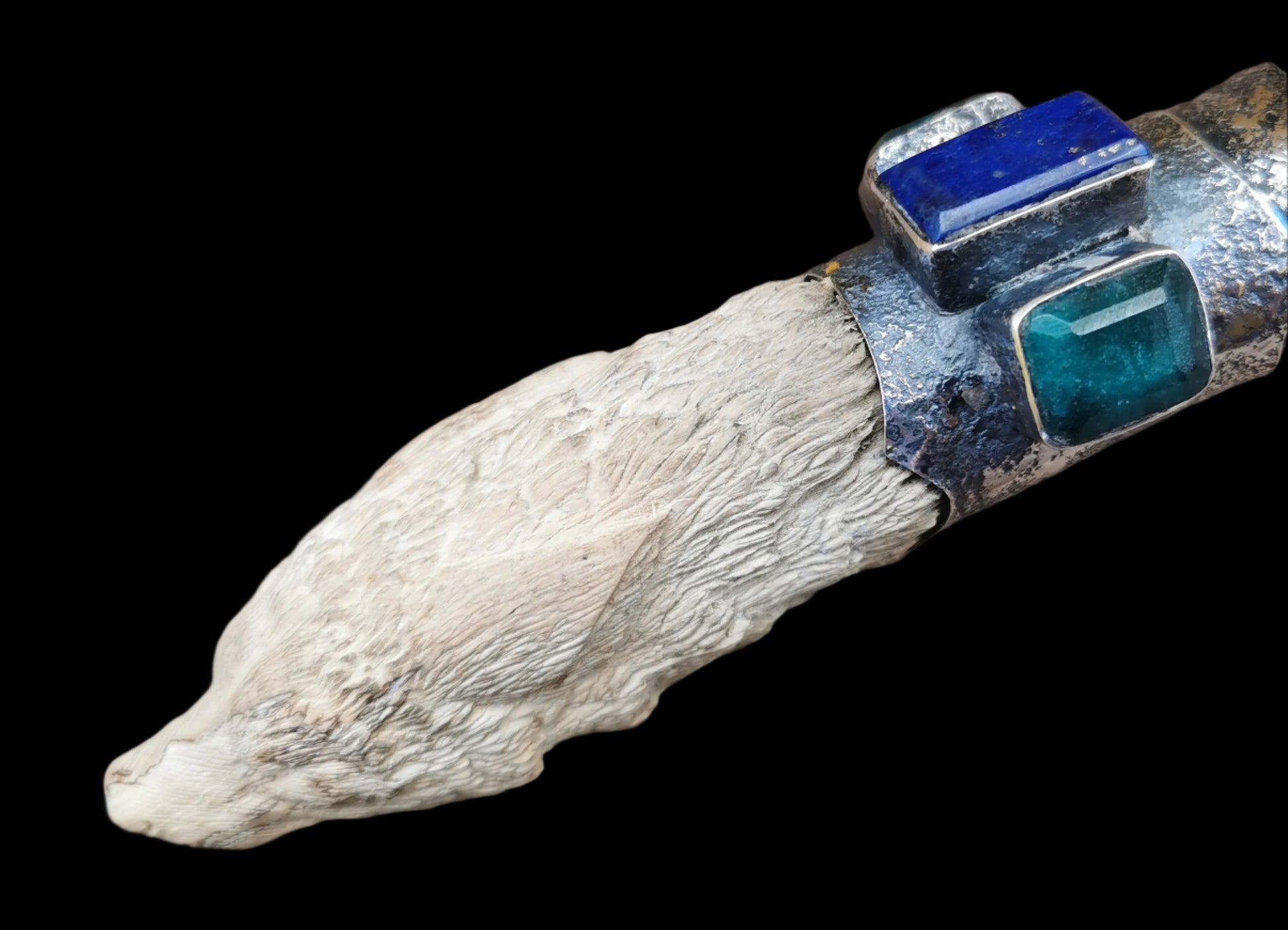 Ref.WD0481 - Silver wand with ecologically sourced deer horn carved wolf head, laser quartz crystal, lapis lazuli, and green onyx gemstones.