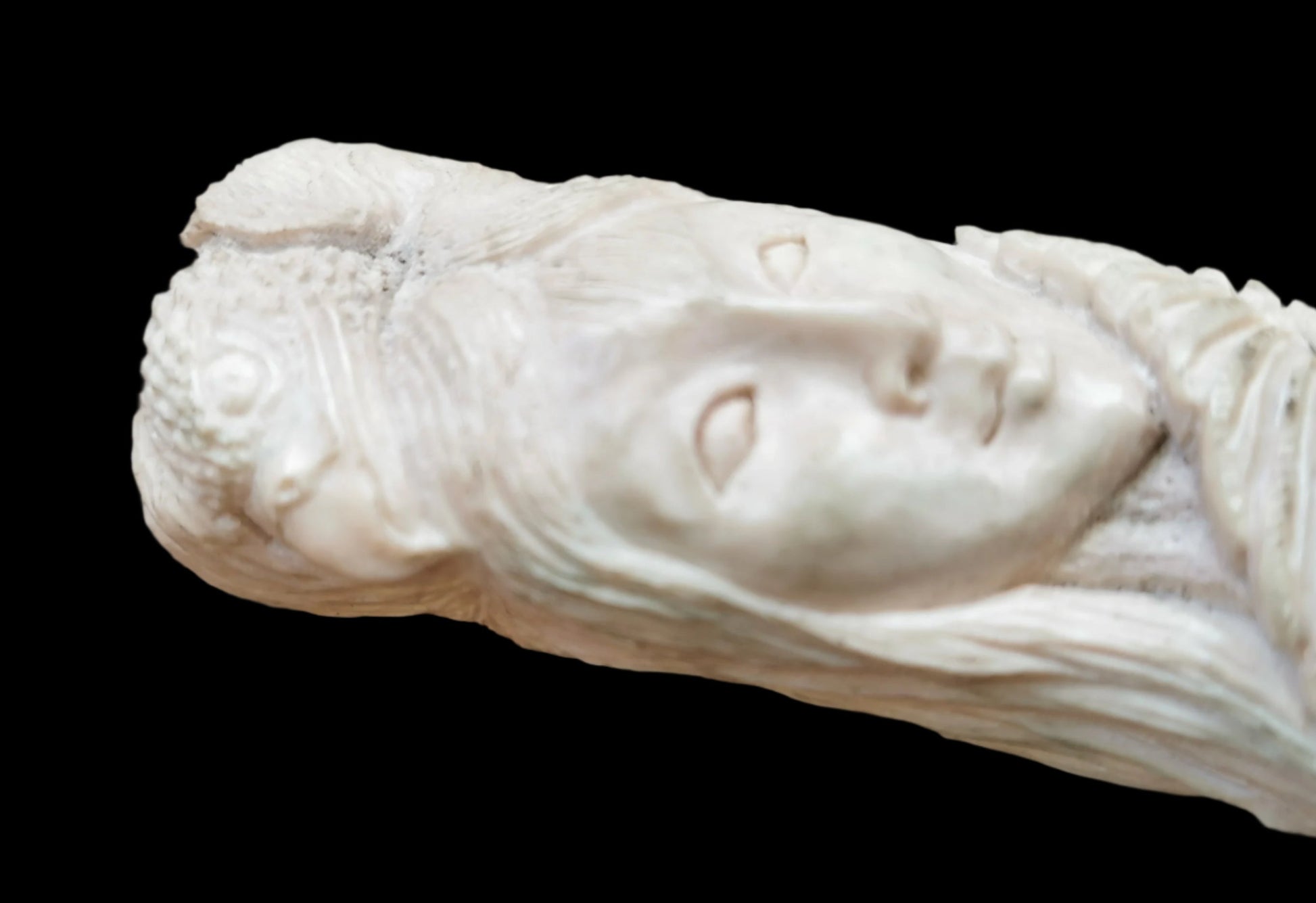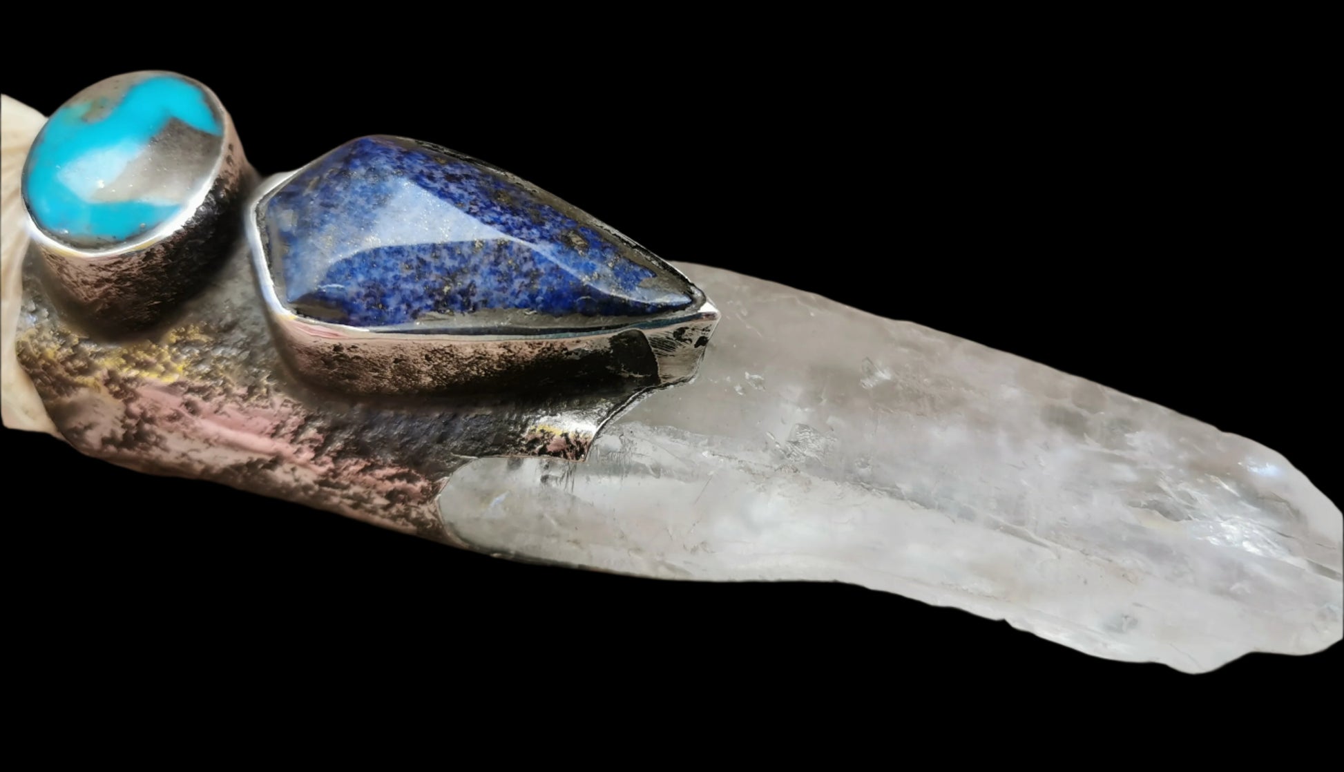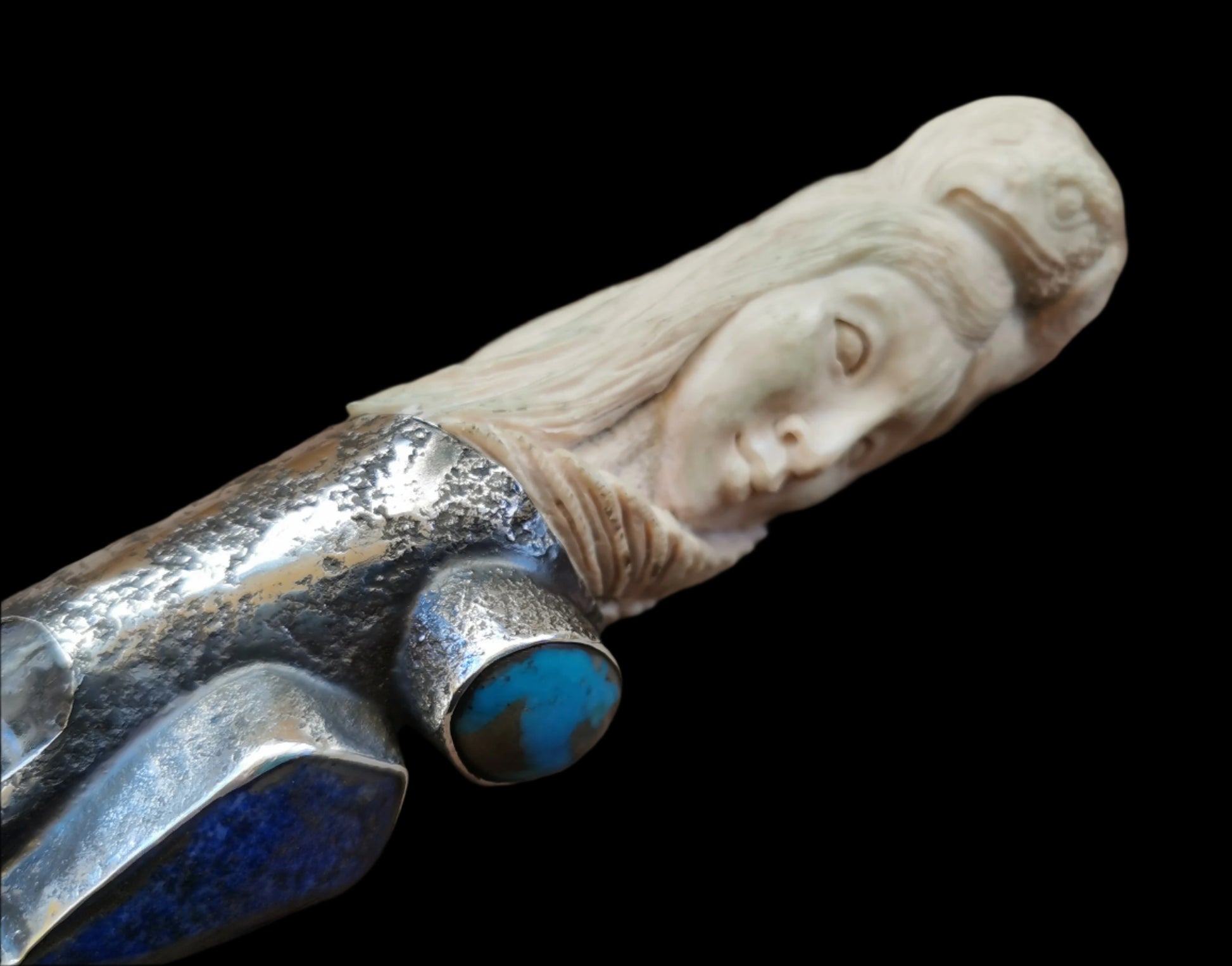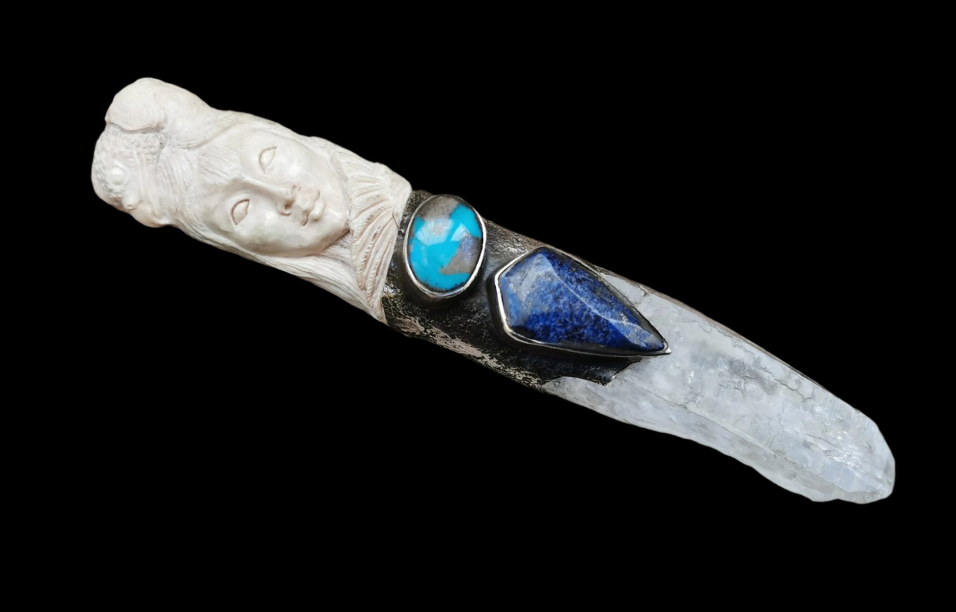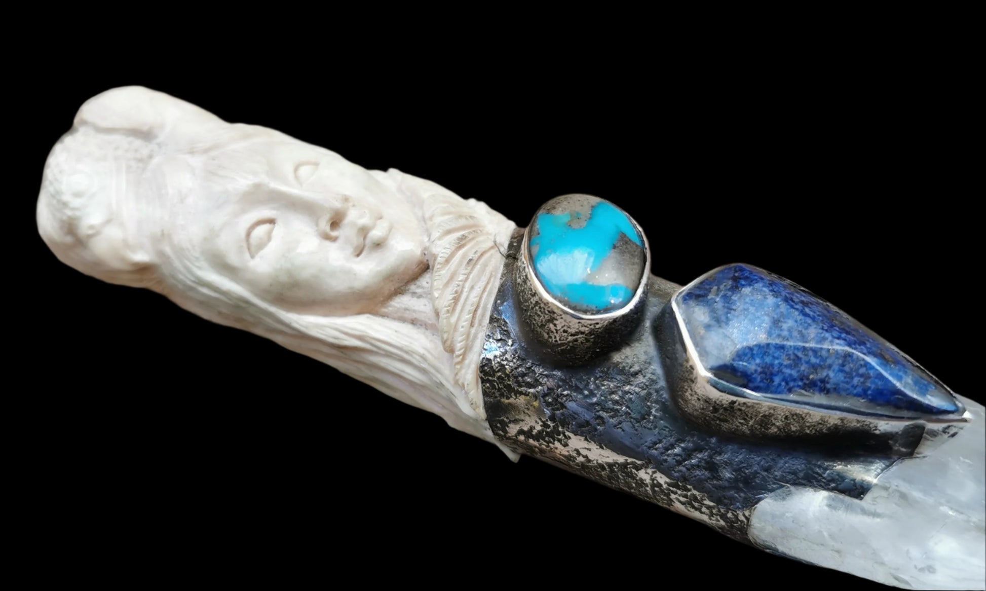 Ref.WD0482 - Silver wand with ecologically sourced deer horn carved woman head with eagle, laser quartz crystal, lapis lazuli and turquoise gemstones.