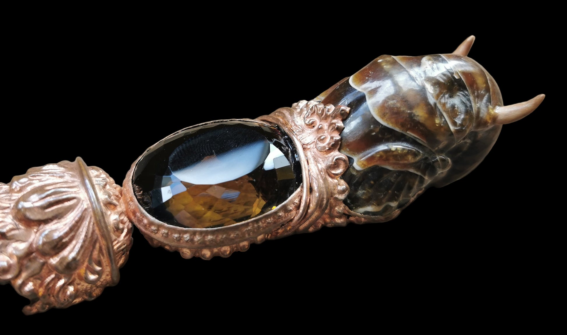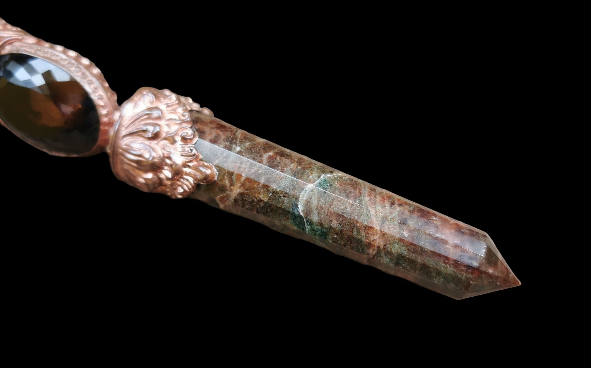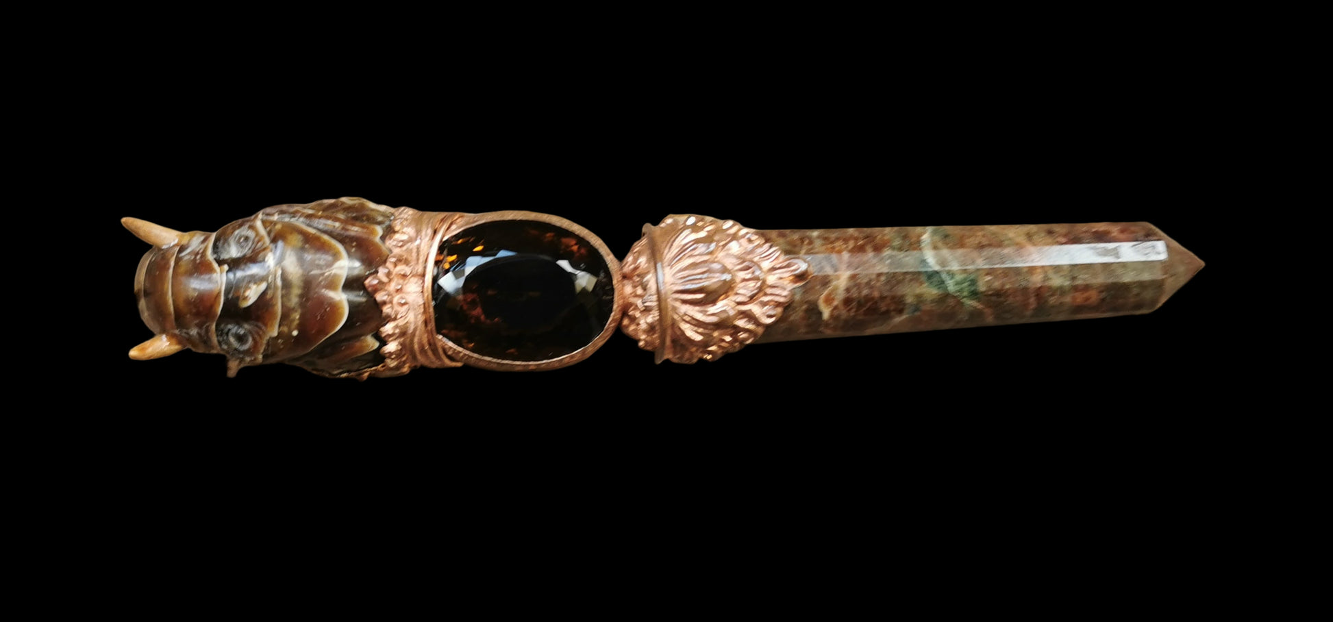 Ref.WD0494 - Copper wand with ammonite fossil carved elephant, citrine, and garnet gemstones.