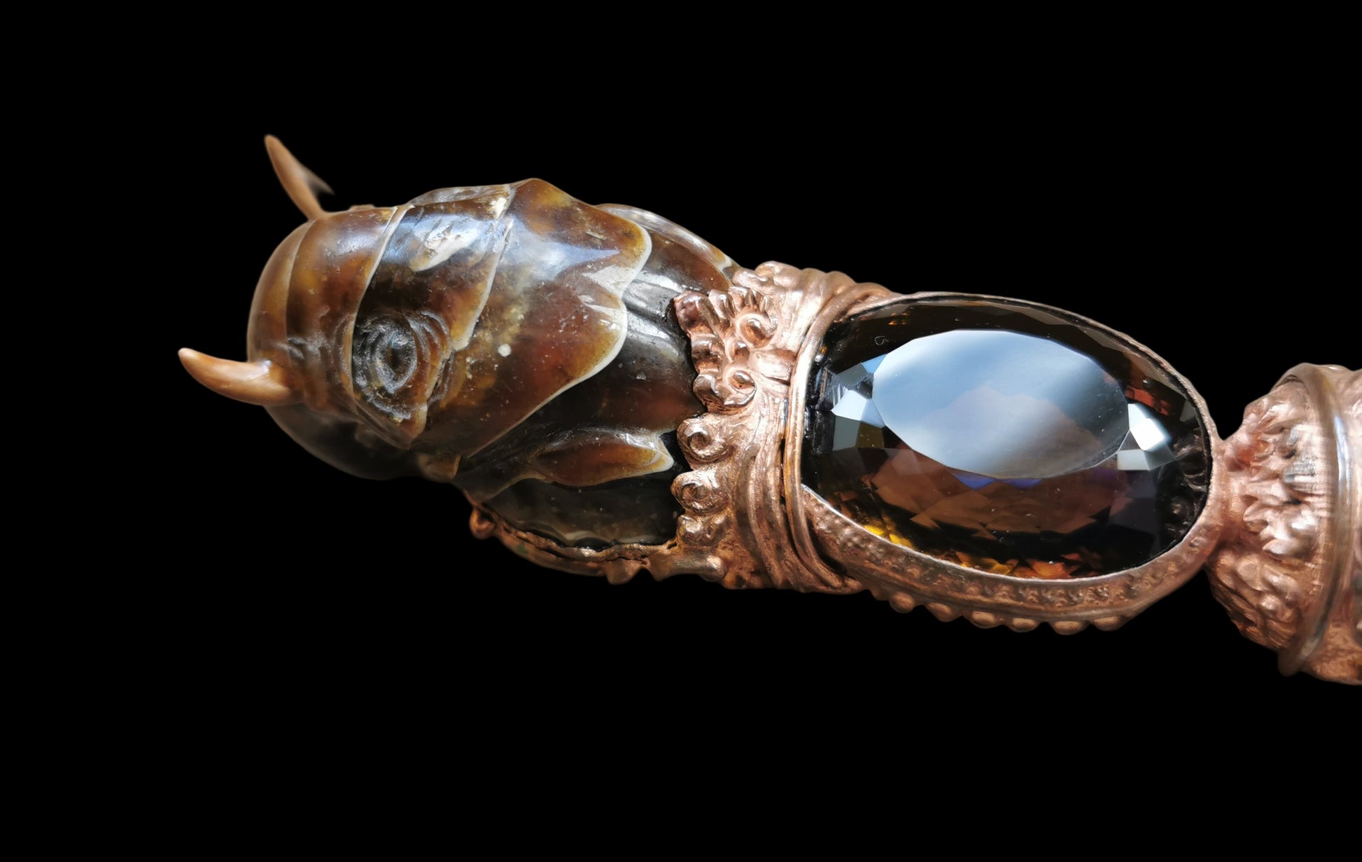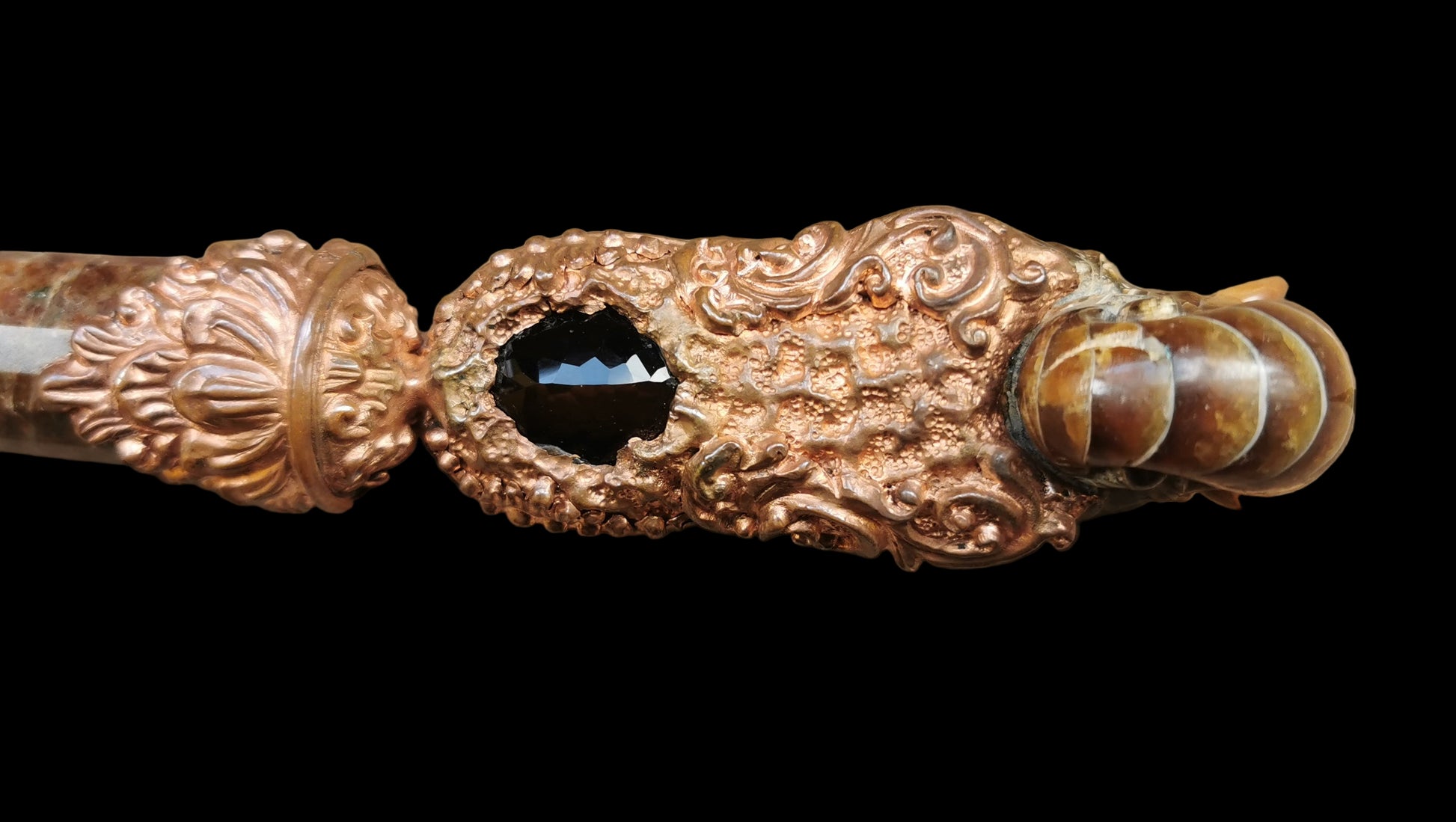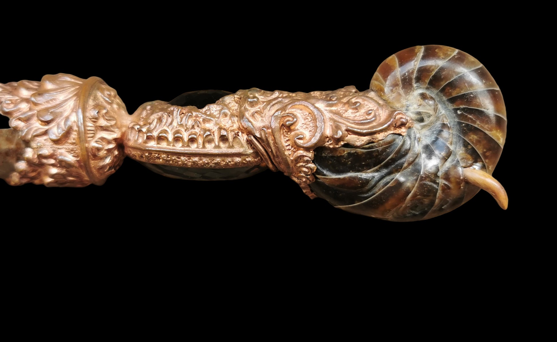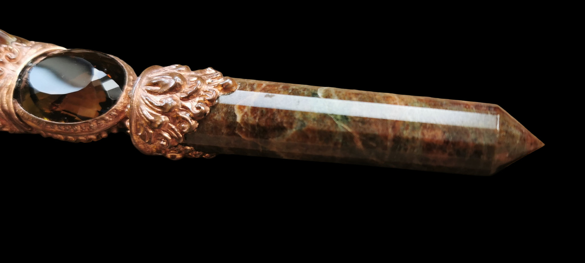 Ref.WD0494 - Copper wand with ammonite fossil carved elephant, citrine, and garnet gemstones.
