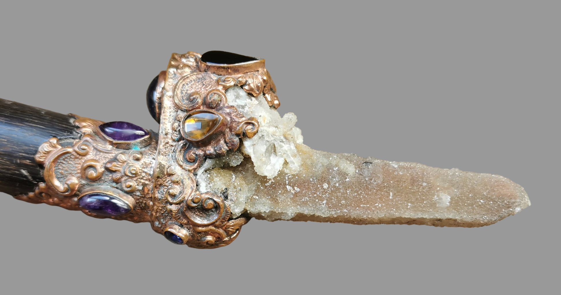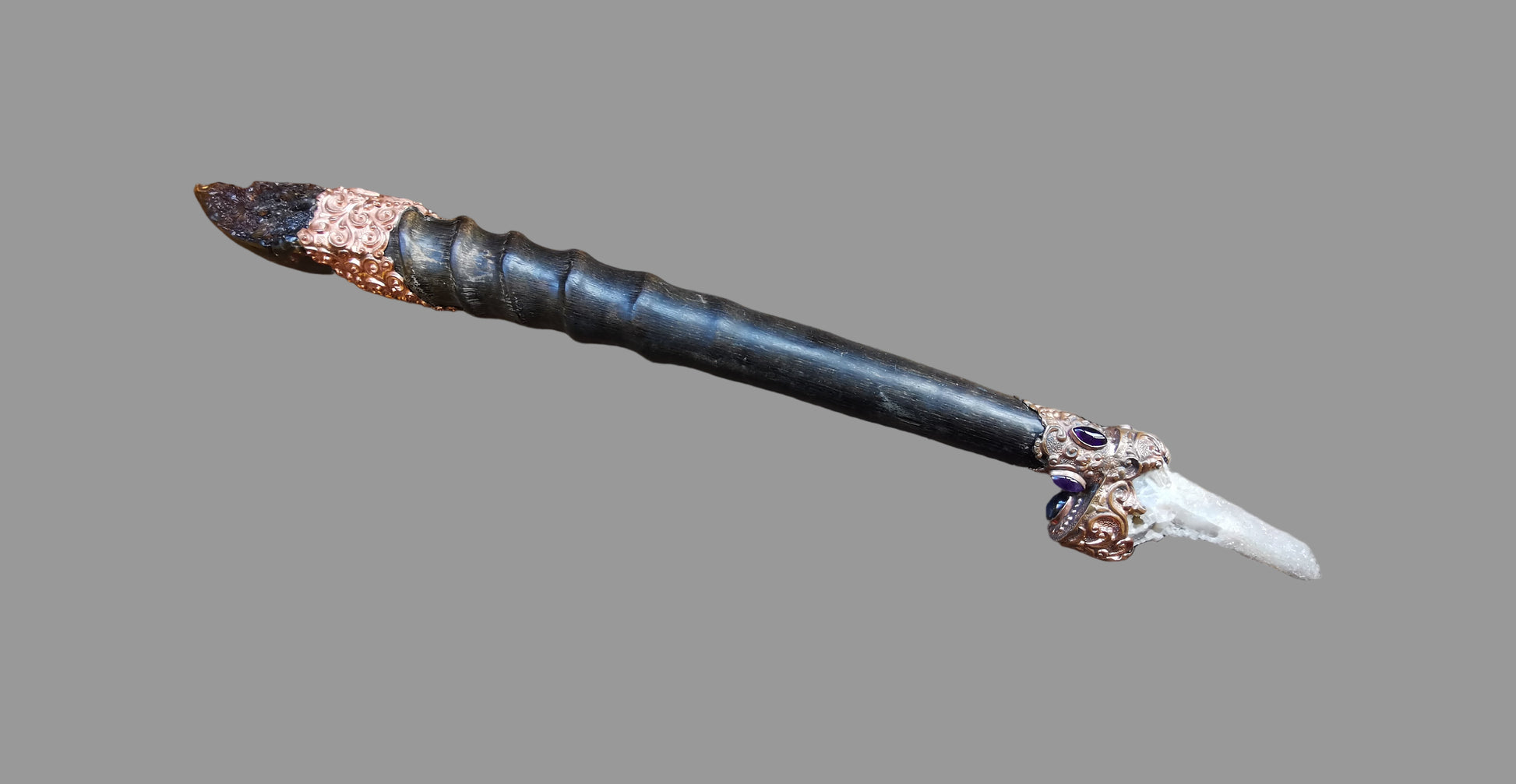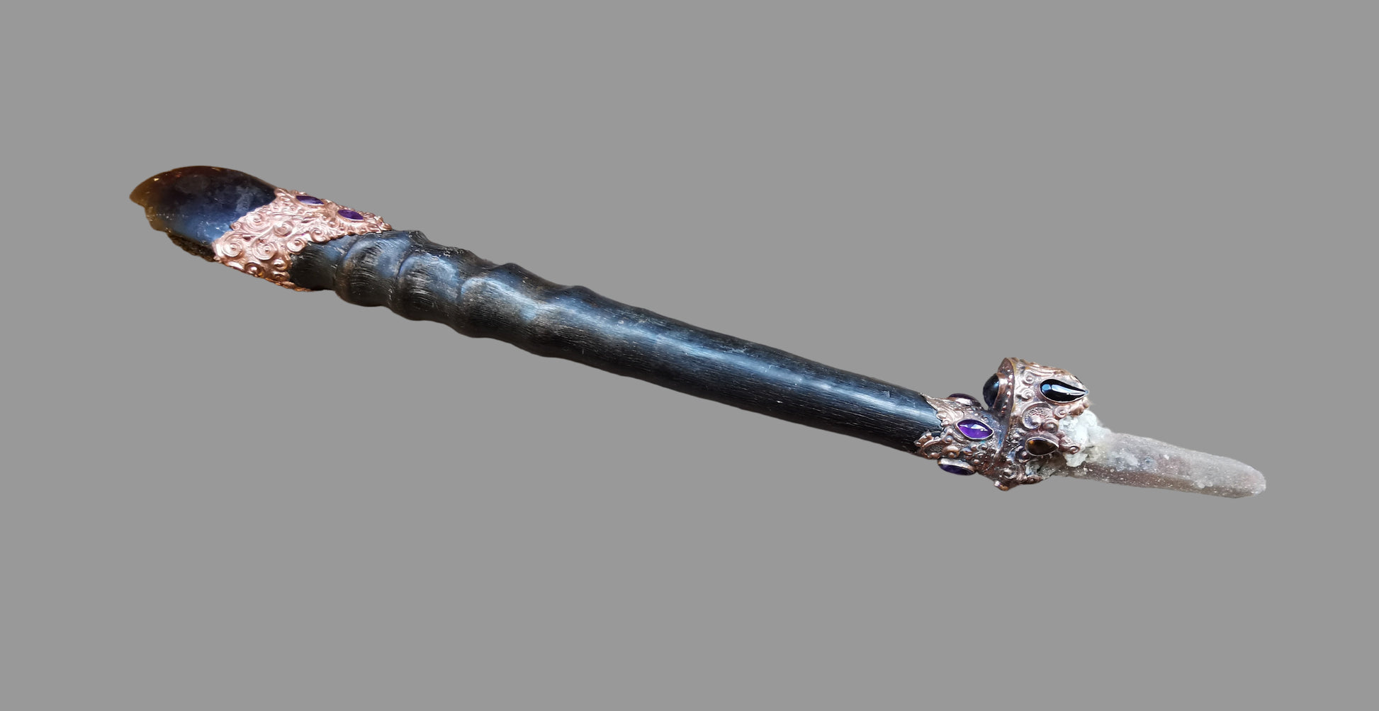 Ref.WD0496 - Copper wand with ecologically sourced gemsbok horn as handle, spirit quartz crystal, amber, sapphire, citrine, garnet, kyanite, and amethyst gemstone.