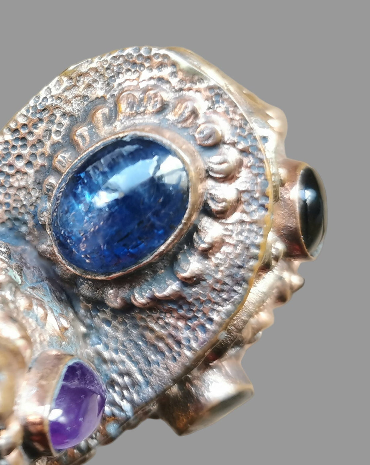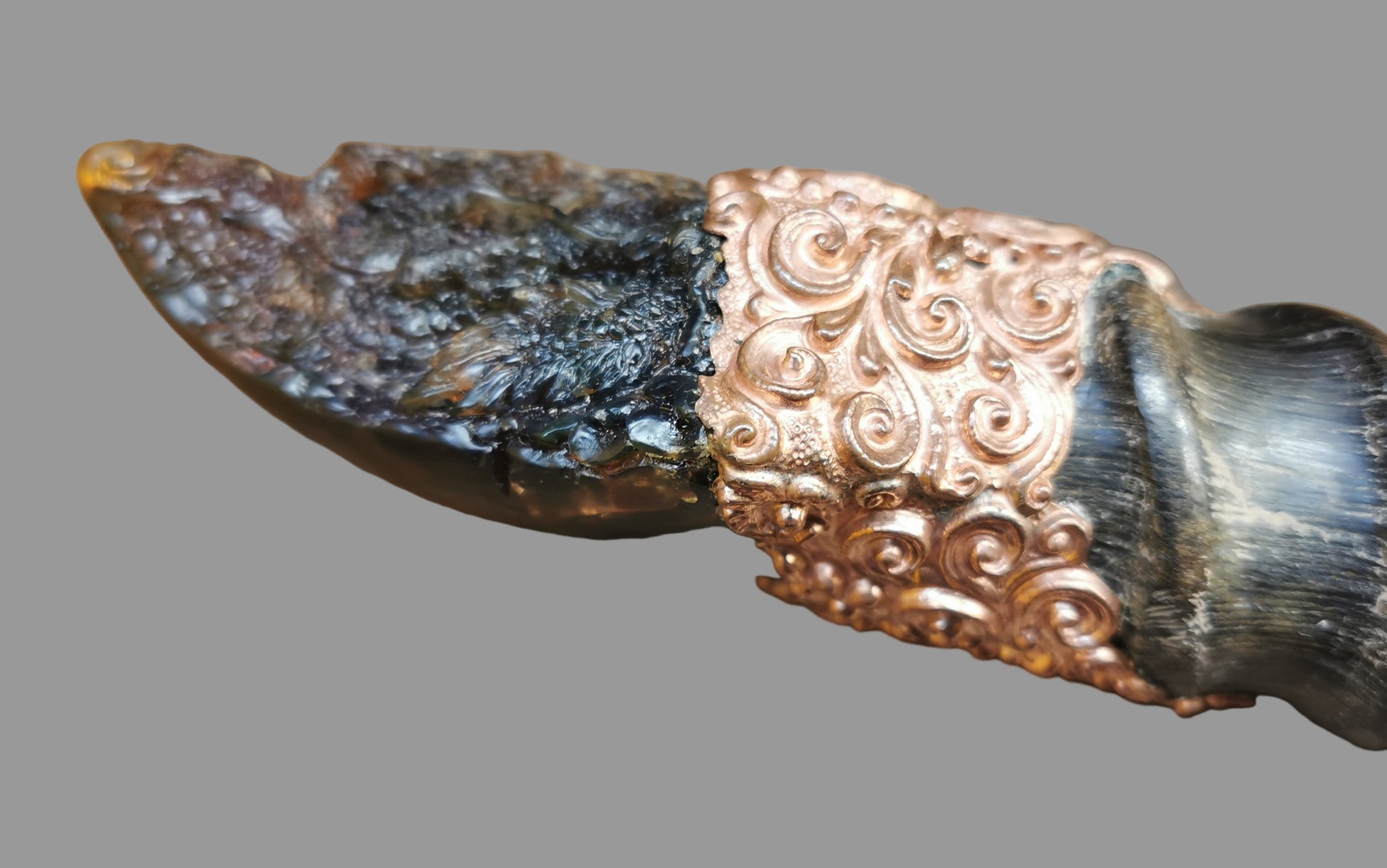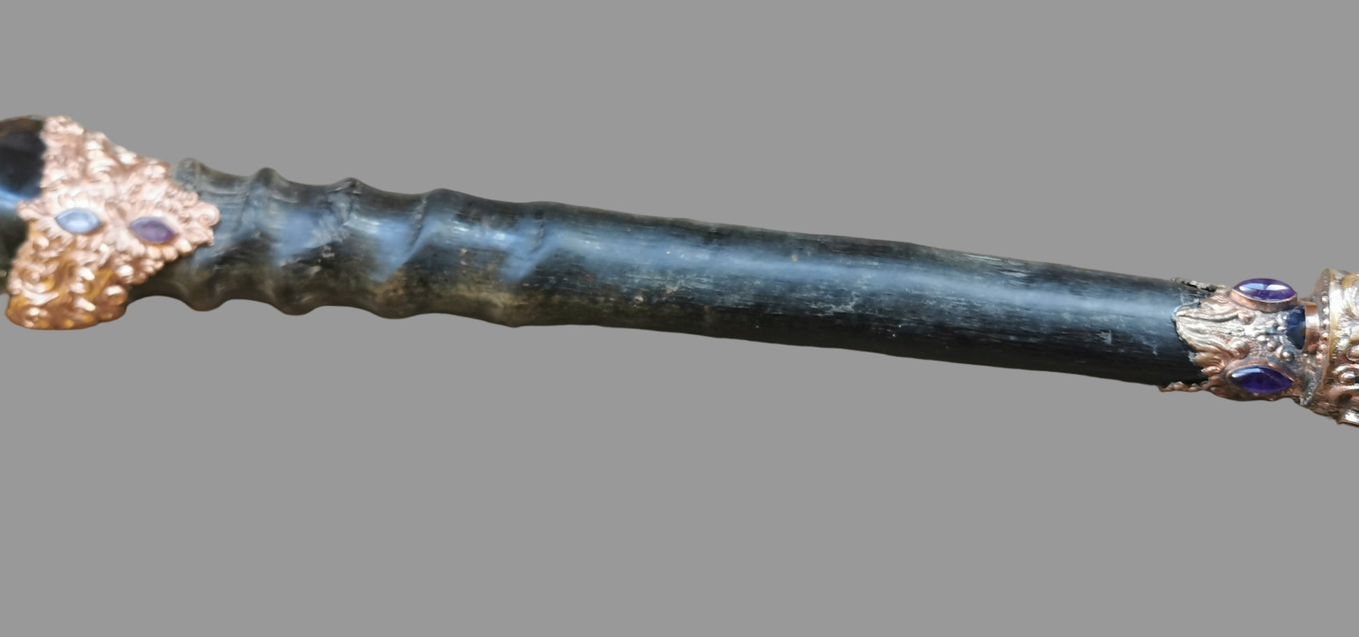 Ref.WD0496 - Copper wand with ecologically sourced gemsbok horn as handle, spirit quartz crystal, amber, sapphire, citrine, garnet, kyanite, and amethyst gemstone.