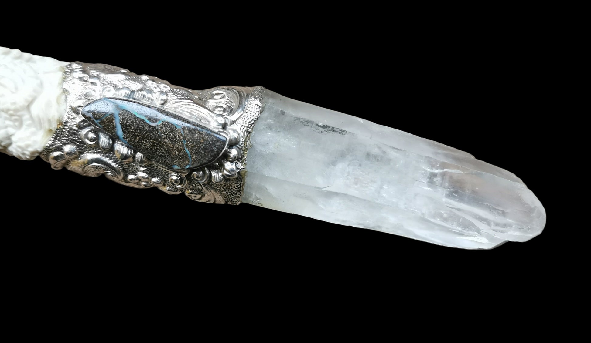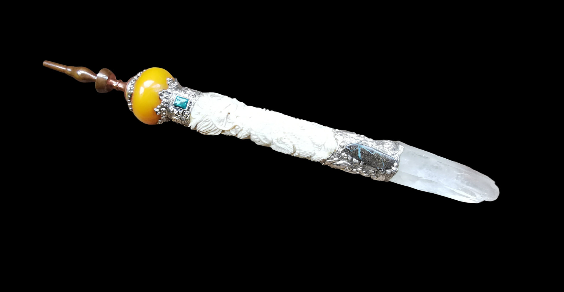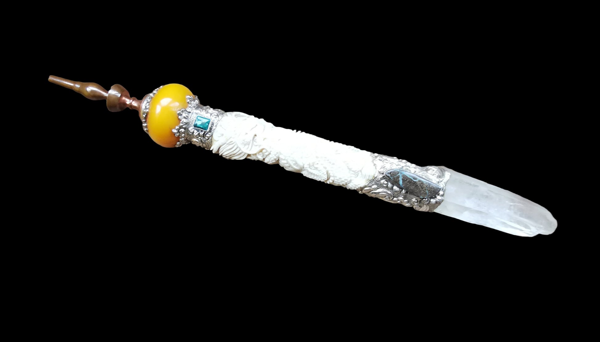 Ref.WD0500 - Silver/copper wand with ecologically sourced deer horn carved dragon, Tibetan amber bead, laser quartz crystal, turquoise, and matrix opal gemstones.