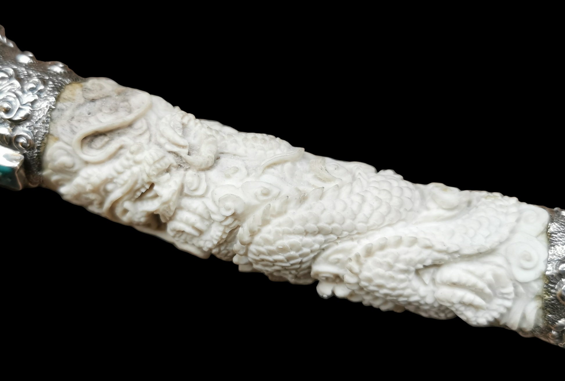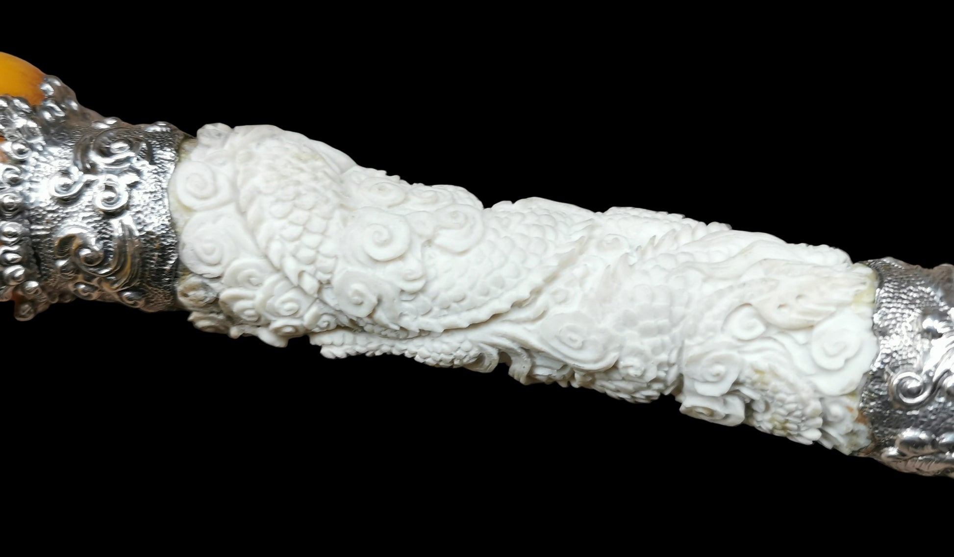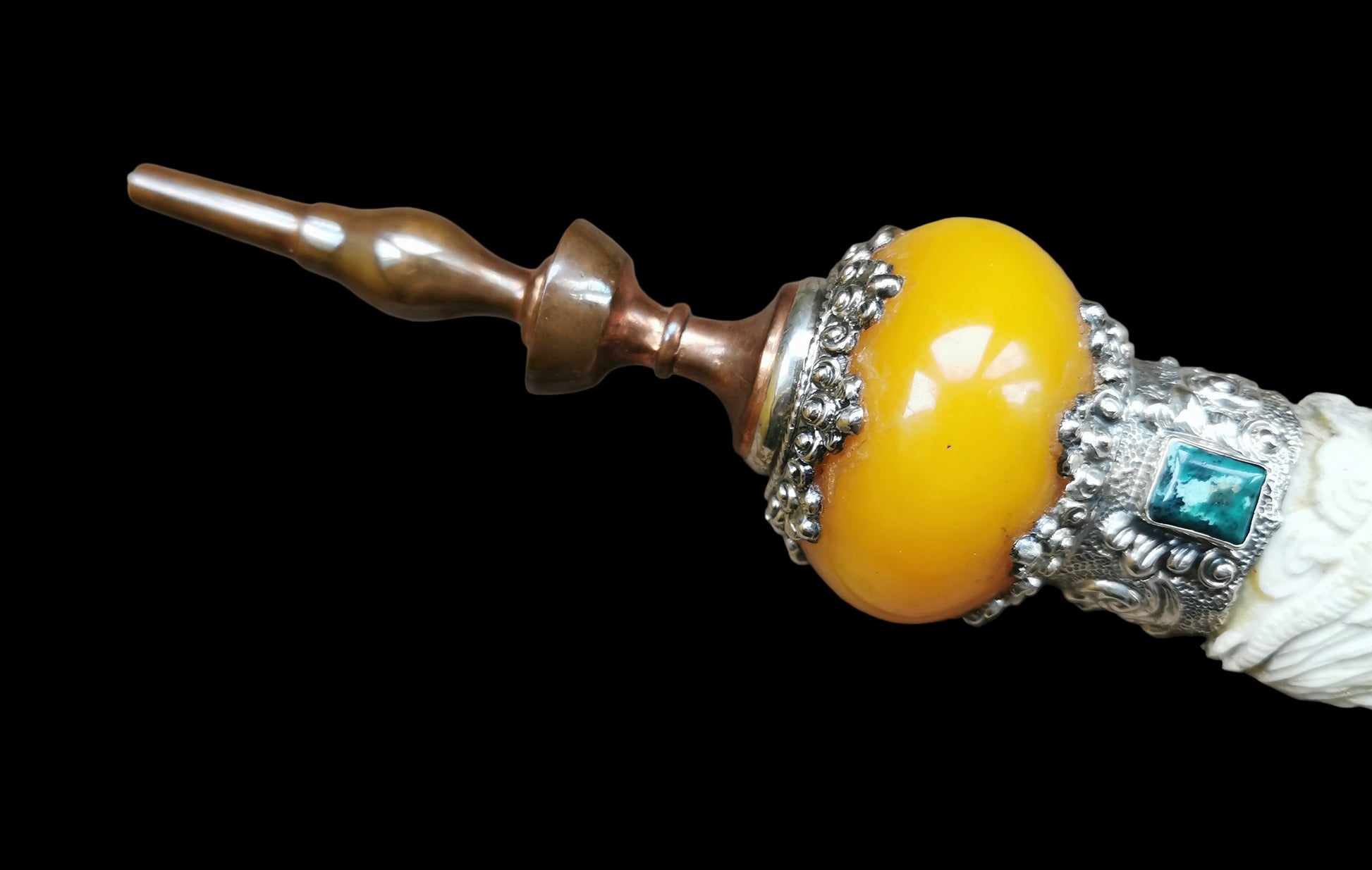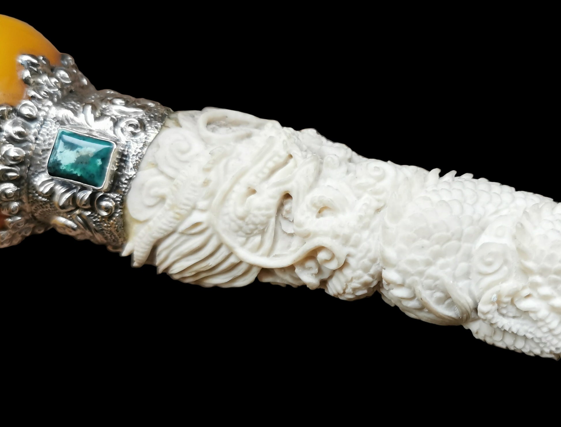 Ref.WD0500 - Silver/copper wand with ecologically sourced deer horn carved dragon, Tibetan amber bead, laser quartz crystal, turquoise, and matrix opal gemstones.