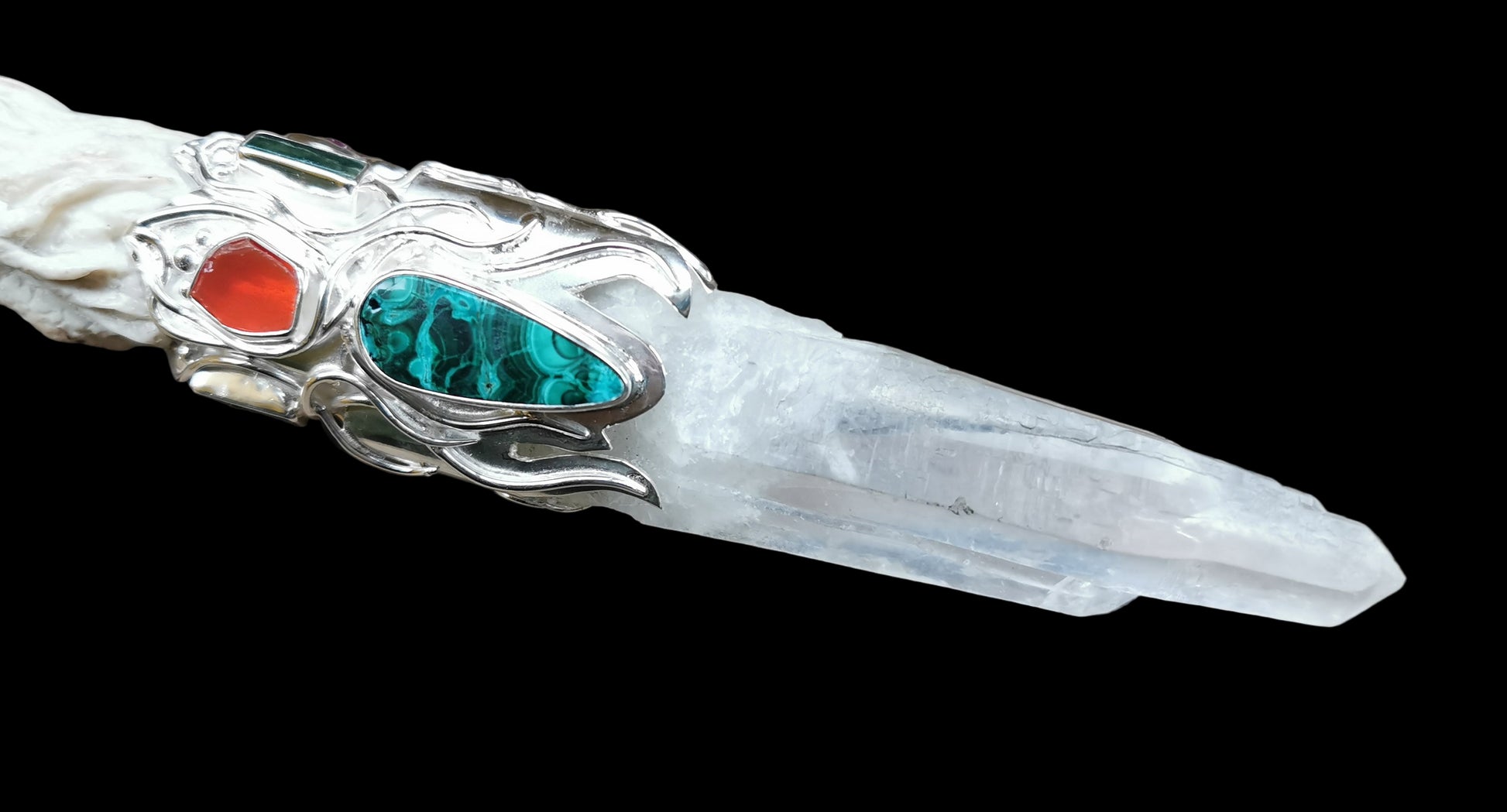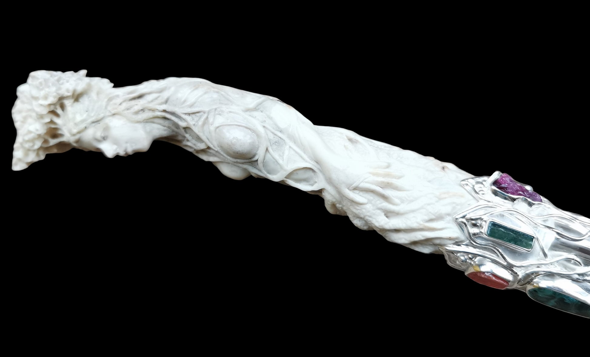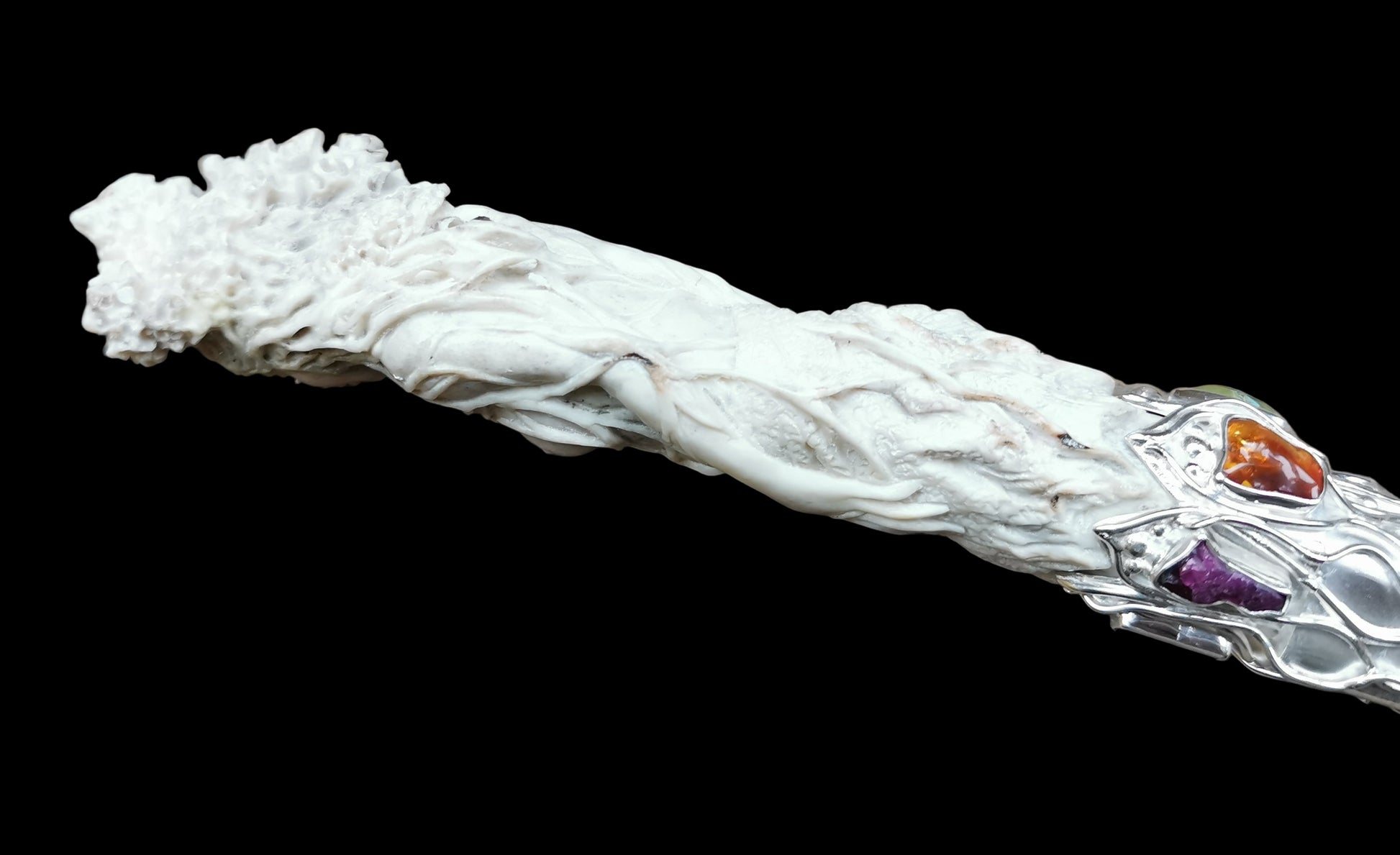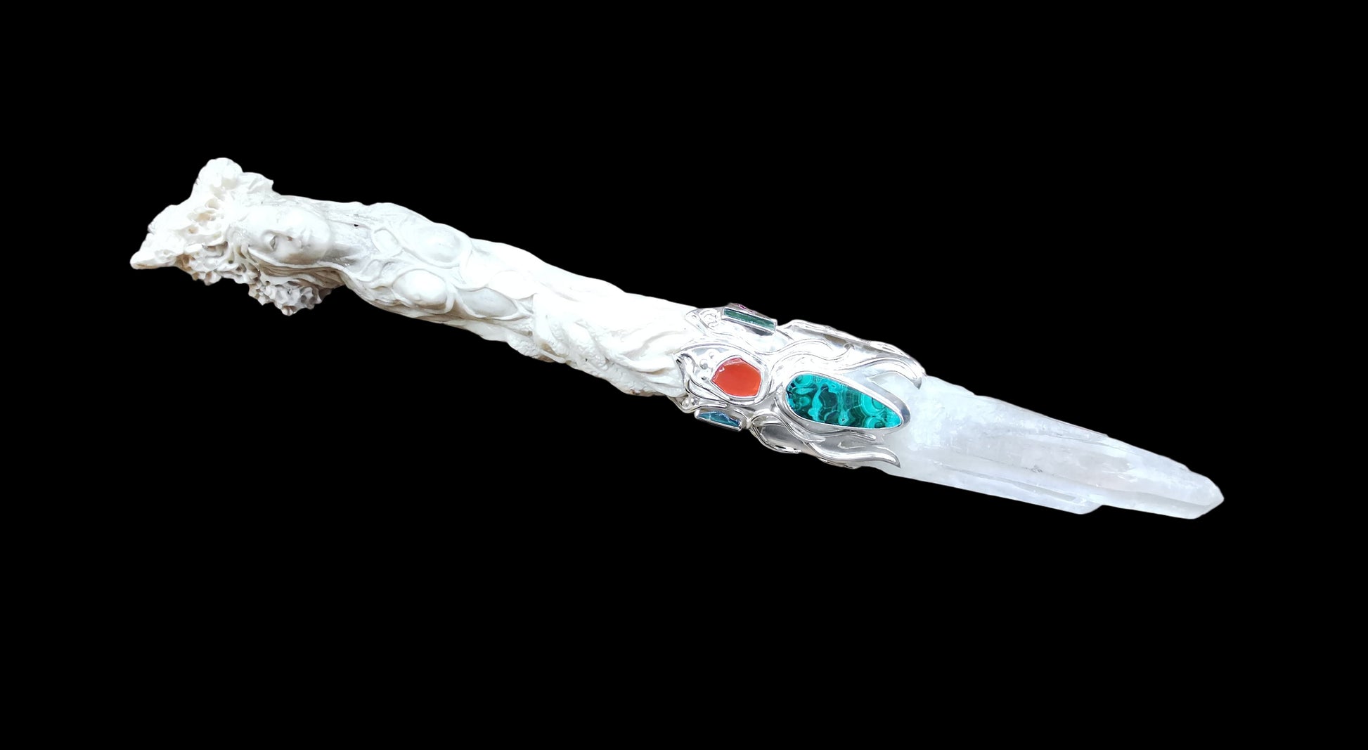 Ref.WD0501 - Silver wand with ecologically sourced deer horn carved Green woman, laser quartz crystal, amber, malachite, tourmaline, ruby, turquoise, and carnelian gemstones.