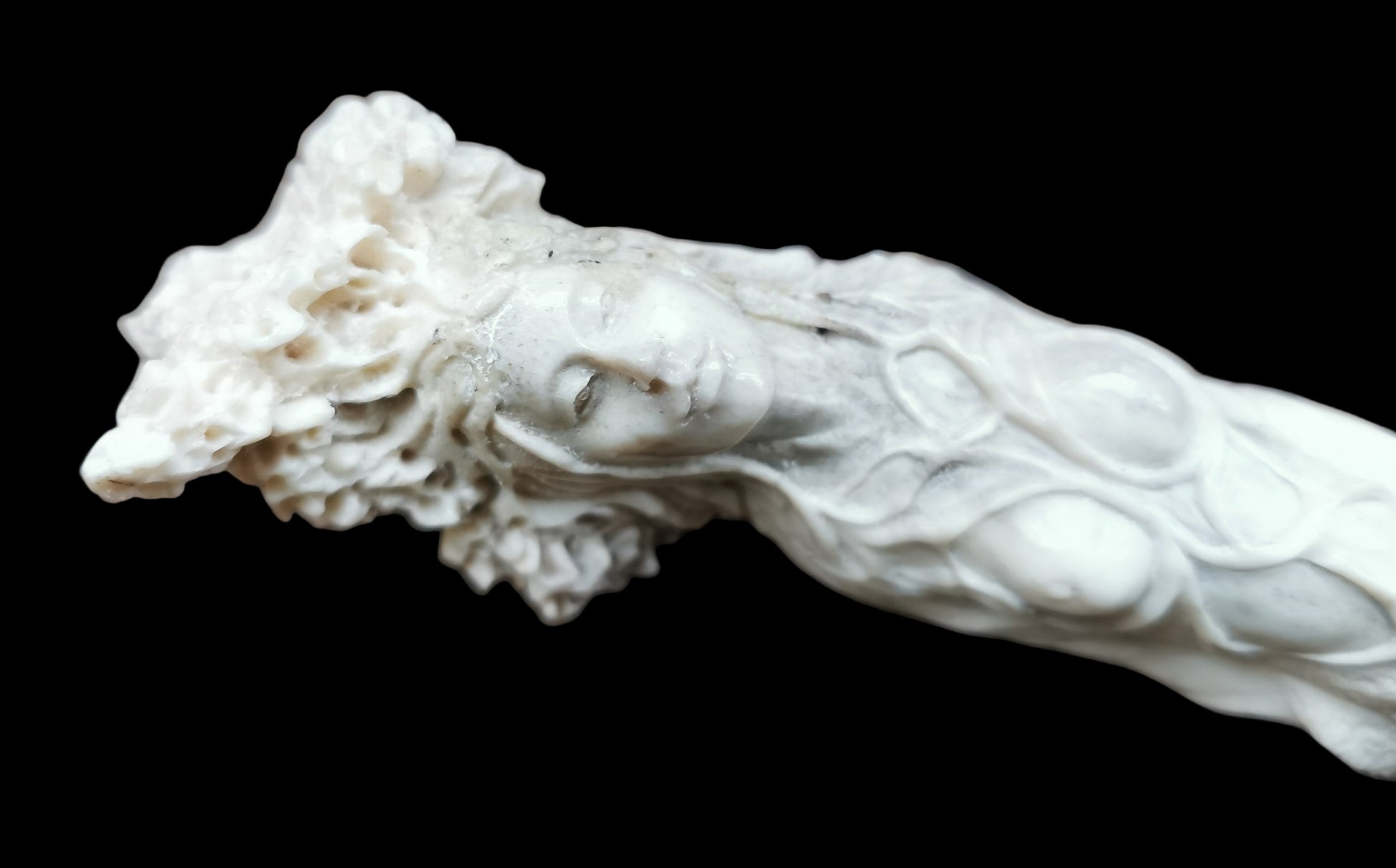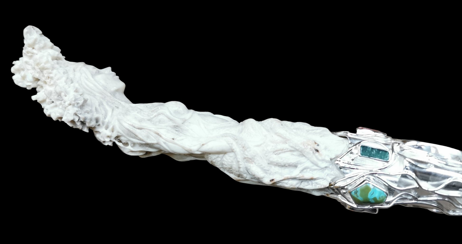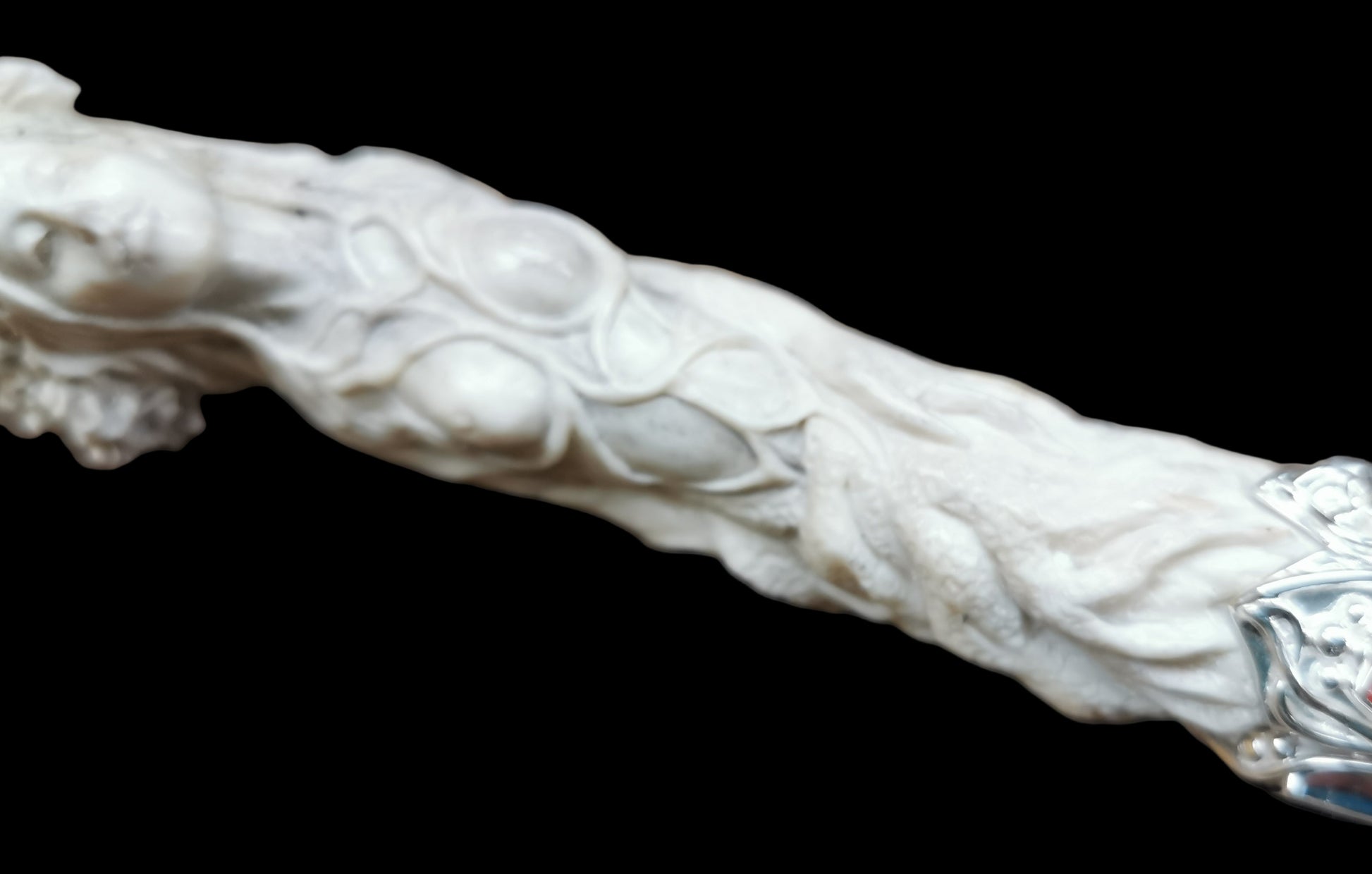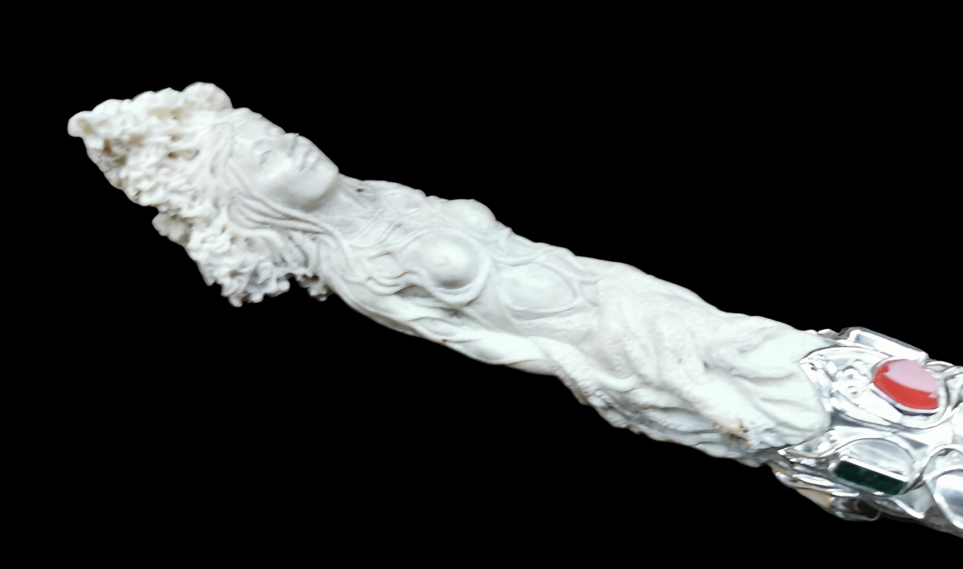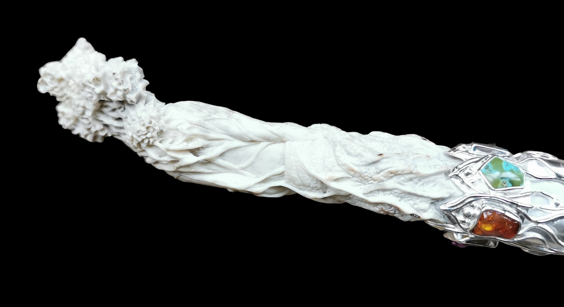 Ref.WD0501 - Silver wand with ecologically sourced deer horn carved Green woman, laser quartz crystal, amber, malachite, tourmaline, ruby, turquoise, and carnelian gemstones.