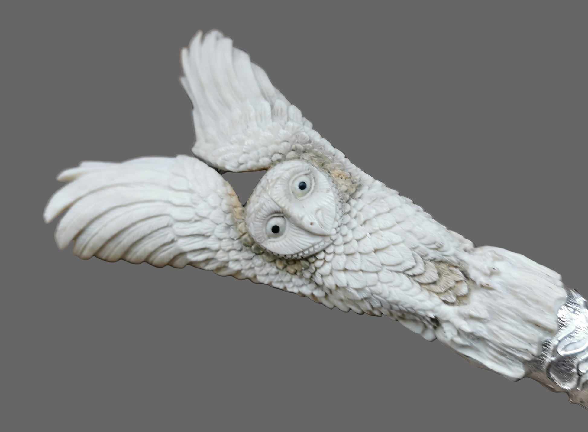 Ref.WD0502 - Silver wand with ecologically sourced deer horn carved owls, obsidian, and peridot gemstones.