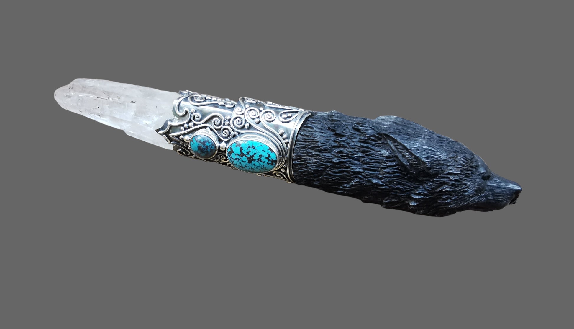 Ref.WD0506 - Silver wand with arang wood carved wolf head, laser quartz crystal, and turquoise gemstones.