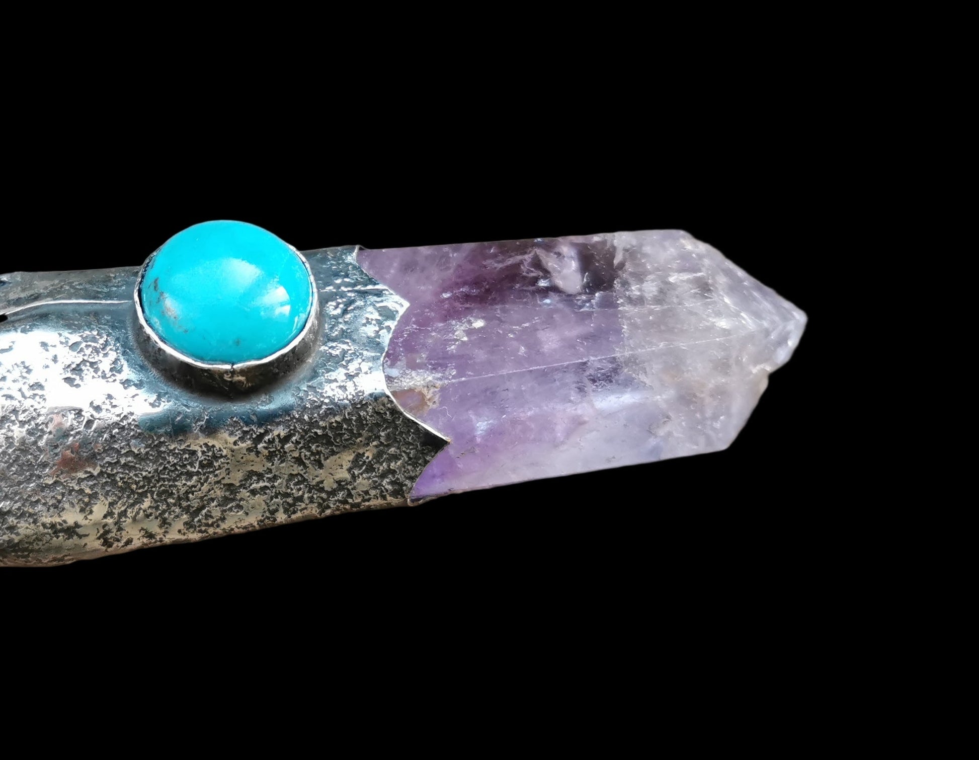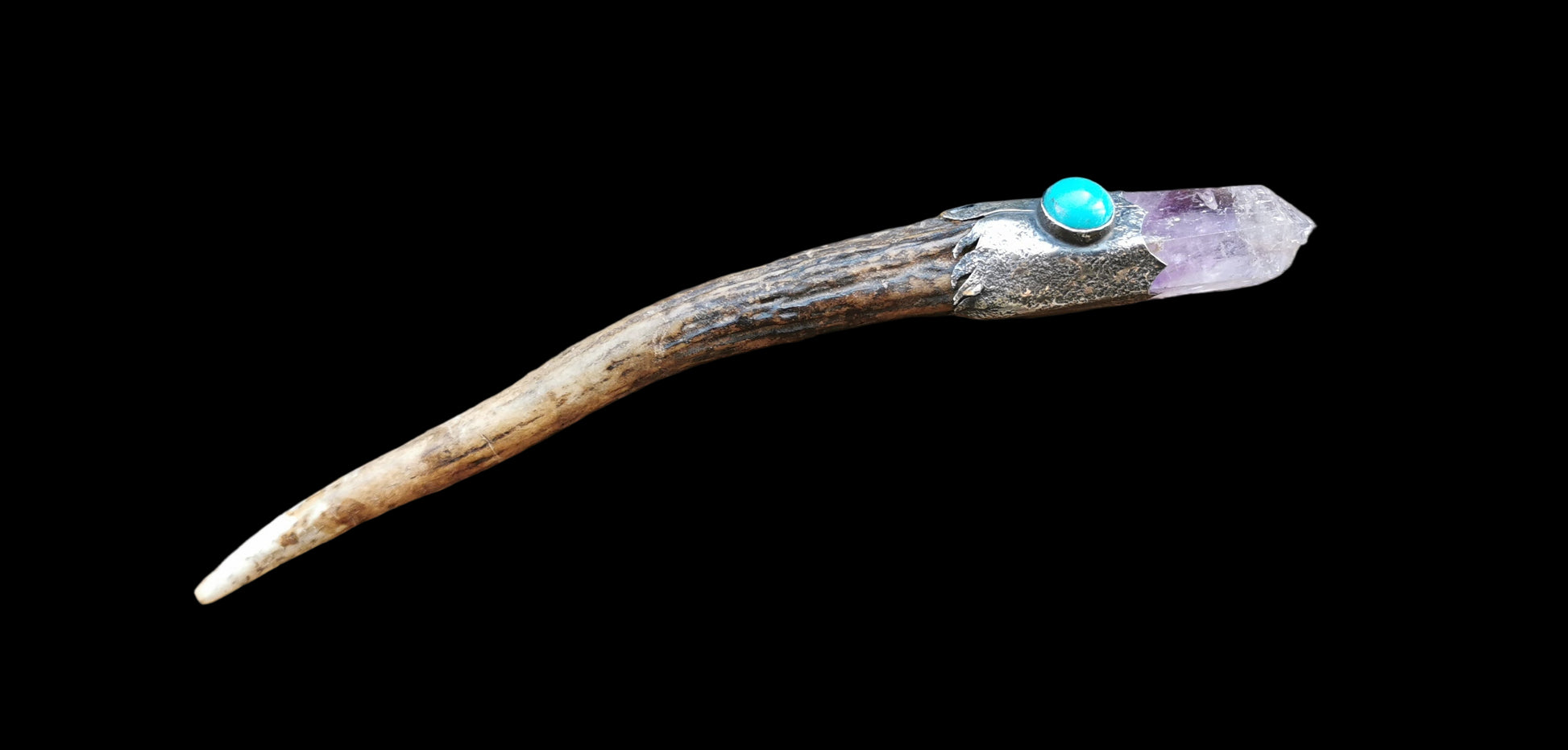 Ref.WD0513 - Silver wand with ecologically sourced deer horn as handle, turquoise, and amethyst gemstone.