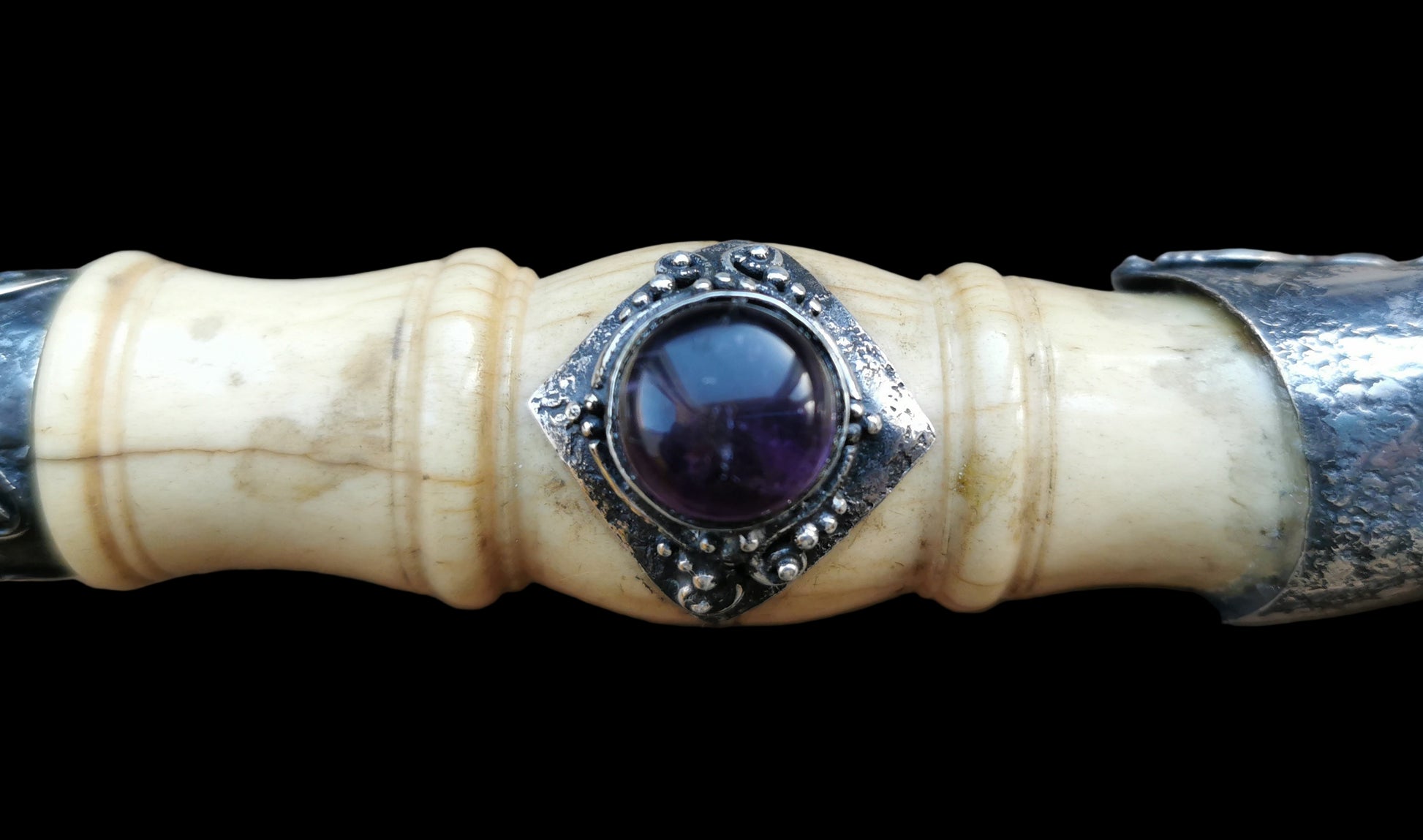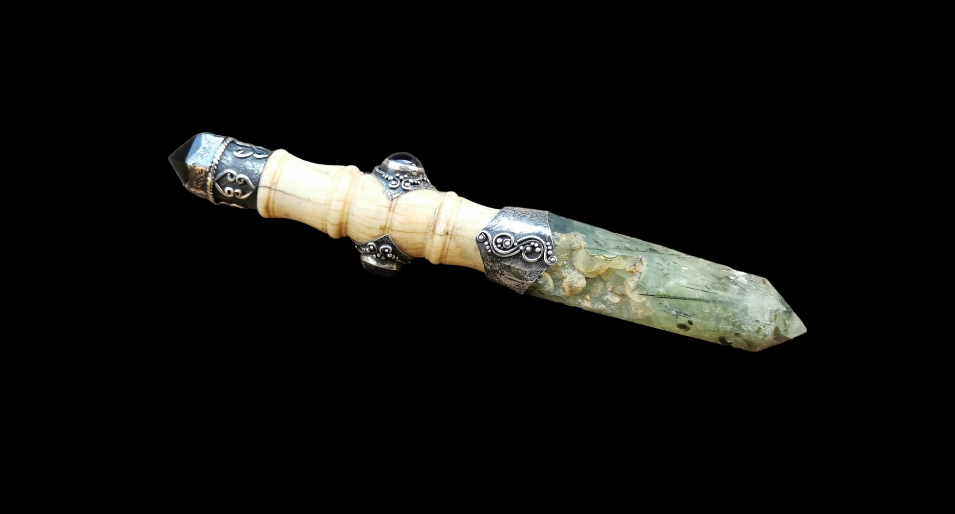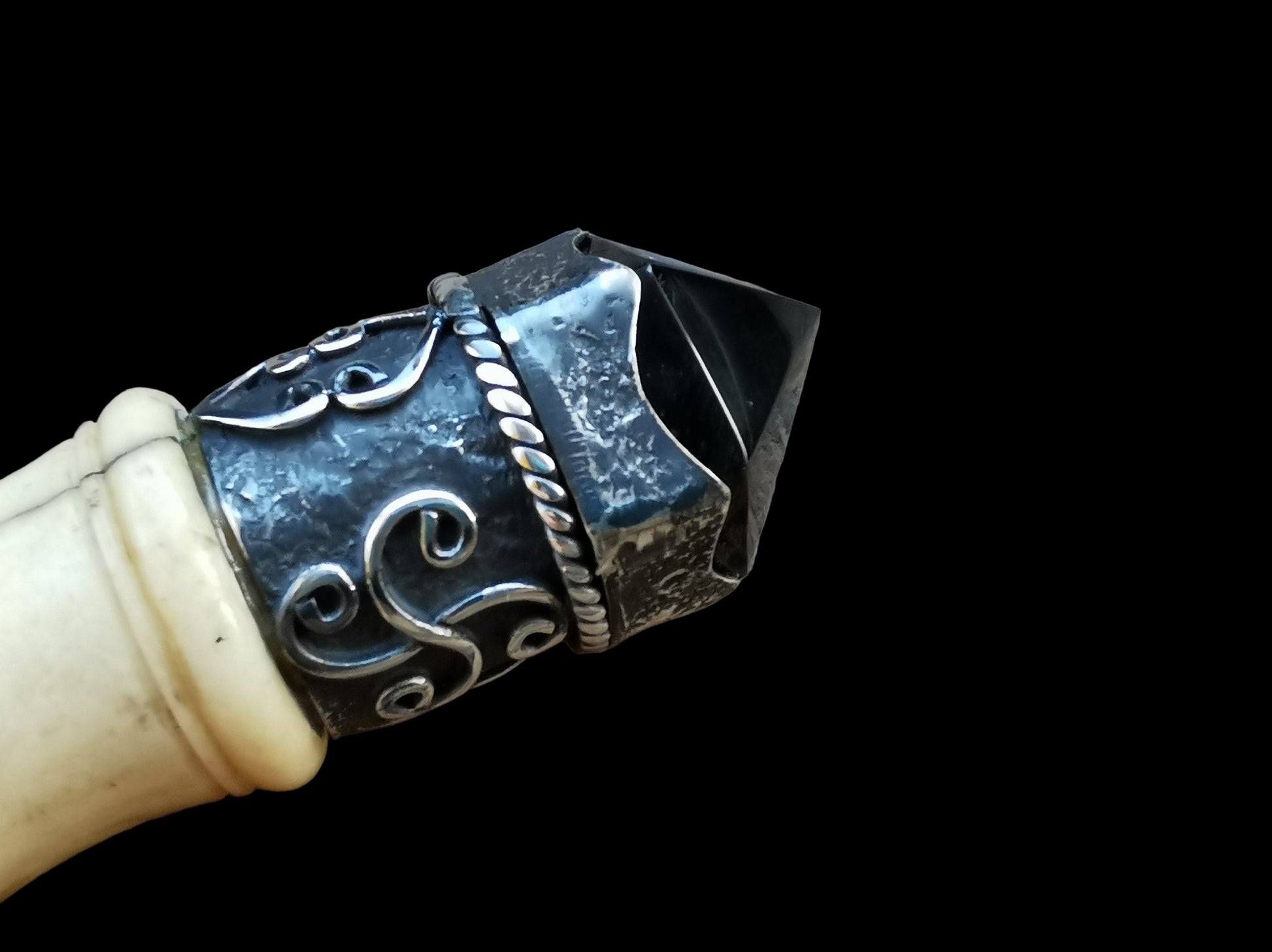 Ref.WD0514 - Silver wand with bone carved antique corkscrew as handle, obsidian, amethyst, and prehnite gems.