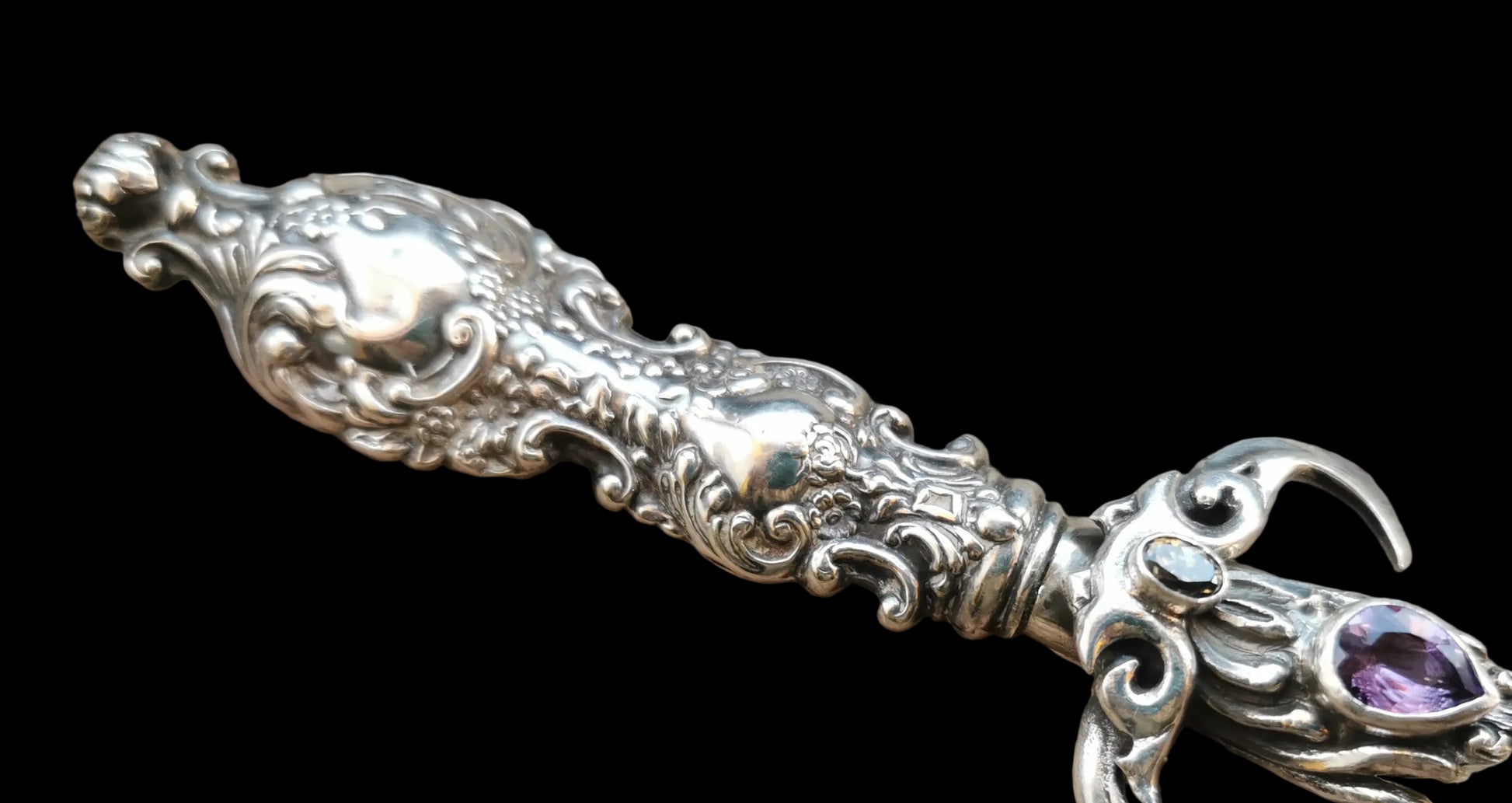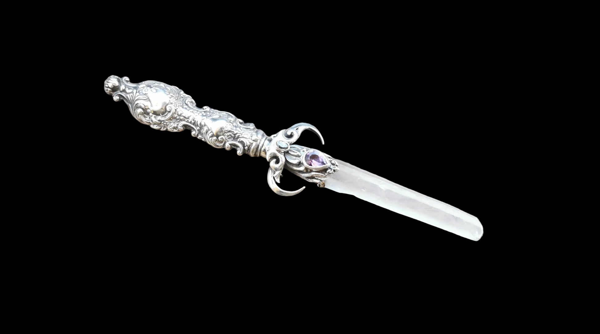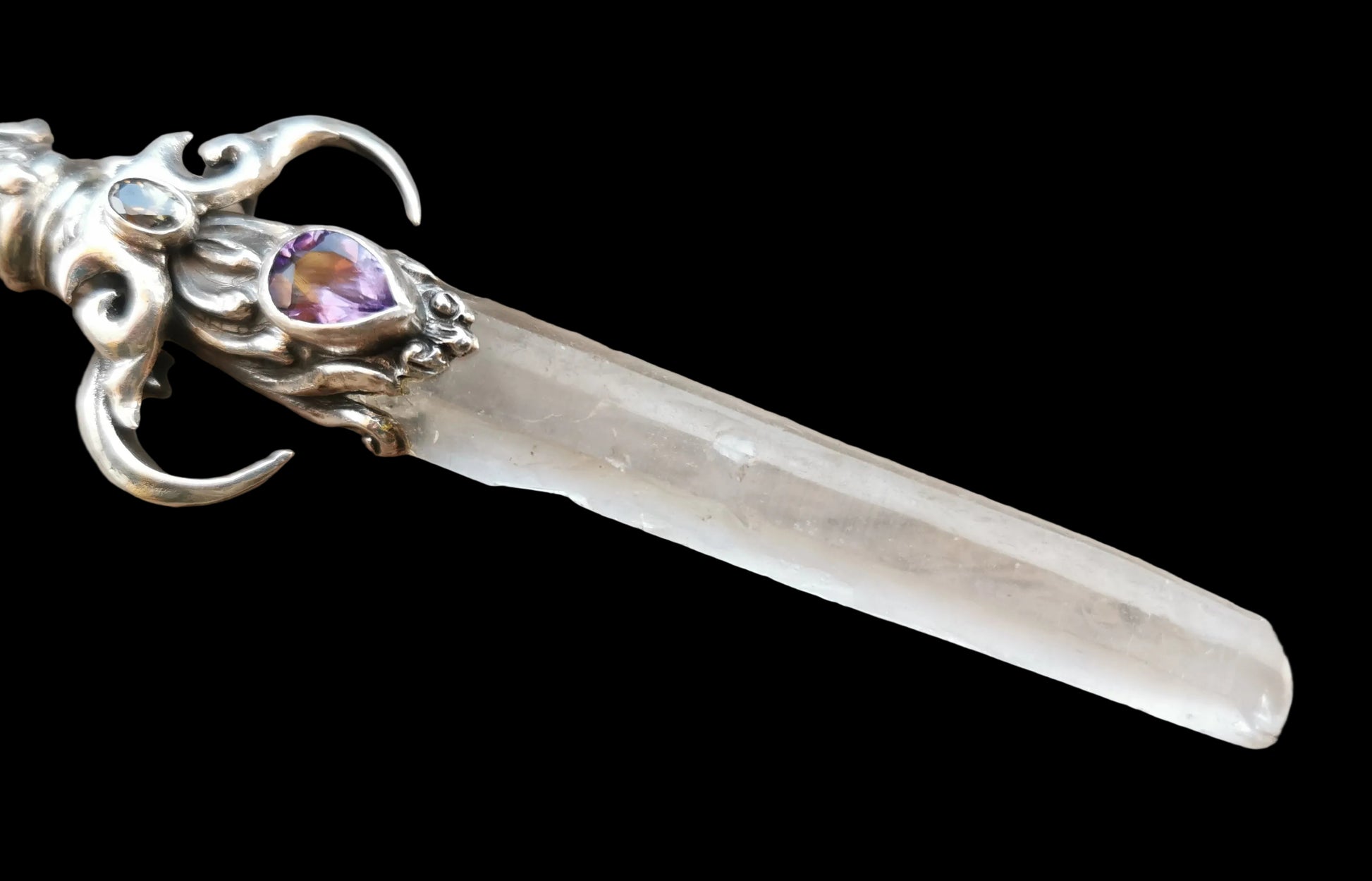 Ref.WD0516 - Silver wand with handle sourced from vintage spoon, hawk claws as guards, laser quartz crystal, amethyst, and citrine gemstones.
