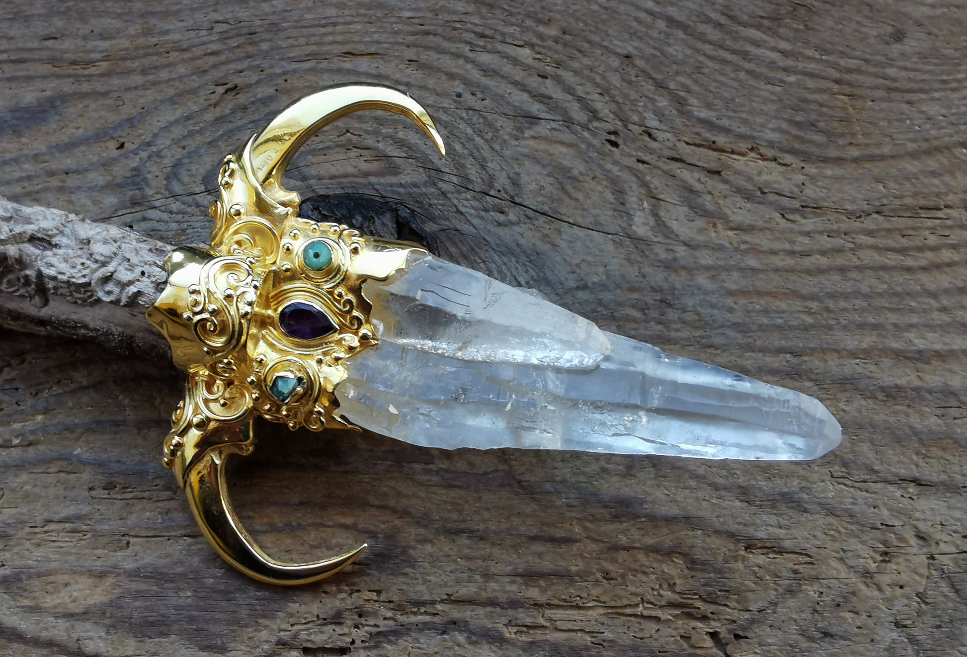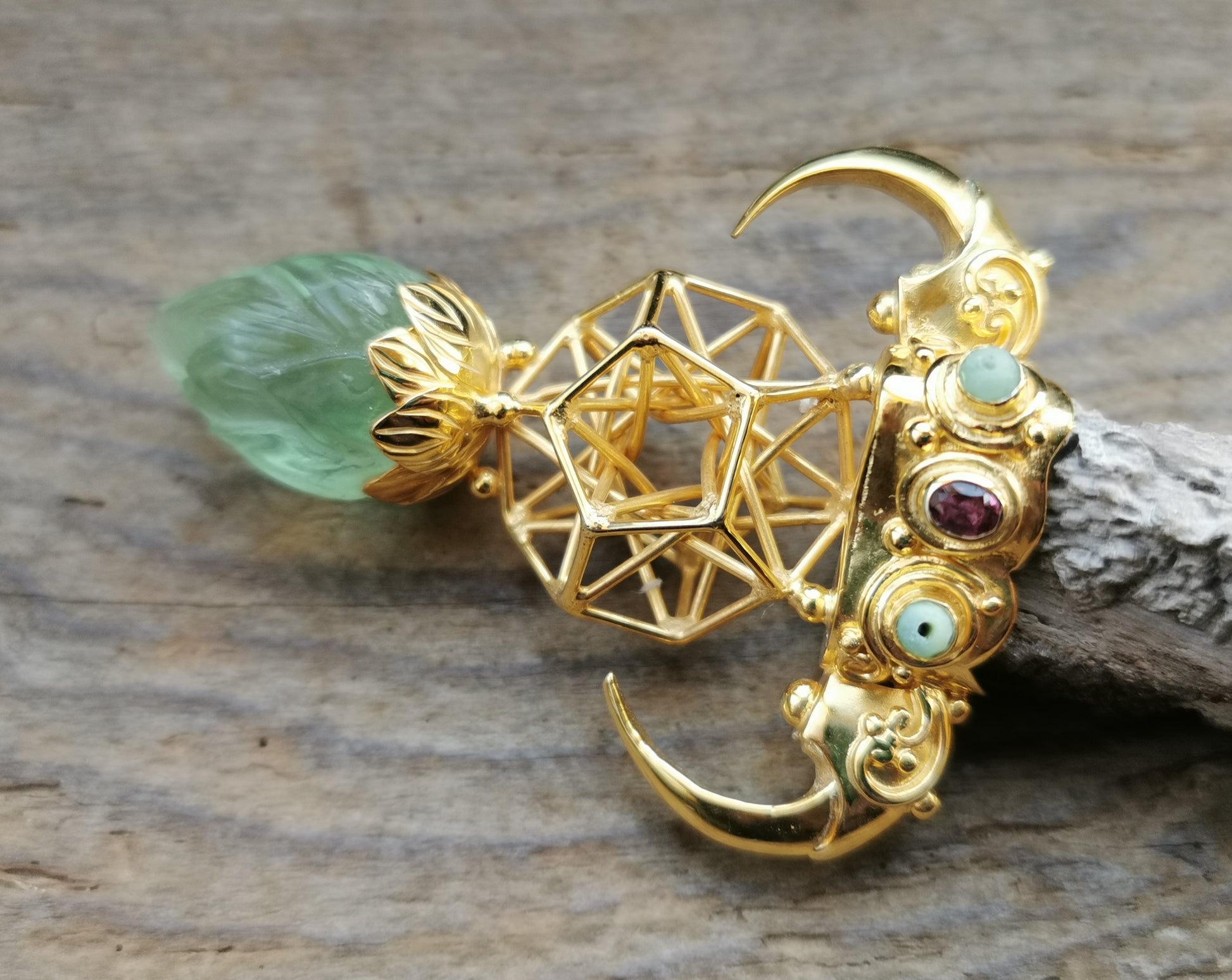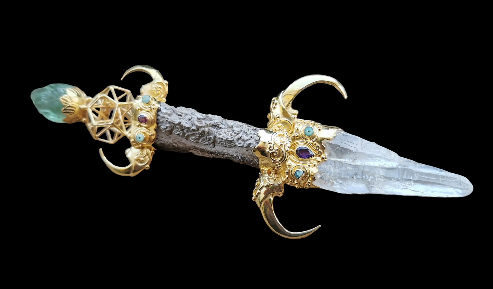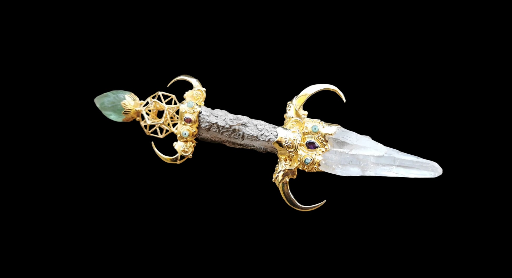 Ref.WD0518 - Gold plated on silver wand with 5D Hyper Dodecahedron geometry, lotus bud flower as pommel, Javanese fossilized wood as handle, hawk claws as guards, laser quartz crystal, tourmaline, and garnet gemstones.