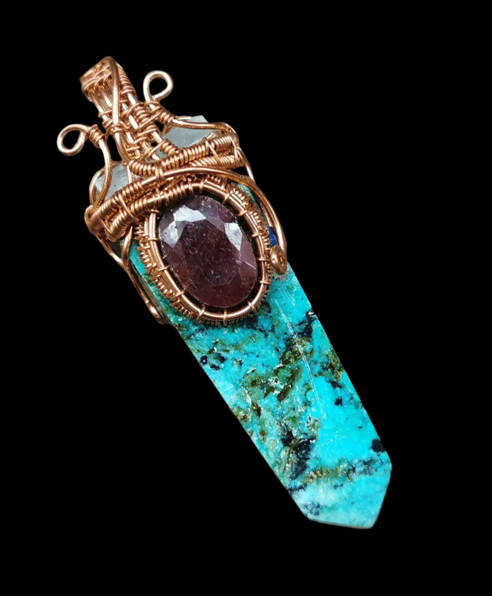 Ref.WW0105 - Wire wrap pendant with pyrite, azurite, ruby, and aquamarine gems.