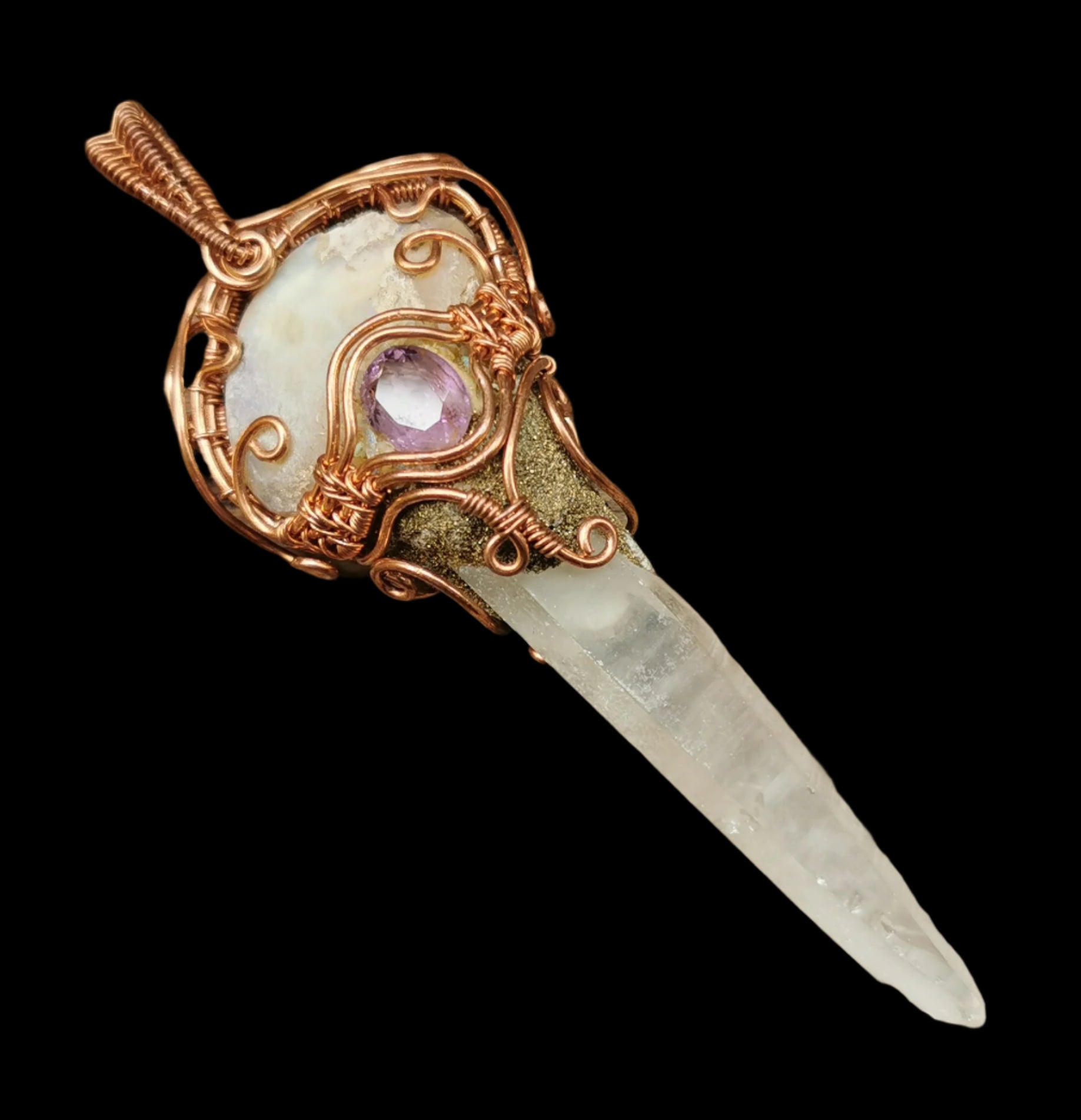 Ref.WW0109 - Wire wrap pendant with pyrite, opalized clam shell, amethyst gemstone, and laser quartz crystal.