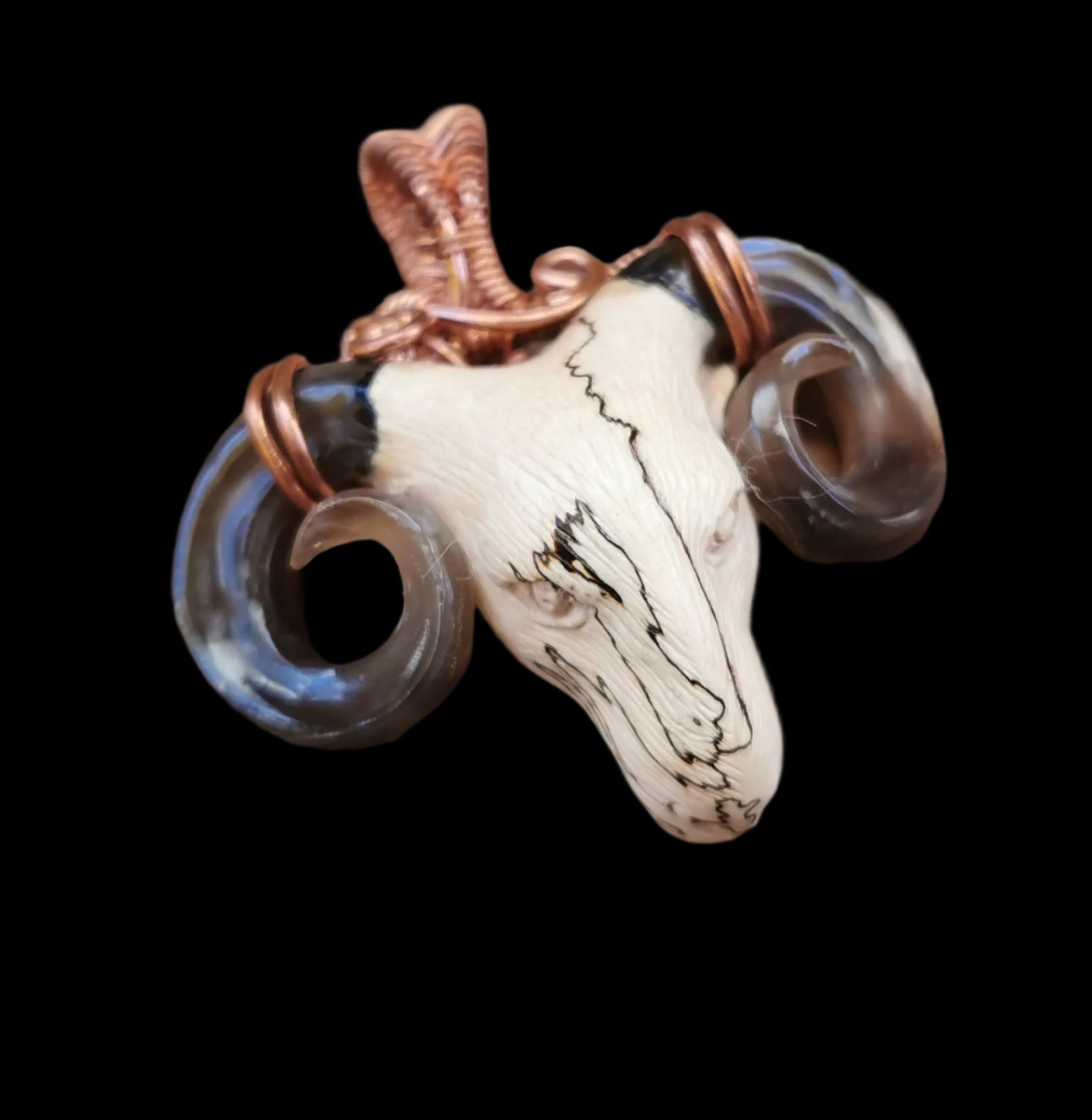 Ref.WW0112 - Wire wrap pendant with spalted tamarind carved ram head with mother of pearl carved horns.