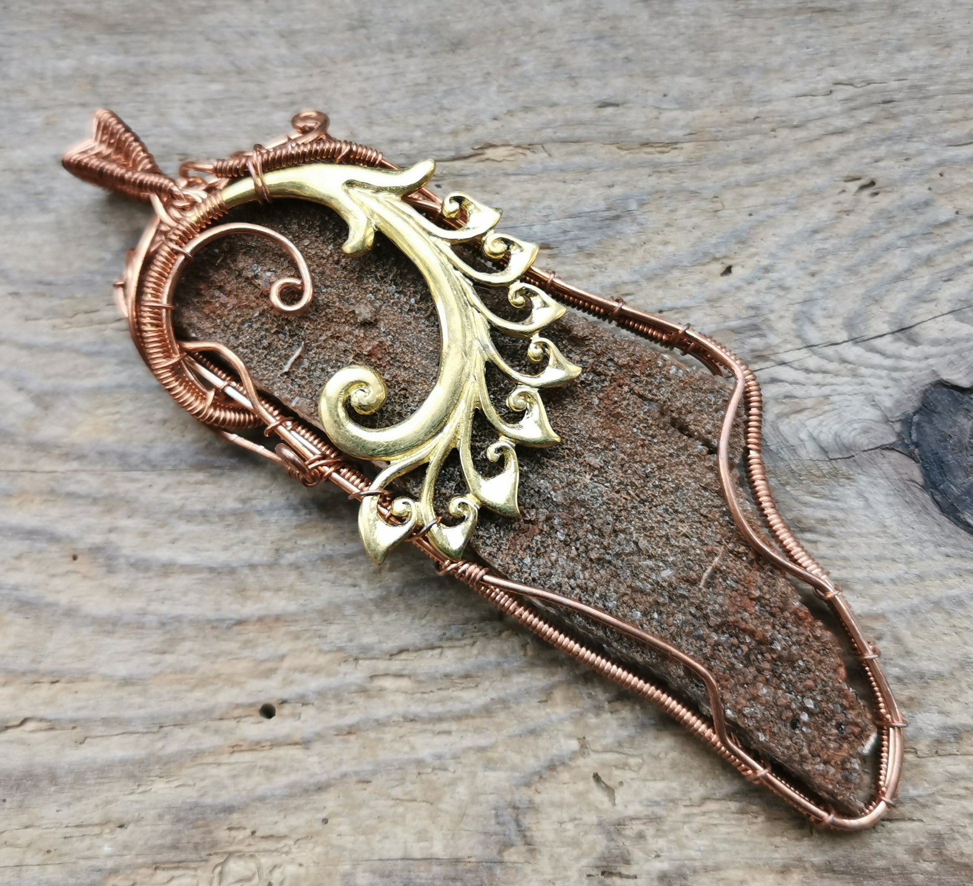 Ref.WW0133 - Wire wrap pendant with Javanese petrified wood, and brass decoration