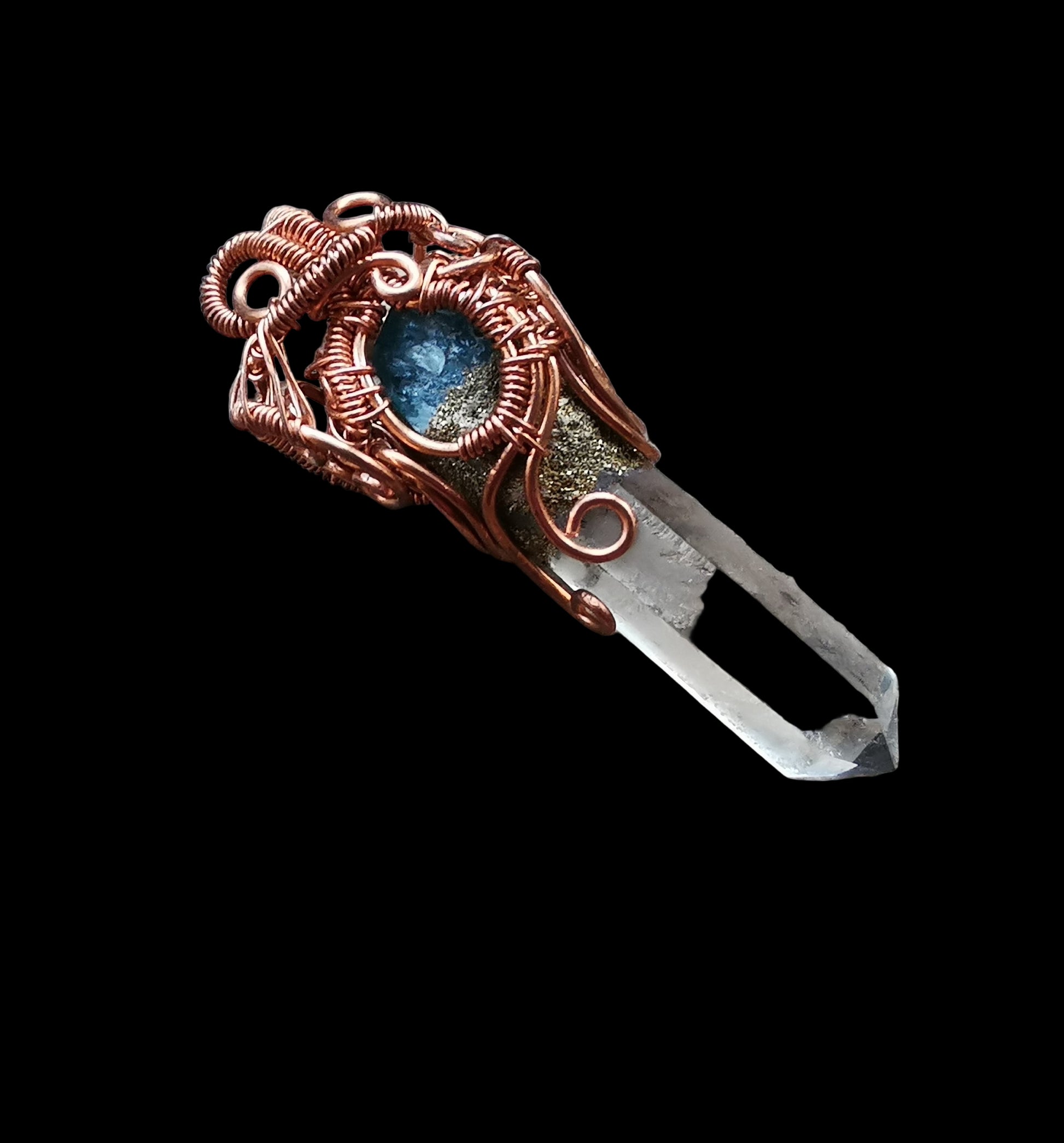 Ref.WW0138 - Wire wrap pendant with green apatite gem and laser quartz crystal