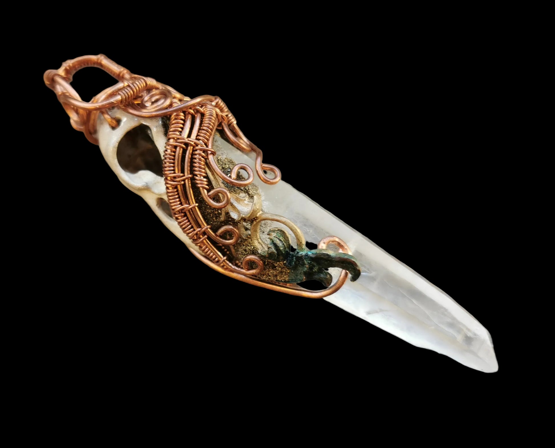 Ref.WW0143 - Wire wrap pendant with ecologically sourced deer horn carved raven skull, and laser quartz crystal.