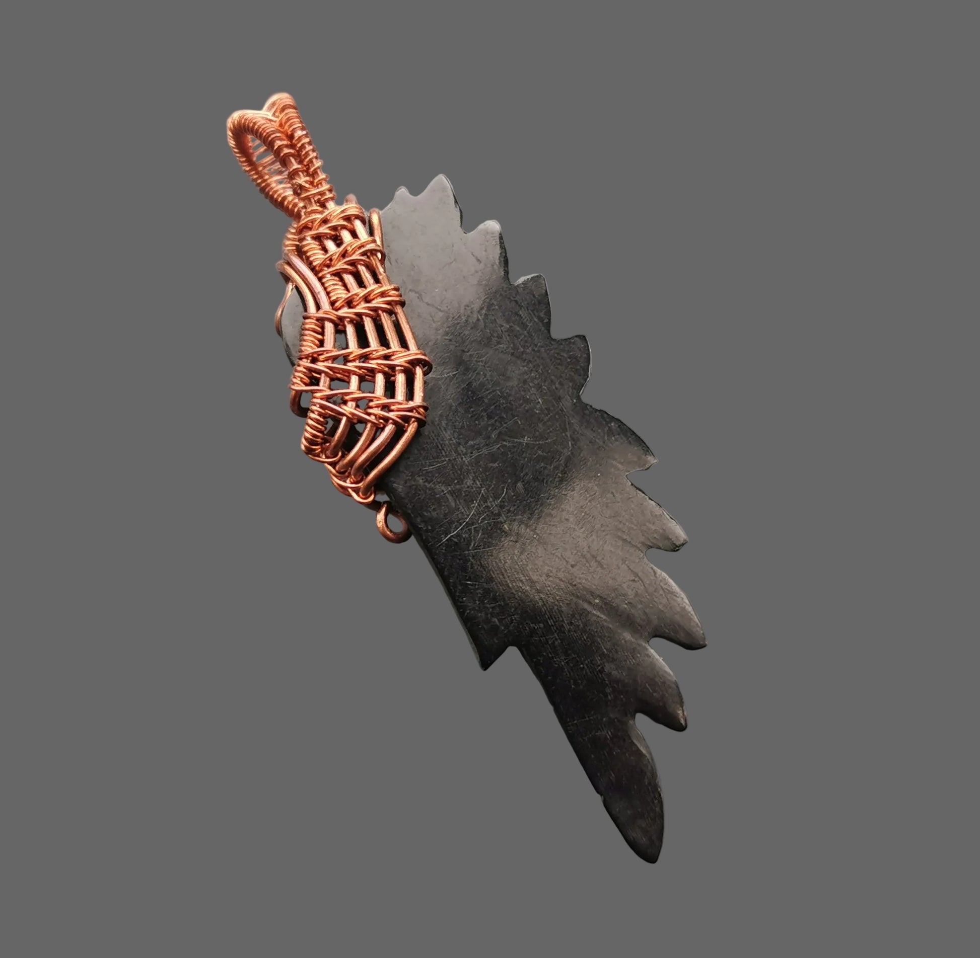 Ref.WW0166 - Wire wrap pendant with iron wood carved feather.
